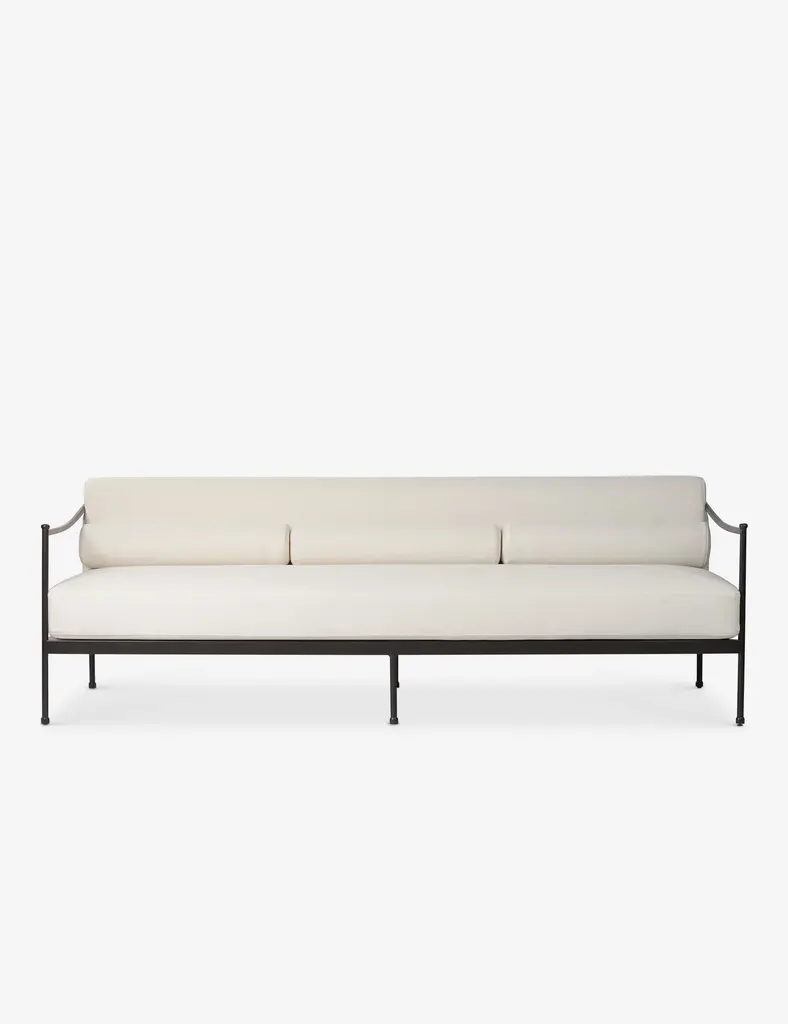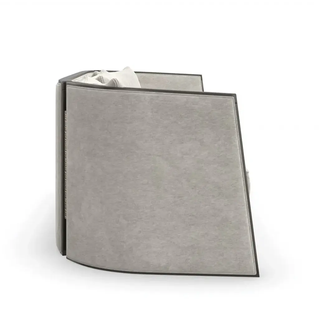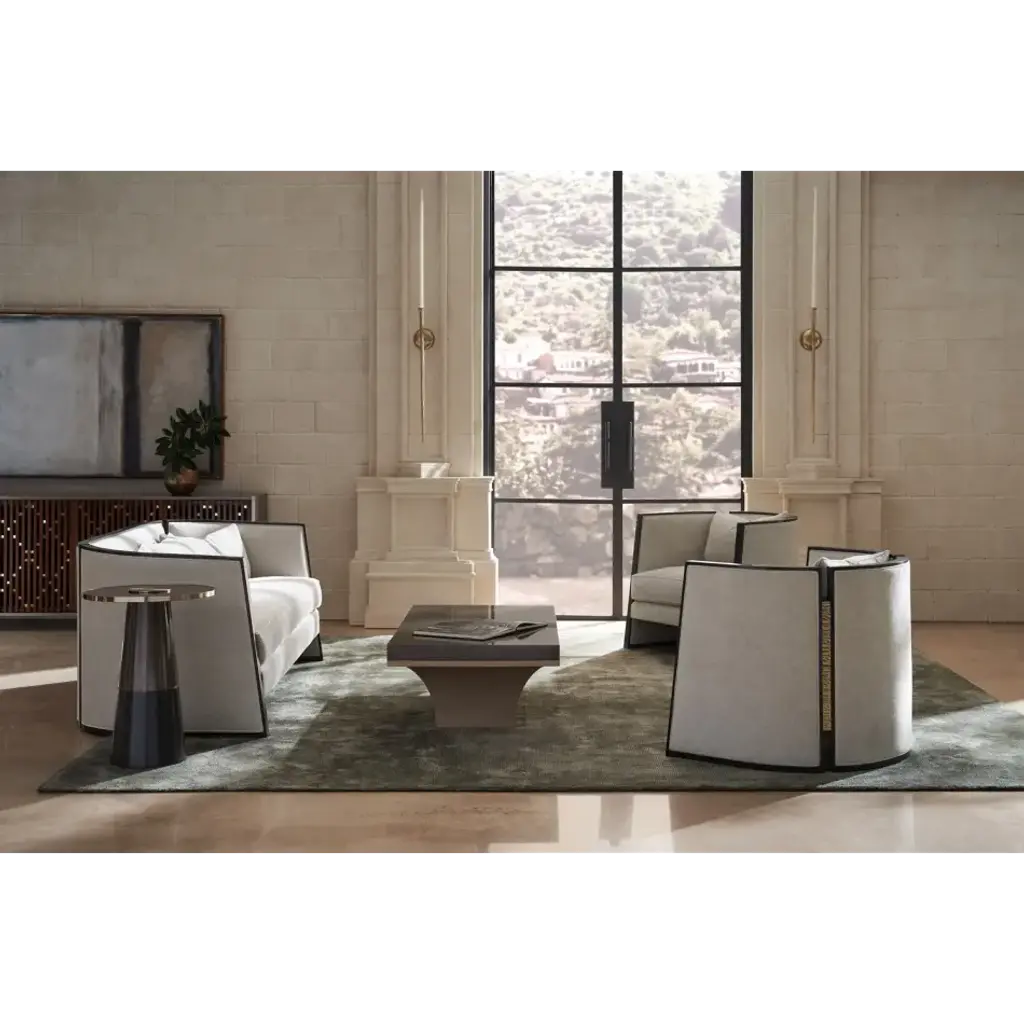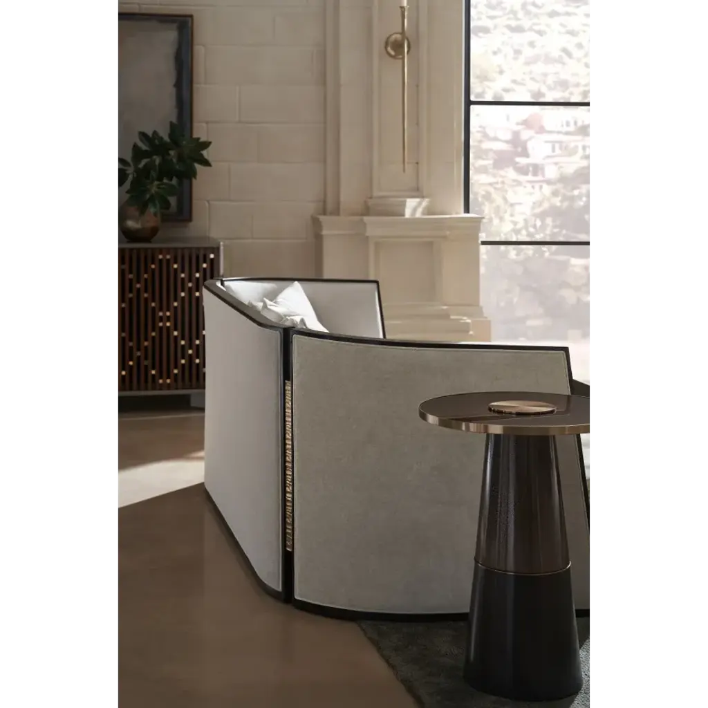 With an elegant profile, this exquisitely designed sofa is best appreciated from the side or back view. Named for the cutaway men’s dress shirt, it features textured metal inserts in Brushed Gold metal applied to vertical cuts along the outback. Inspired by a folding, three-panel screen, canted arms create a subtle taper, accentuated by exposed wood trim in a warm Seal Skin finish