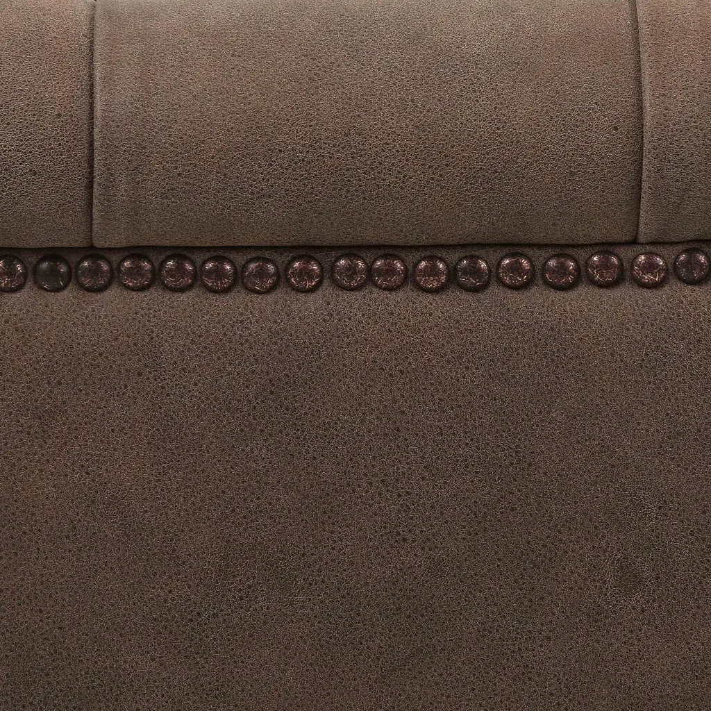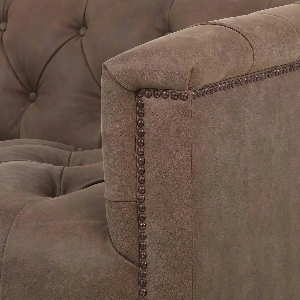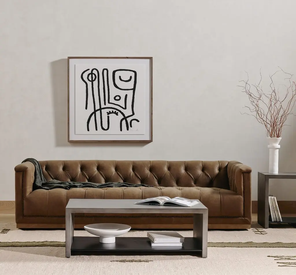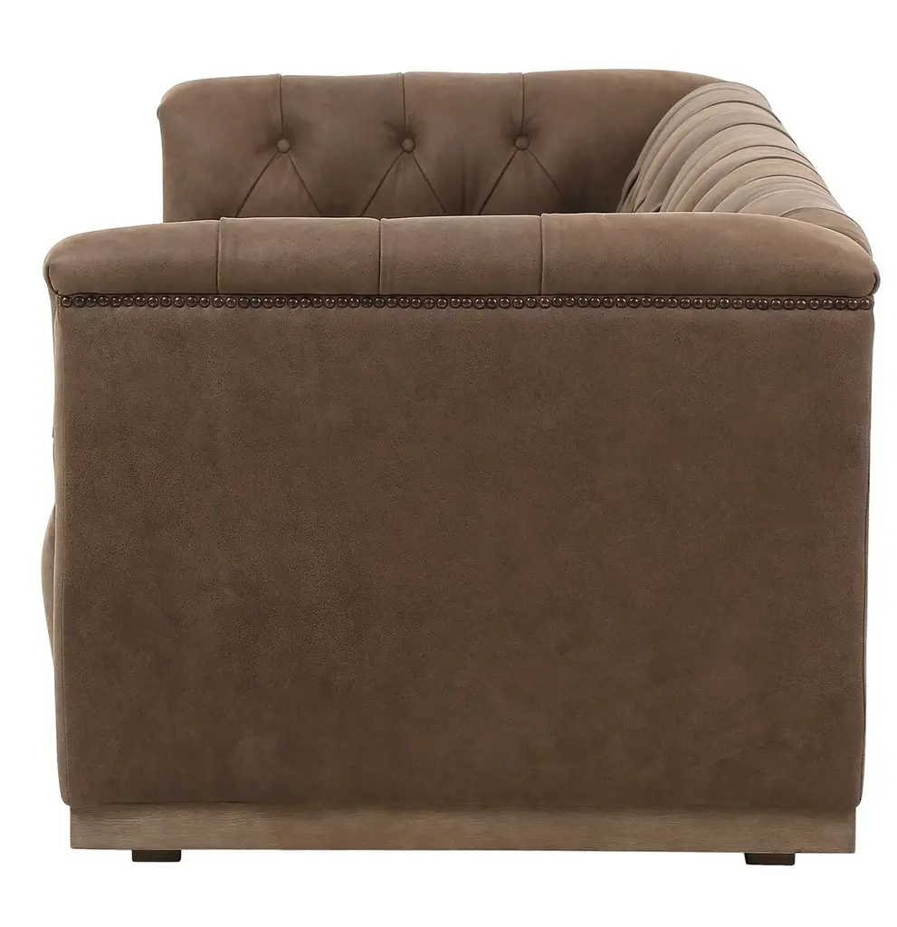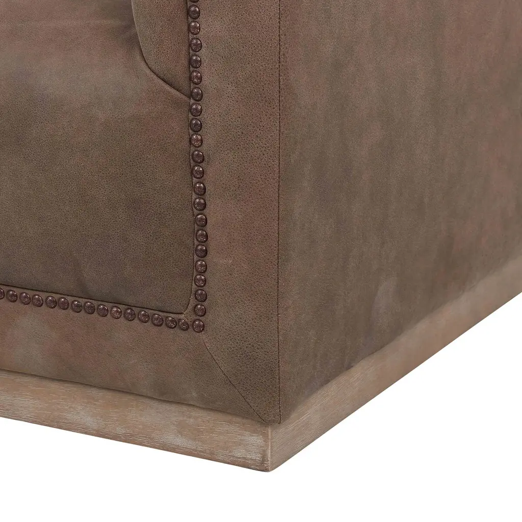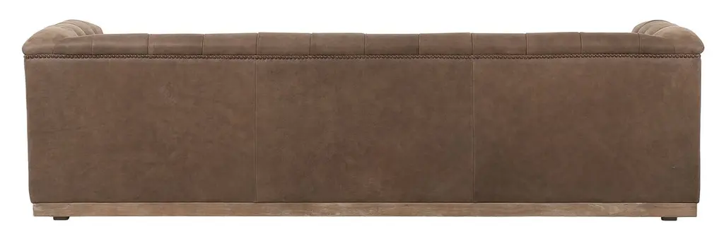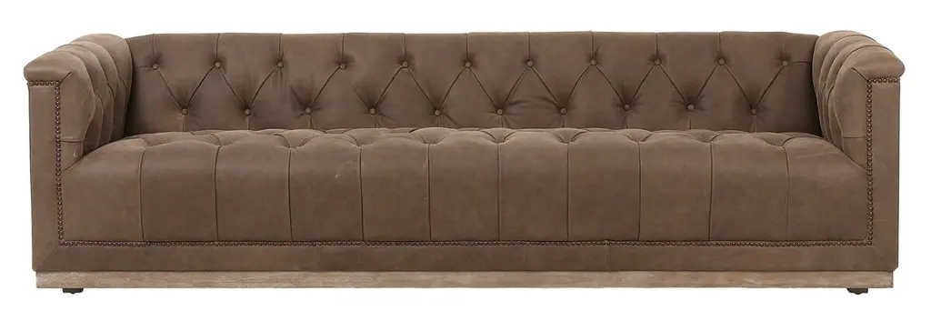 This modern take on the classic chesterfield sofa is as comfortable as it is handsome. Upholstered in gently distressed leather and boasting interior button tufting and bronze nail-head trim, it rests atop a smooth base of whitewashed parawood.