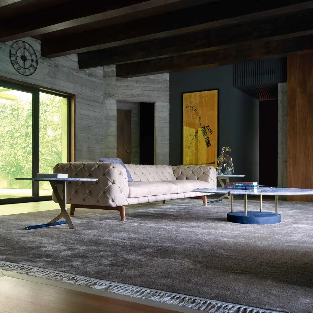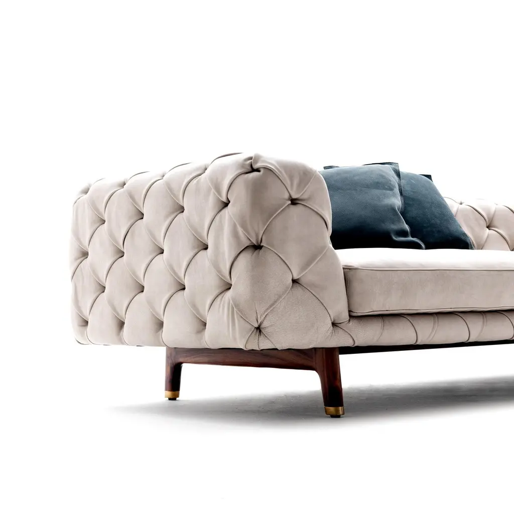 Internal structure :Solid wood and fir wood multi-ply.Cushions padding :Sitting cushions :External padding with natural, sterilized goose feathers.Internal center with memory foam and expanded polyurethane with differentdensity.Back cushions and armrests :Expanded polyurethane in different density.Upholstery:Tailor made real “capitonné” finish of back structure and arms .Item available in different types of leathers and fabrics.Base:Solid American wood, available in different finish. Metal cap at feet’s ends. This item can be customized upon request.