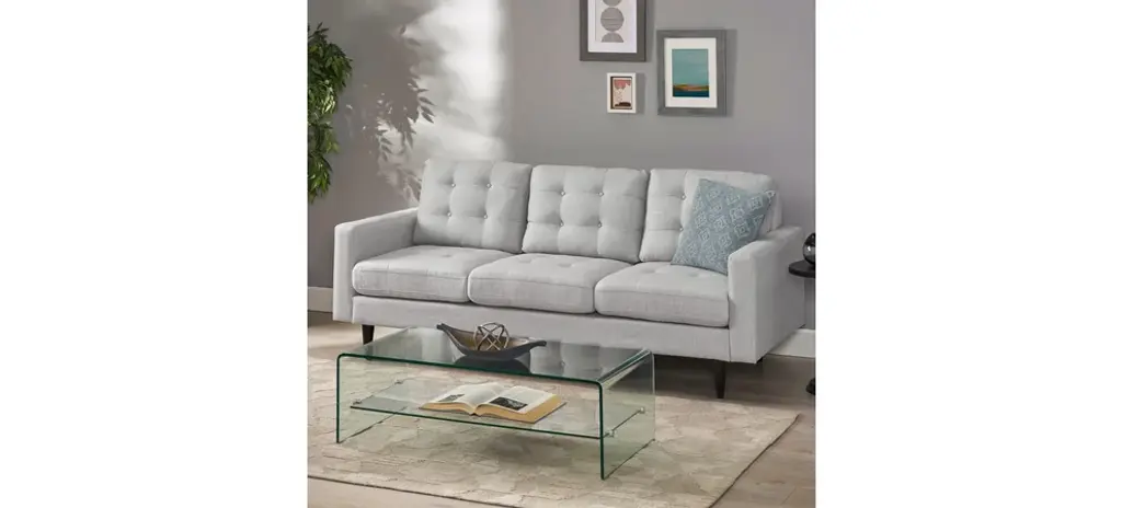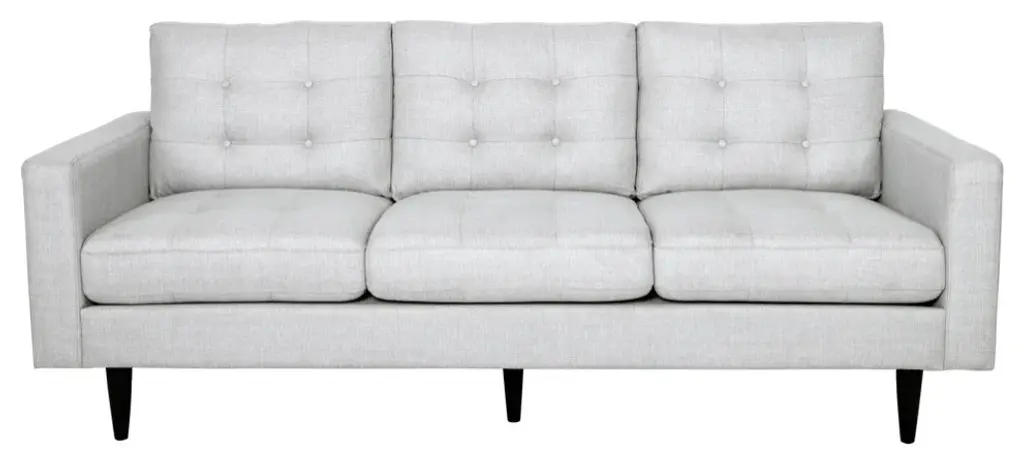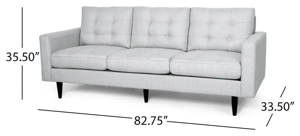 Your interior space will never be the same with our understated contemporary three-seater sofa as its centerpiece. With precise lines and neat, button-tufted waffle stitch look, this lovely sofa will effortlessly transform your living space with just the right amount of charm and an abundance of coziness. From its trendy streamlined design to its sleek tapered legs, this piece will surely become your favorite seating space to sit back and enjoy a memorable evening at home with your loved ones.CONTEMPORARY: With clean lines and beautifully tapered legs, this sofa features prominent contemporary designs. With its simple yet functional structure, this will blend seamlessly with your decor while providing ample seating space in any room.BUTTON TUFTED WAFFLE STITCH: The button tufted stitching in the sofa offers an extra touch of sophistication that enhances its contemporary design. The waffle stitch pattern adds a bit of texture without sacrificing any comfort.RUBBERWOOD: Our environmentally-friendly wood not only offers plenty of durability, but it also gives this piece a beautiful natural-grain look. Combined with a gorgeous finish, this wood will truly stand out in any room.LARGE SEATING AREA: This sofa is made to comfortably seat three people, which is perfect for family and friends. You can also lounge in a more selfish manner, enjoying all that this sofa has to offer.ASSEMBLY REQUIRED: Some assembly is required for this sofa. All of the instructions and tools needed for assembly are included.Includes: One (1) 3 Seater SofaMaterial: FabricLeg Material: Rubber WoodColor: Light GrayLeg Finish: Dark BrownHand-Crafted DetailsAssembly RequiredDimensions: 33.50 inches deep x 82.75 inches wide x 35.50 x highSeat Dimensions: 22.75 inches deep x 73.50 inches wide x 19.75 inches high