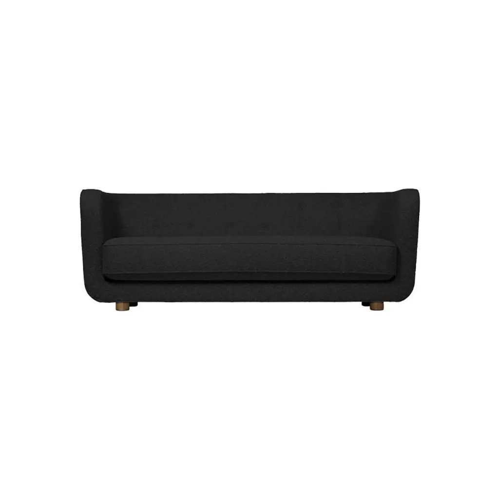 Dark grey and smoked oak Hallingdal Vilhelm sofa by LassenDimensions: W 217 x D 88 x H 80 cm Materials: textile, oak.Vilhelm is a beautiful padded three-seater sofa designed by Flemming Lassen in 1935. A sofa must be able to function in several ways. It should invite calm and contemplation. Create a private space you can hide in and at the same time invite to life and play. It must be able to withstand sitting on the backrest or on the armrests and then it must be able to stand in the middle of the room if you want to.In addition to being aesthetically beautiful and harmonious, the design makes absolute sense in relation to these parameters.By Lassen is a Danish design brand focused on iconic designs created by Mogens and Flemming Lassen, founded by Lassens’ relatives in 2008. Brothers Mogens (1901-1987) and Flemming (1902-1984) Lassen are known as two of Denmark’s greatest architects and designers. Both were renowned pioneers of Danish functionalism and modernist architecture, honoured with numerous prestigious medals and awards. Headed by Mogens Lassen’s grandson Søren Lassen, by Lassen carries on the brothers’ design philosophy by manufacturing their iconic designs as well as products by other designers that complement the Lassen’s functionalist style. The company’s mission is to continue the tradition of timelessness, functionality and quality, and to introduce the Lassen’s design heritage to new generations.