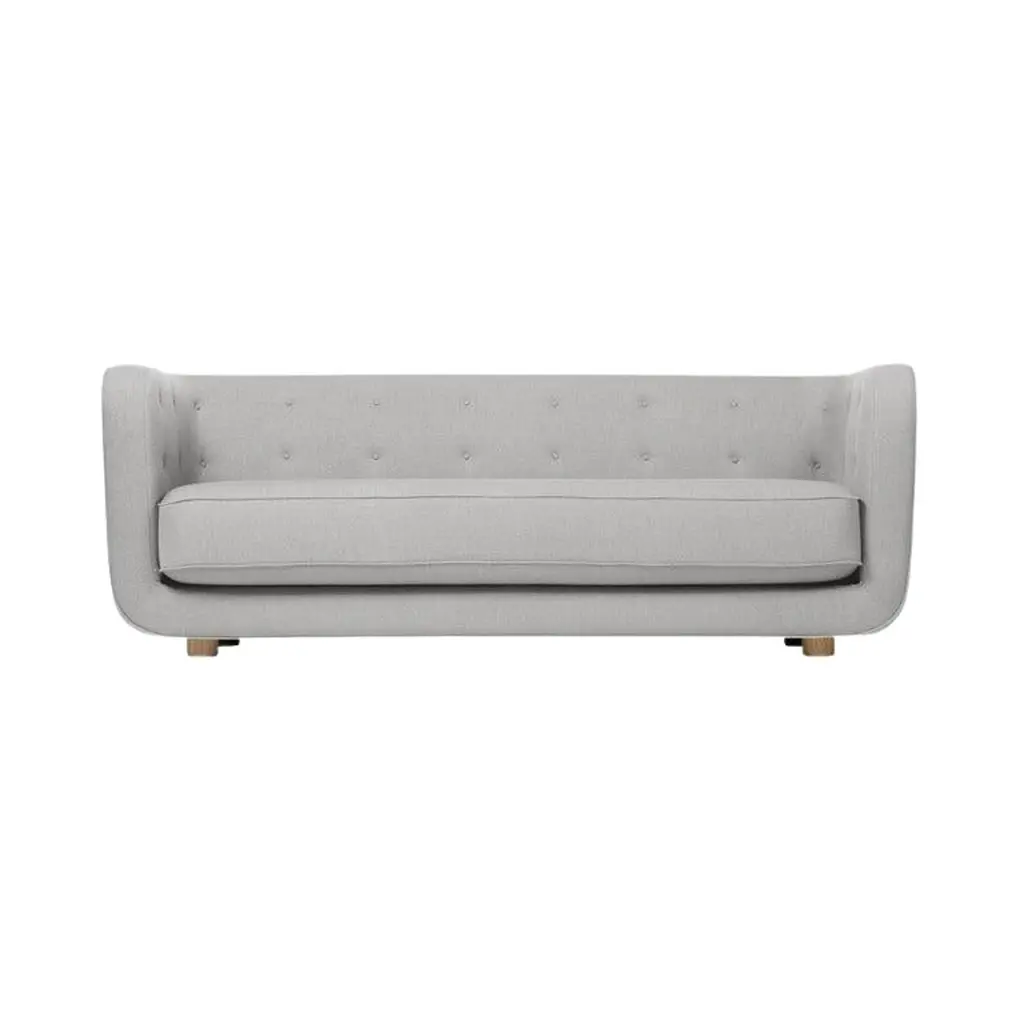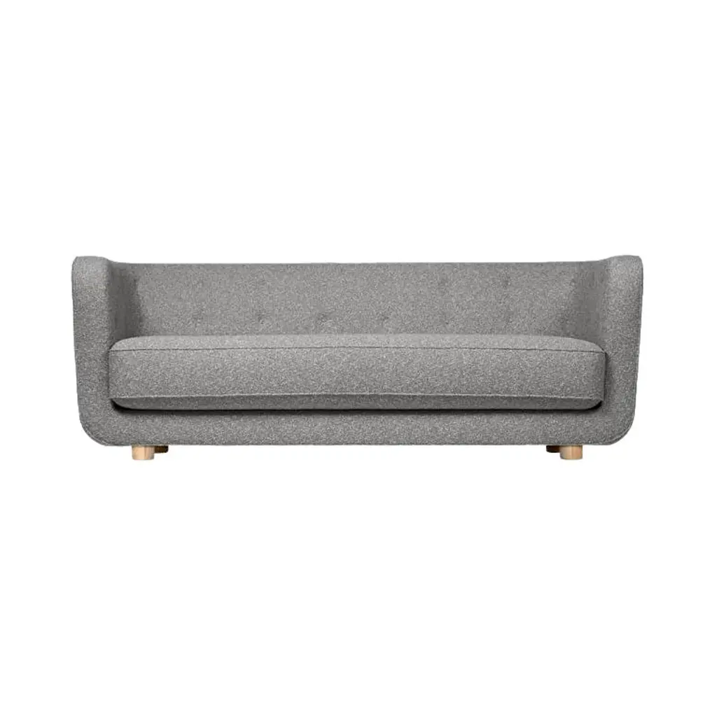 Dark grey and smoked oak Raf Simons Vidar 3 Vilhelm sofa by LassenDimensions: W 217 x D 88 x H 80 cm Materials: textile, oak.Vilhelm is a beautiful padded three-seater sofa designed by Flemming Lassen in 1935. A sofa must be able to function in several ways. It should invite calm and contemplation. Create a private space you can hide in and at the same time invite to life and play. It must be able to withstand sitting on the backrest or on the armrests and then it must be able to stand in the middle of the room if you want to.In addition to being aesthetically beautiful and harmonious, the design makes absolute sense in relation to these parameters.By Lassen is a Danish design brand focused on iconic designs created by Mogens and Flemming Lassen, founded by Lassens’ relatives in 2008. Brothers Mogens (1901-1987) and Flemming (1902-1984) Lassen are known as two of Denmark’s greatest architects and designers. Both were renowned pioneers of Danish functionalism and modernist architecture, honoured with numerous prestigious medals and awards. Headed by Mogens Lassen’s grandson Søren Lassen, By Lassen carries on the brothers’ design philosophy by manufacturing their iconic designs as well as products by other designers that complement the Lassen’s functionalist style. The company’s mission is to continue the tradition of timelessness, functionality and quality, and to introduce the Lassen’s design heritage to new generations.