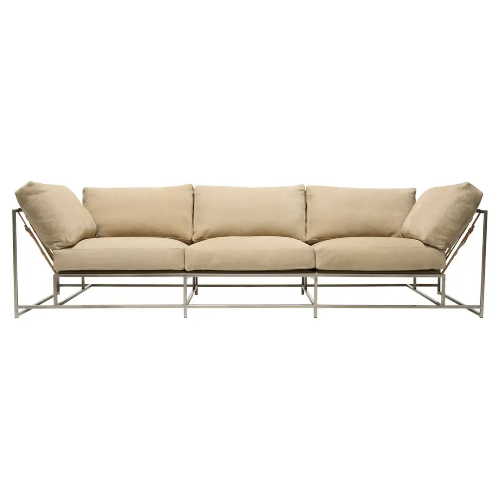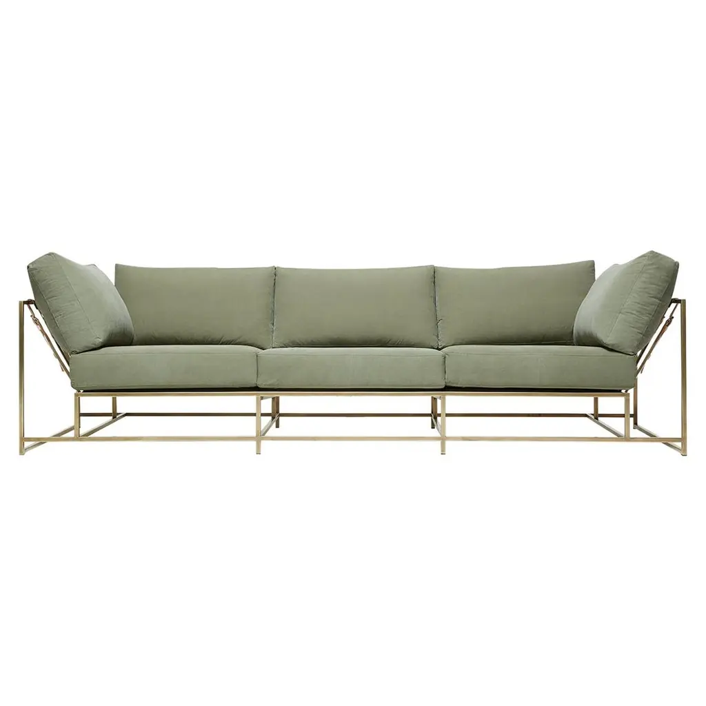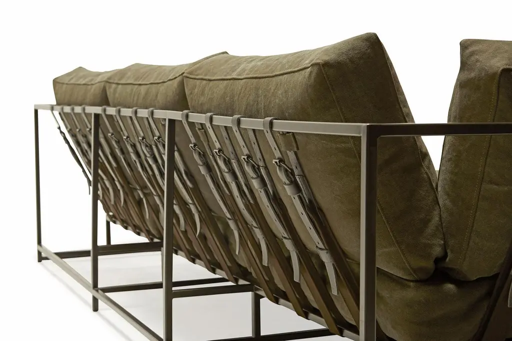 The Inheritance Sofa by Stephen Kenn is as comfortable as it is unique. The design features an exposed construction composed of three elements - a steel frame, plush upholstery, and supportive belts. The deep seating area is perfect for a relaxing lounge experience. This sofa comes with removable cushion covers to allow for easy cleaning should the need arise. Every Stephen Kenn piece is made to order through our Los Angeles studio in partnership with a number of small businesses and fabricators in the LA area. With this highly customizable sofa you can select from a wide range of finishes and materials to complement your home and lifestyle - please message us to see our Customization Guide with all available options.This version of our Inheritance Sofa is upholstered in deadstock olive canvas. The foam seat cushions have been wrapped in polyfiber for added softness and comfort. Sitting atop a blackened steel frame, the sofa is strapped with support belts featuring olive cotton webbing, black leather, and blackened steel buckles.