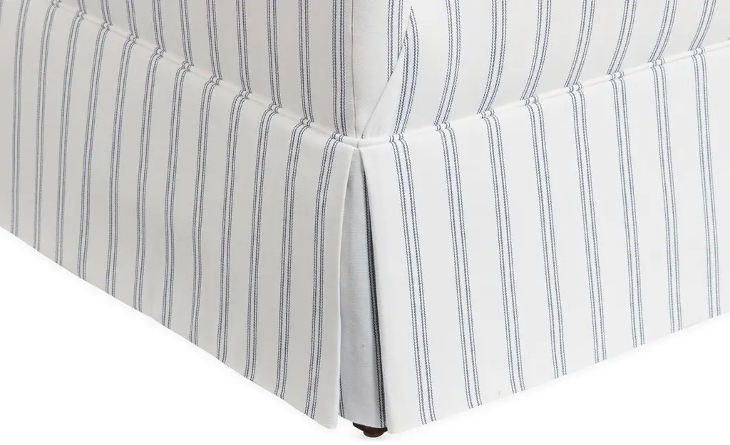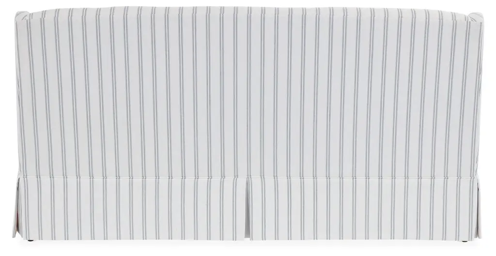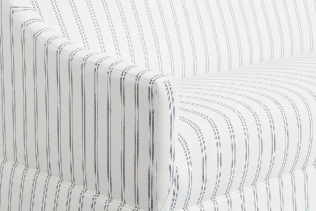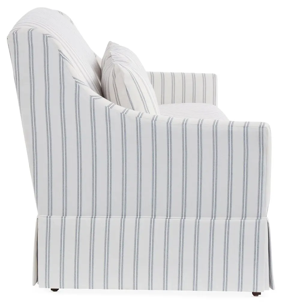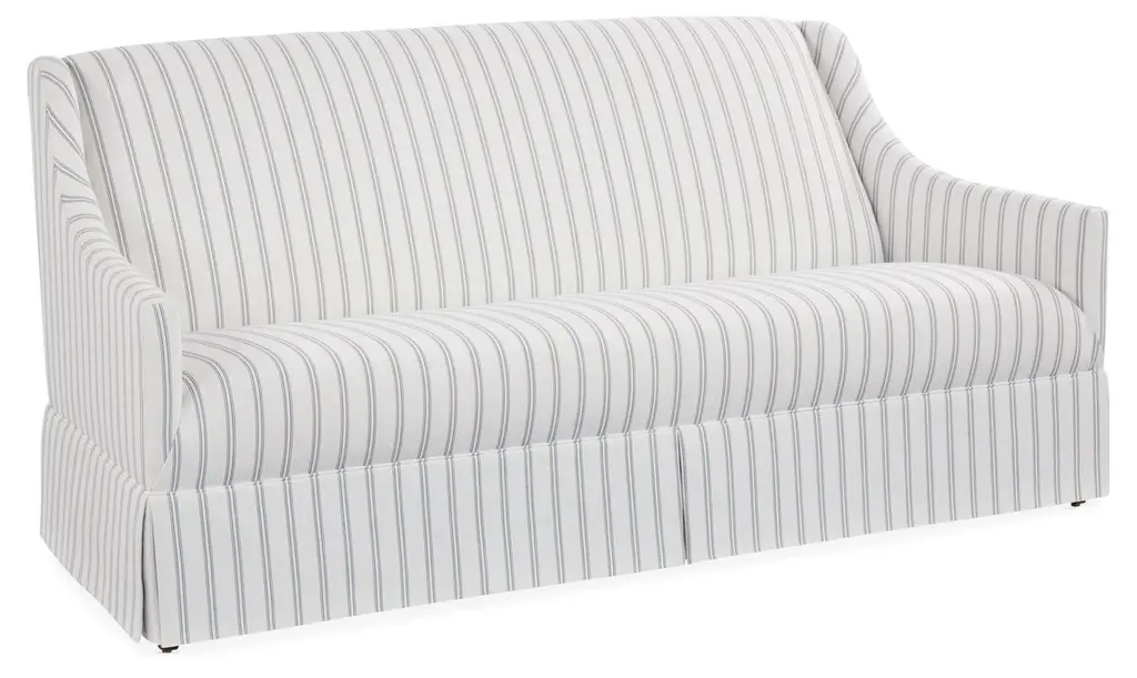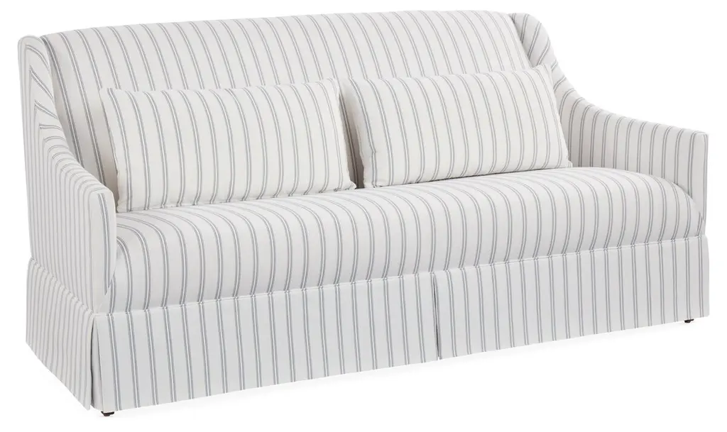 Designed by us and available only at One Kings Lane: A seamless marriage of comfort and style, this sofa boasts swooping arms, a wraparound skirt, and striped upholstery made of Crypton, an eco-friendly high-performance fabric that repels stains, spills, bacteria, and mold. Ample foam padding with a blanket of polyester fiber and fabric ticking ensures a comfortable seat. Two pillows included.