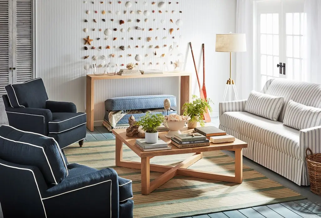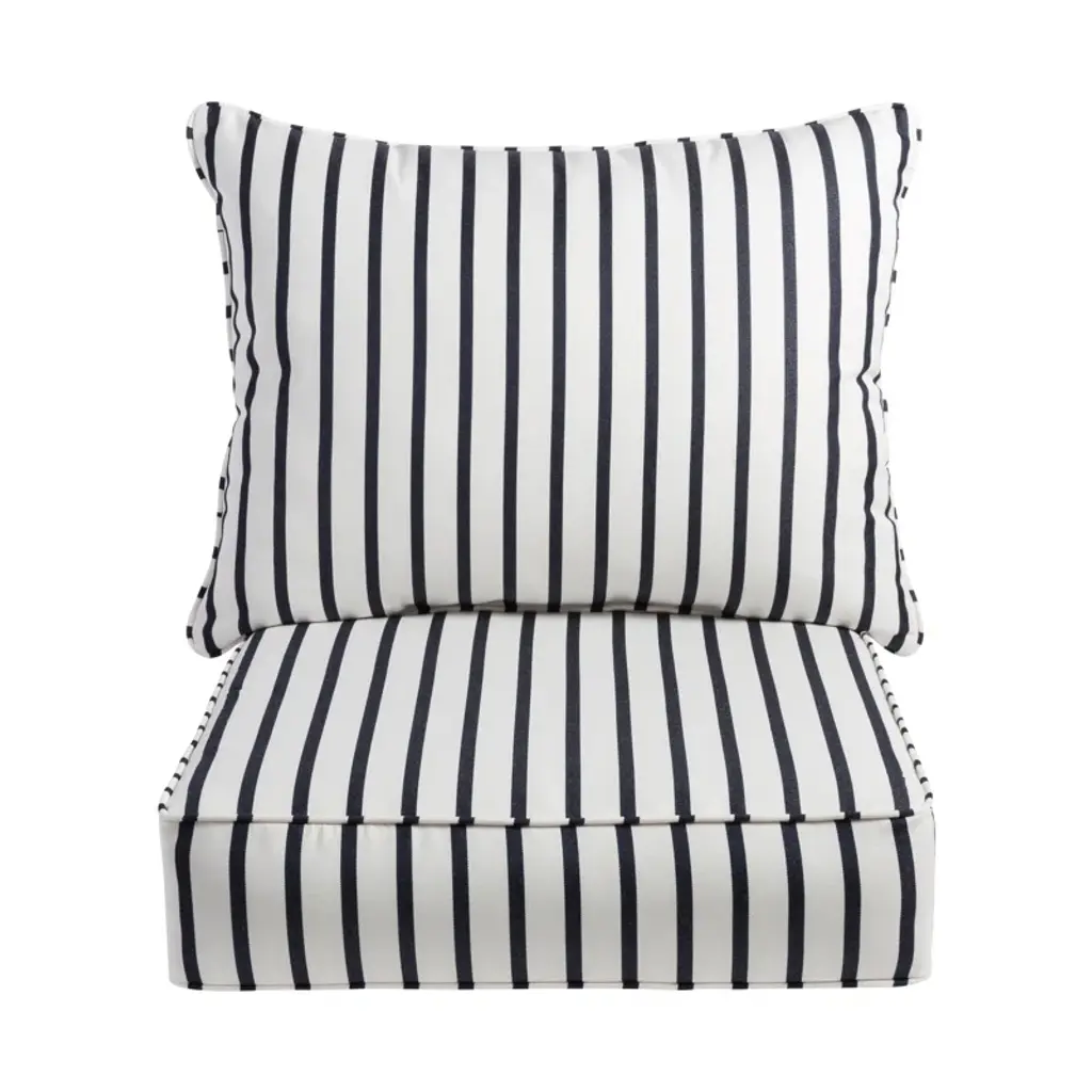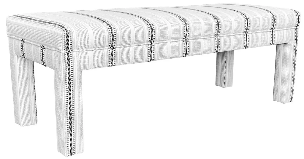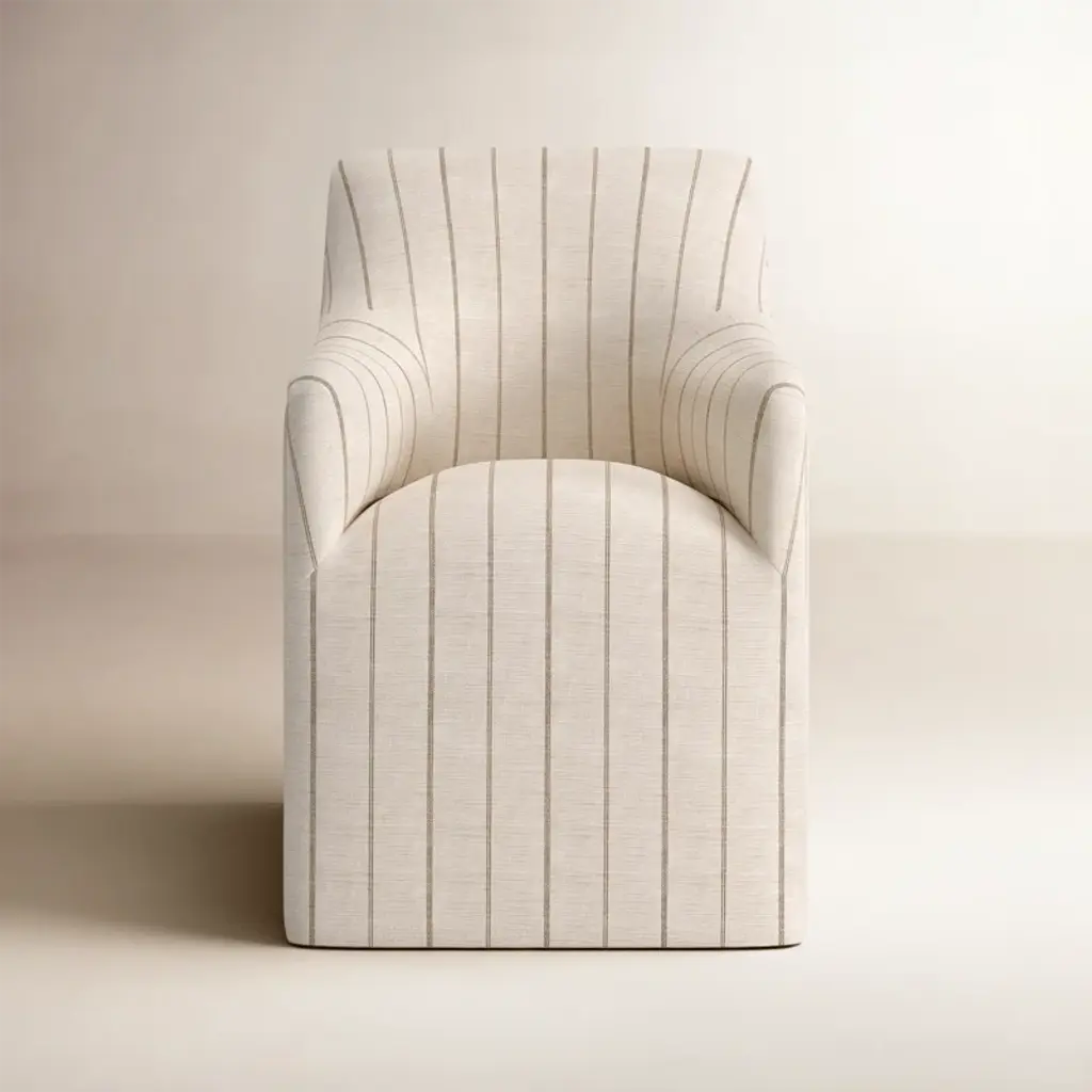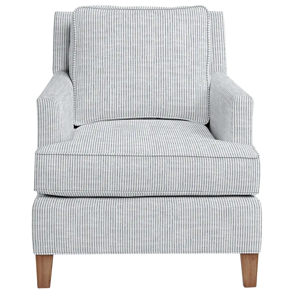 Designed by us and available only at One Kings Lane: A seamless marriage of comfort and style, this sofa boasts swooping arms, a wraparound skirt, and striped upholstery made of Crypton, an eco-friendly high-performance fabric that repels stains, spills, bacteria, and mold. Ample foam padding with a blanket of polyester fiber and fabric ticking ensures a comfortable seat. Two pillows included.