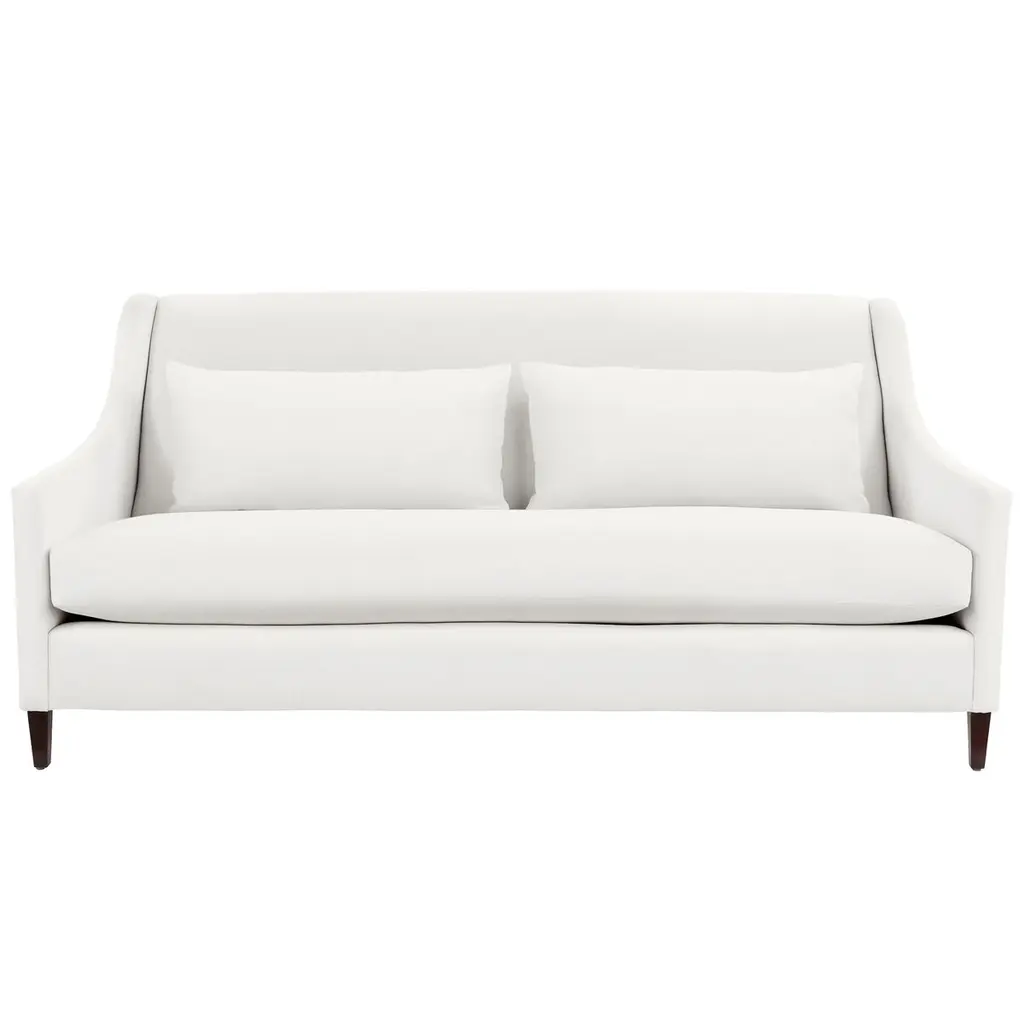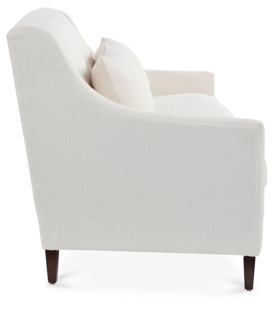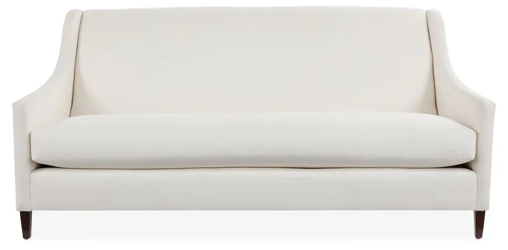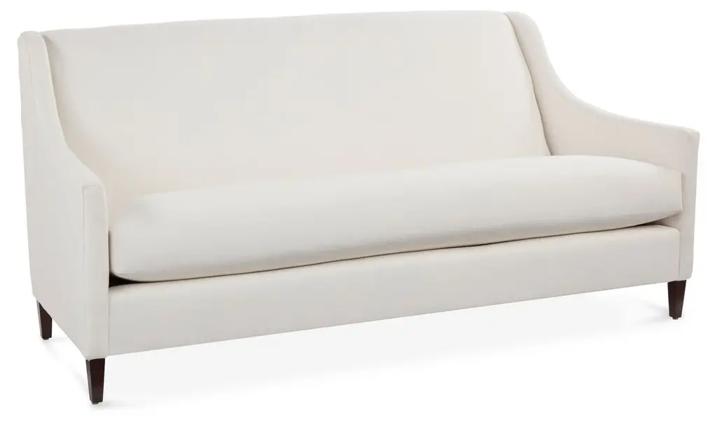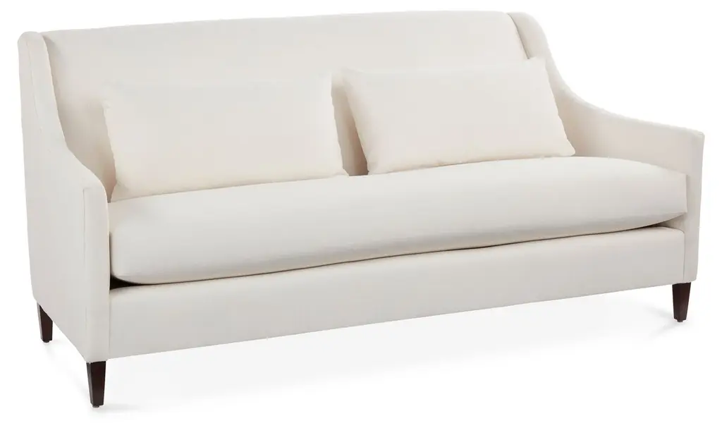 Designed by us and available only at One Kings Lane: A seamless marriage of comfort and style, this sofa boasts swooping arms, neutral-hued upholstery made of Crypton, an eco-friendly high-performance fabric that repels stains, spills, bacteria, and mold. Ample foam padding with a blanket of polyester fiber and fabric ticking ensures a comfortable seat while tapered legs with a warm finish contrast beautifully. Bench cushion and two pillows included.