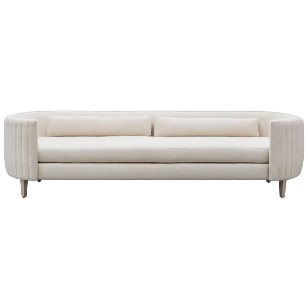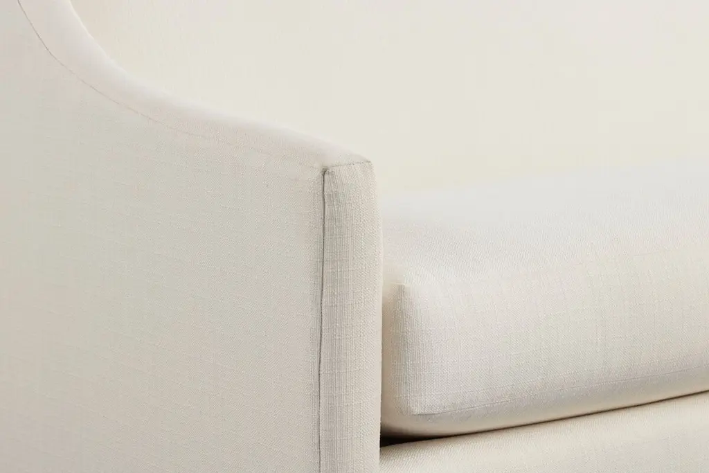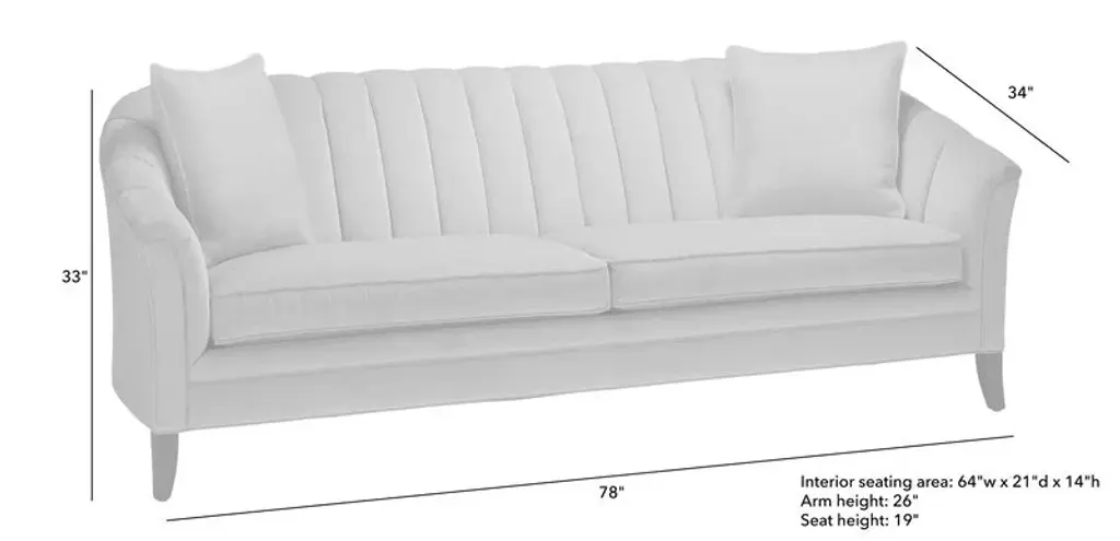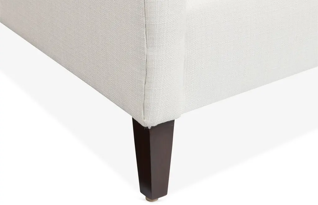 Designed by us and available only at One Kings Lane: A seamless marriage of comfort and style, this sofa boasts swooping arms, neutral-hued upholstery made of Crypton, an eco-friendly high-performance fabric that repels stains, spills, bacteria, and mold. Ample foam padding with a blanket of polyester fiber and fabric ticking ensures a comfortable seat while tapered legs with a warm finish contrast beautifully. Bench cushion and two pillows included.