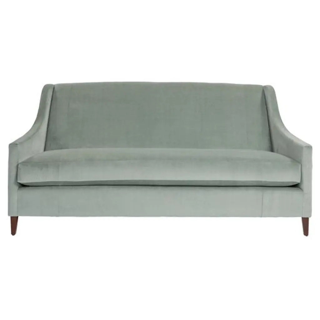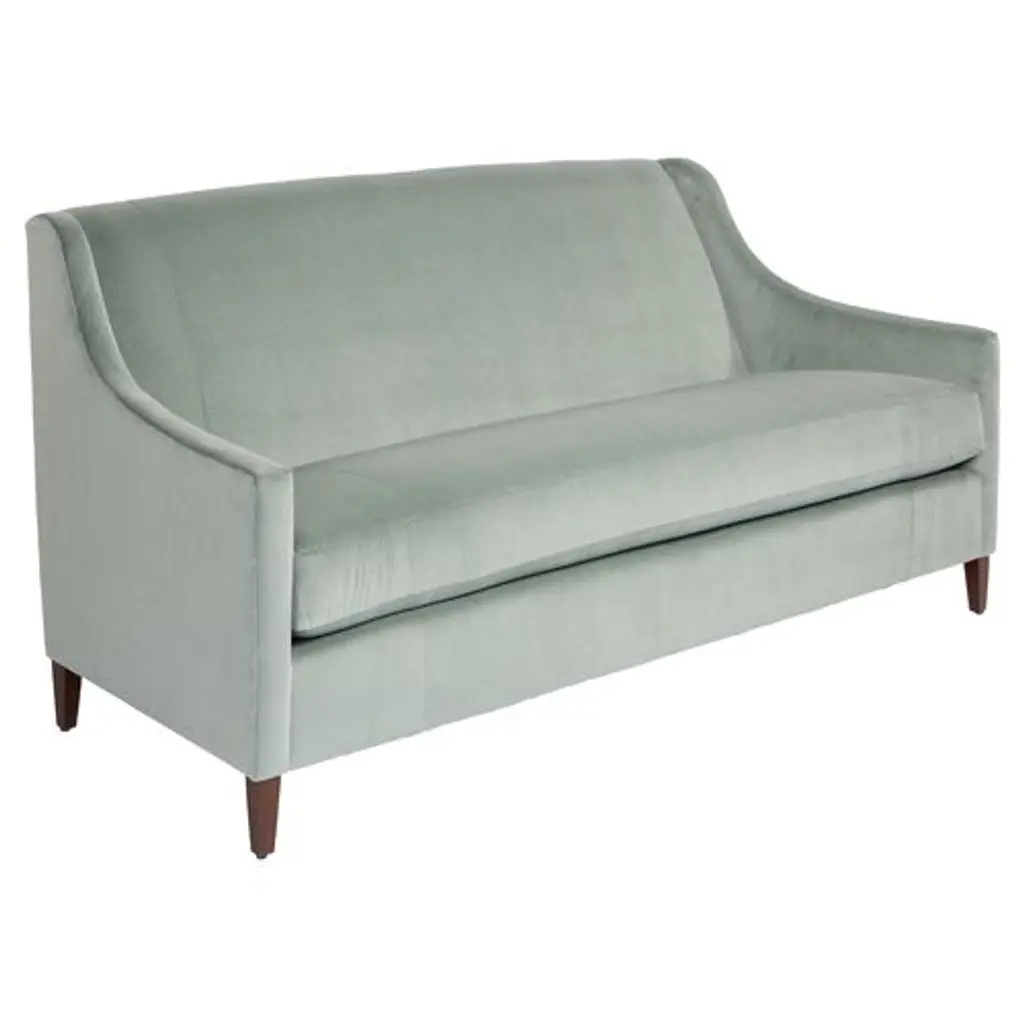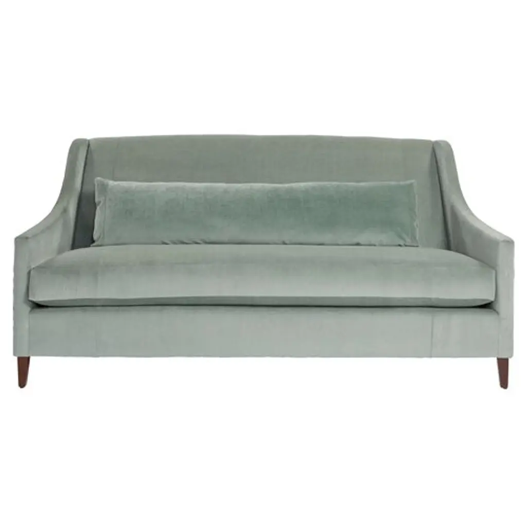 Designed by us and available only at One Kings Lane: A seamless marriage of comfort and style, this sofa boasts swooping arms, gorgeous velvet upholstery, and ample foam padding with a blanket of polyester fiber and fabric ticking. Tapered legs with a warm finish contrast beautifully. Bench cushion included.