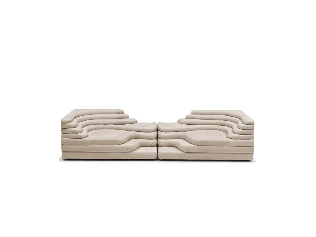 Two ingeniously designed sofa elements are the great basis for one’s own and personal interpretation of interior design and furnishing concept. The individual element is reminiscent of a terrace-like, stepped slope with different widths and depths. As in the case of the interiors of the Pop Art generation, all it takes is a single building block each on the “left” and “right” to create an inviting 2-seater sofa, a seating pyramid or a little mountain range of sofas.Please note: the price of this listing reflects 1 element. Please inquire if you are interested in different configurations or additional elements.Additional information:Material: Perla LeatherType: Nappa leather, lightly pigmentedThickness: 1.2 to 1.4 mmCharacteristics: Meticulous processing preserves the natural quality – with a characteristic pattern of creases, grain and pores. After tanning, it is dyed with a special finish to maintain the natural aura while also offering improved protection. It undergoes visible ageing, lending it an endearing patina.Dimensions: 156 W x 91 D x 70 H cmSeat height 38 cmAvailable in other upholstery options: Living, touch, naturale, club, coloral, cumulus, cirrus, velour.