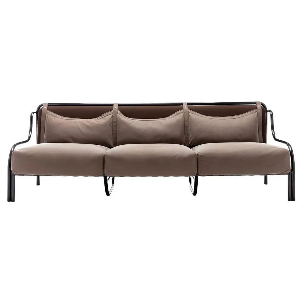 The Inheritance Two Seat Sofa by Stephen Kenn is as comfortable as it is unique. The design features an exposed construction composed of three elements - a steel frame, plush upholstery, and supportive belts. The deep seating area is perfect for a relaxing lounge experience. This sofa comes with removable cushion covers to allow for easy cleaning should the need arise. Every Stephen Kenn piece is made to order through our Los Angeles studio in partnership with a number of small businesses and fabricators in the LA area. With this highly customizable sofa, you can select from a wide range of finishes and materials to complement your home and lifestyle.This sofa comes with removable cushion covers to allow for easy cleaning should the need arise. The foam seat cushions have been wrapped in polyfiber for added softness and comfort. Sitting atop a blackened steel frame, the Two Seat Sofa is strapped with support belts featuring natural cotton webbing, cognac leather, and blackened steel buckles.