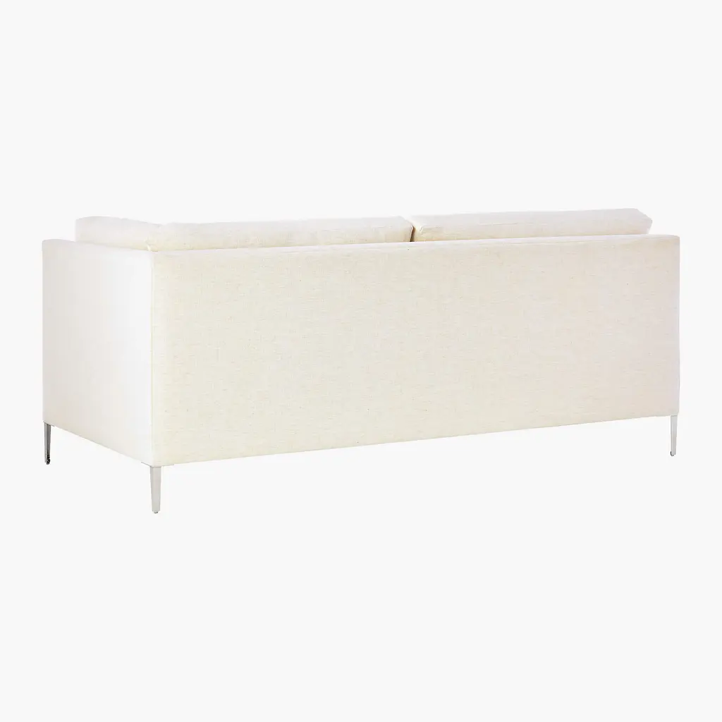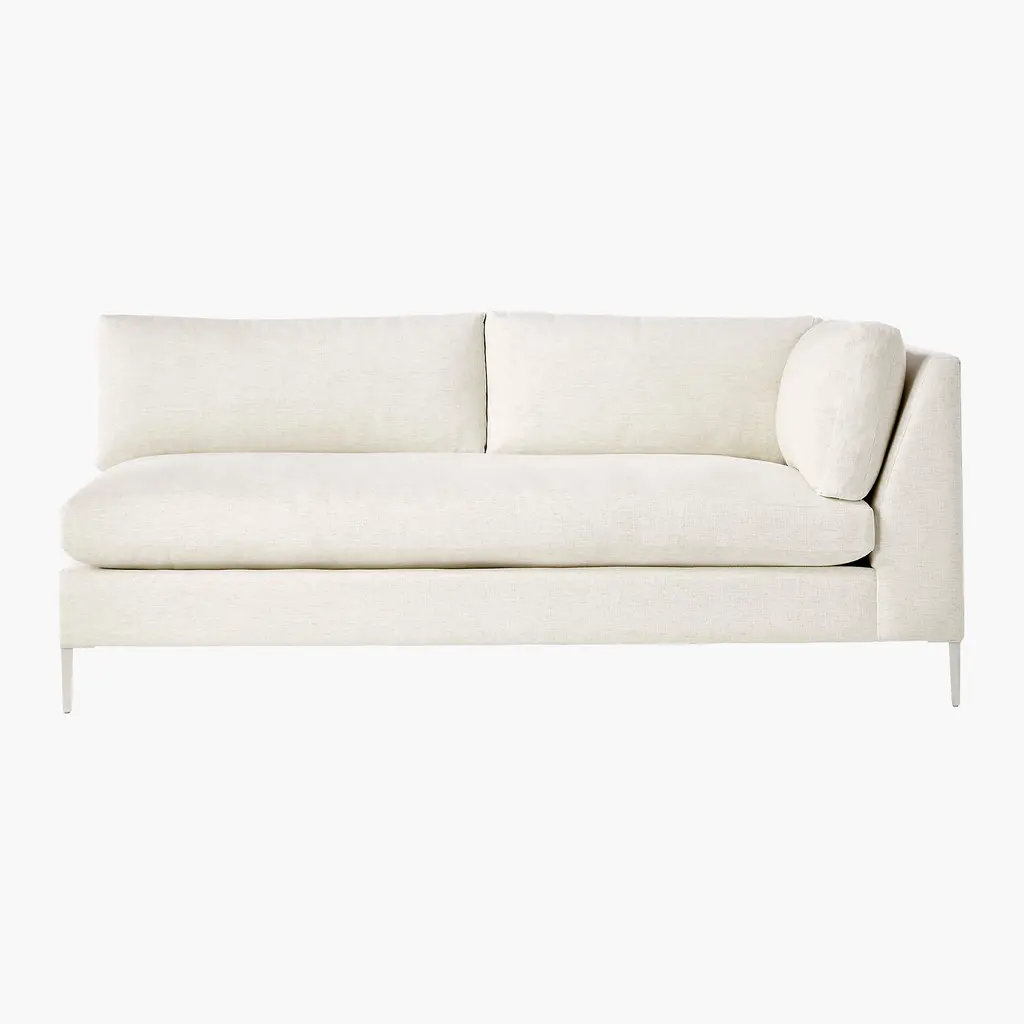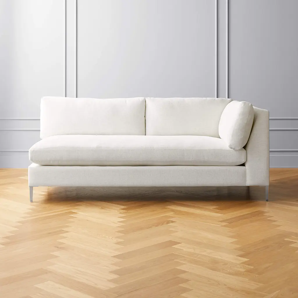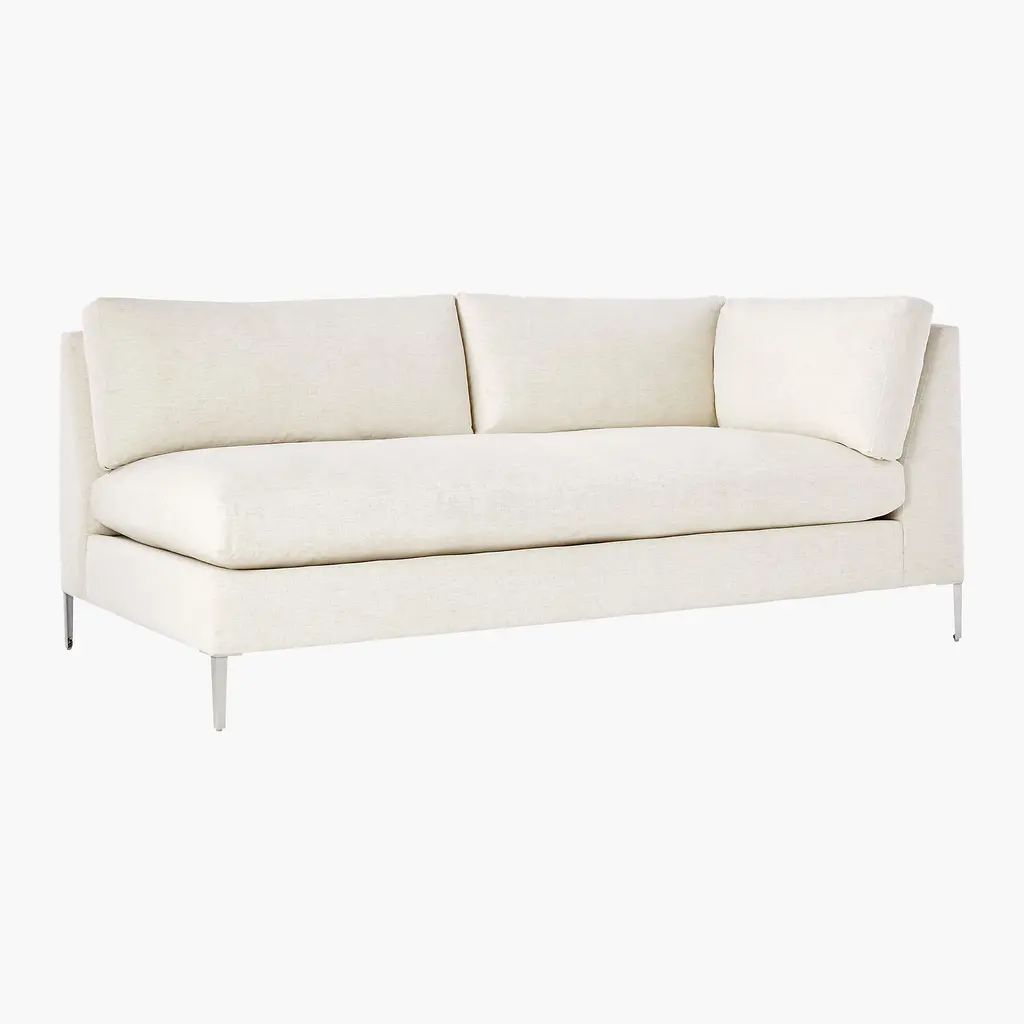 Generously scaled right-arm sofa provides extraordinary comfort. Sofa sits deep and spacious with the perfect balance of slouch and support. Cushions will continue to relax over time for a casual, comfortable look, all elevated on tapered legs that add a subtle gleam in brushed aluminum. Pair it with other Decker sectional pieces to create the optimal spot to curl up. CB2 exclusive.