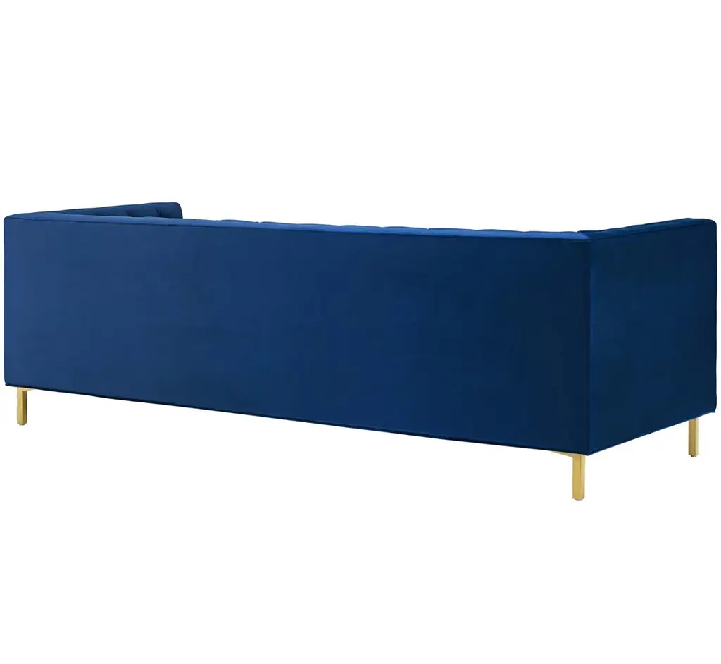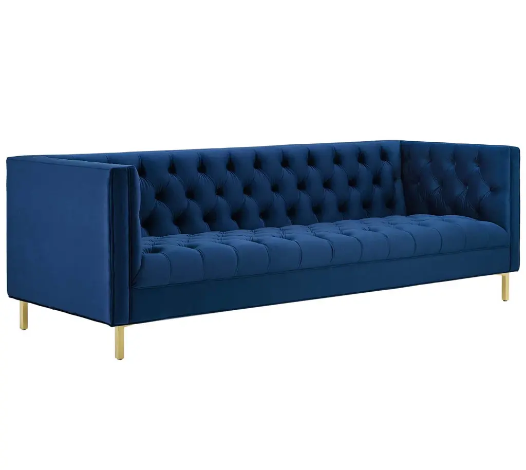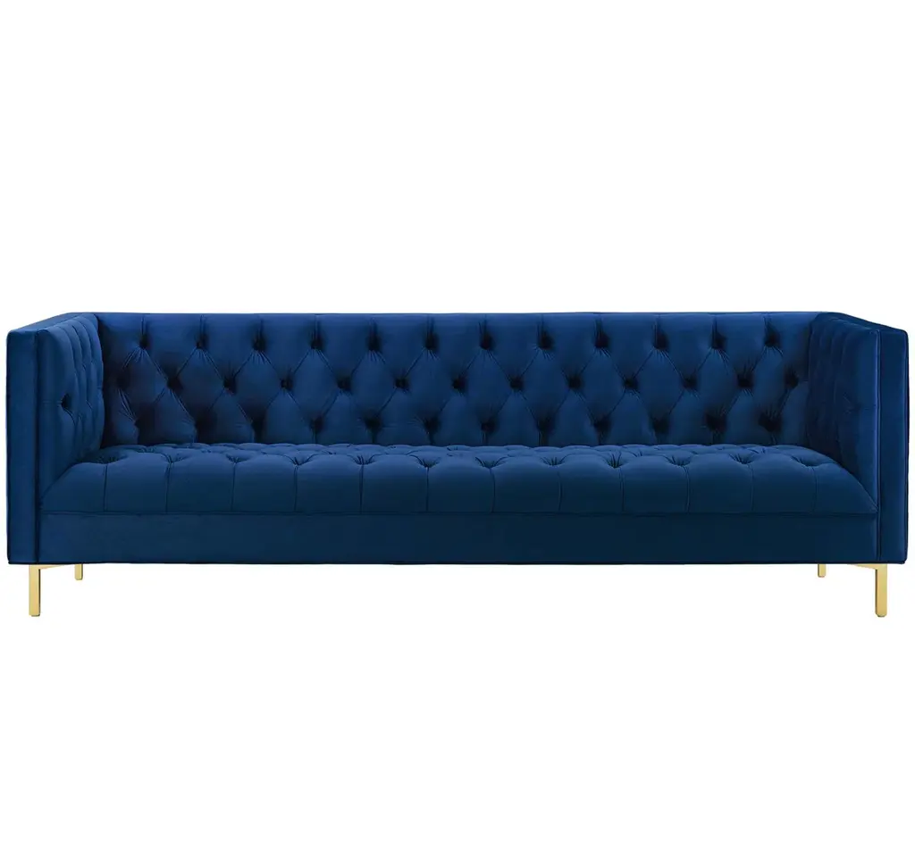 About This Product This tuxedo arm Chesterfield sofa brings a vintage-era silhouette with some contemporary glam elements. It has a solid and engineered wood frame wrapped in velvet upholstery for a luxe look. Plus, it rests on four stainless steel legs in a gold finish, adding a bit of shine to your living room. With diamond-patterned button-tufting, foam-filled cushions, and sinuous springs in the seats, this couch gives you extra support while you relax with a book or with your remote to finish the next big TV series. Not Included: Toss Pillow(s) Features Vintage glamour sofa couch