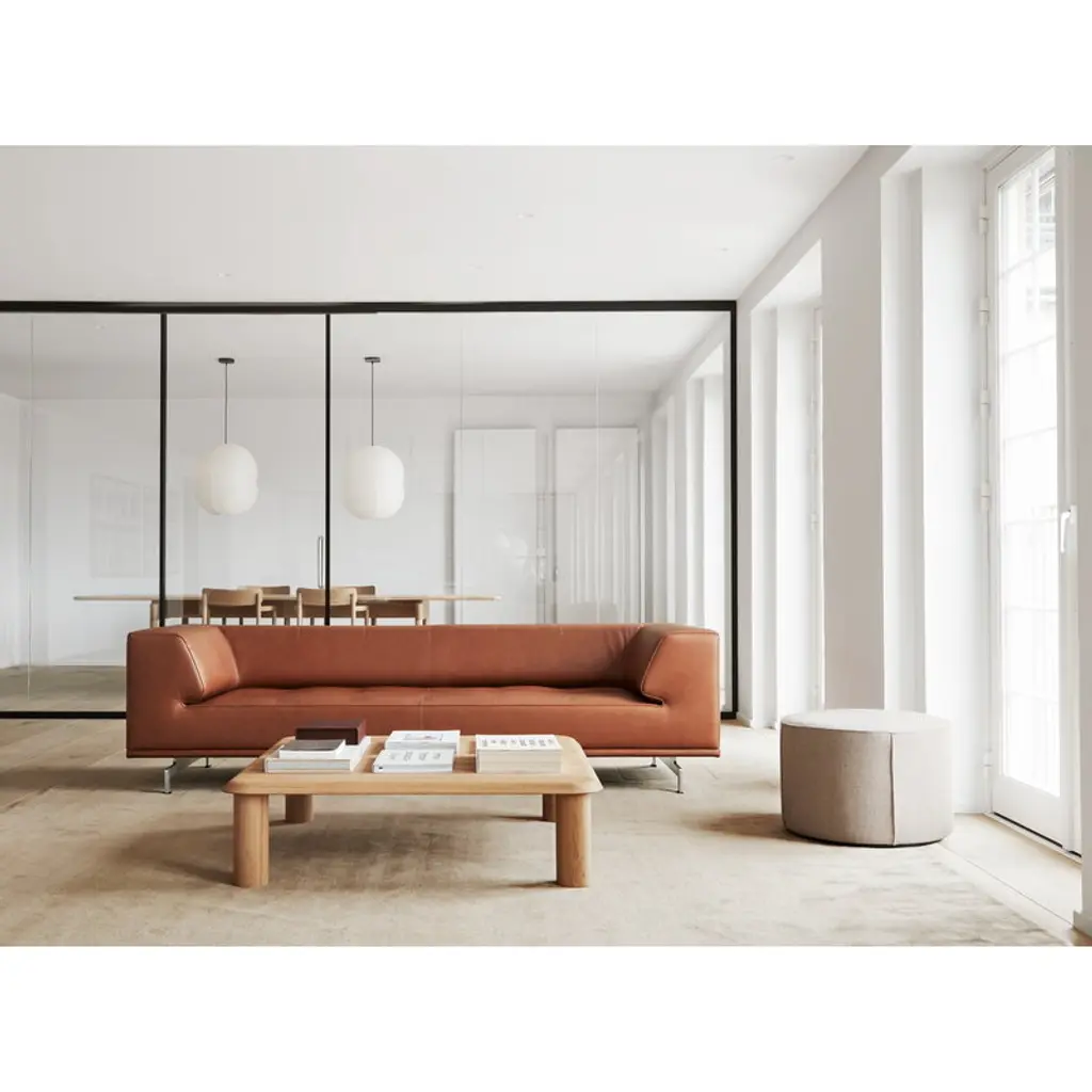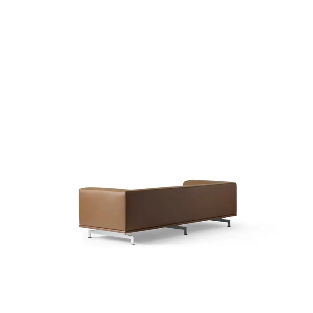 Fredericia’s Delphi sofa brings luxurious elegance and well-thought-out esthetics to a living room or lobby. The Delphi sofa features aligned, equally high armrests and backrests, resulting in an inviting, generous and perfectly supported design for sitting and lounging. The sleek metal base and small curves descending from the armrests are signature details of the otherwise simple, cushionless sofa. This three-seater Delphi sofa is upholstered in high-quality Scandinavian aniline leather and has a brushed aluminum base. Despite its generous size, the low backrest and refined design give the Delphi sofa a timeless appearance that will easily find its place in a wide range of spaces and styles. The Delphi sofa was designed by Hannes Wettstein, one of the most respected Swiss designers of his generation.