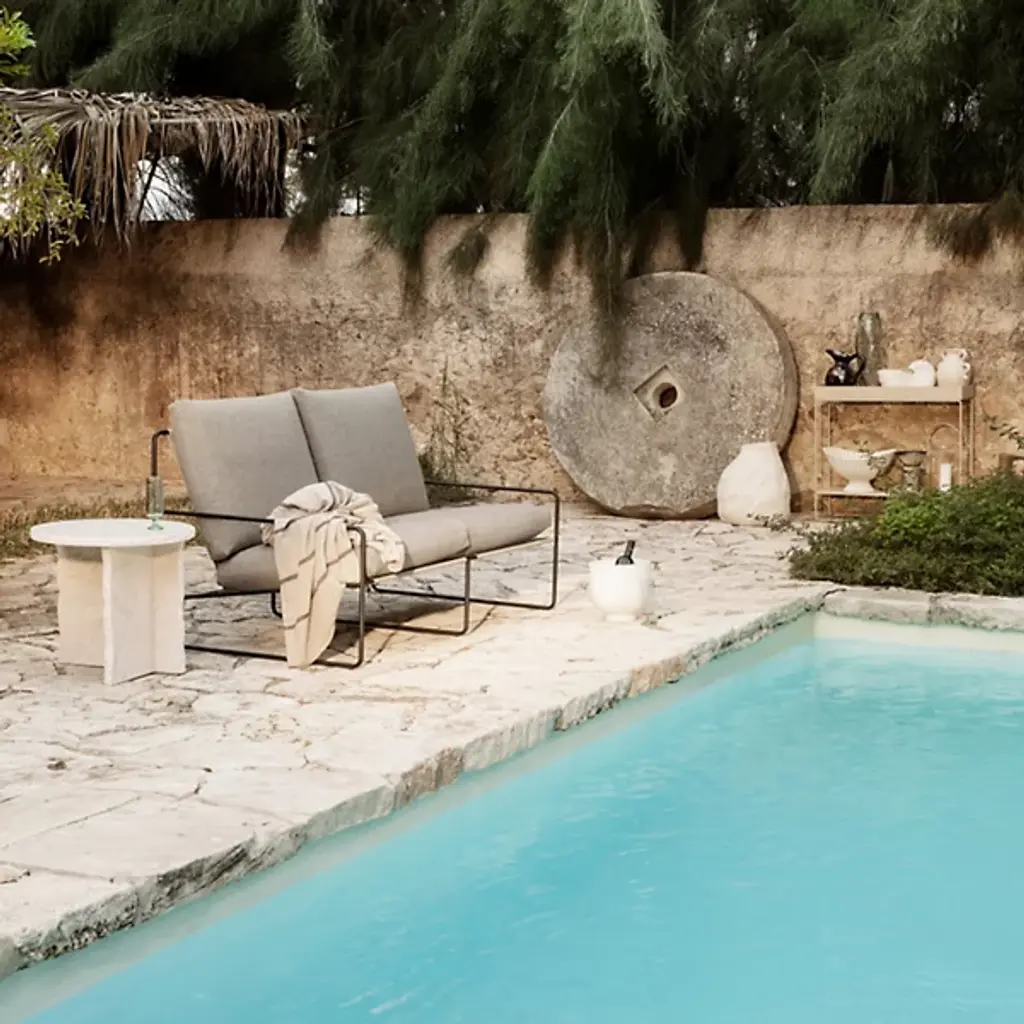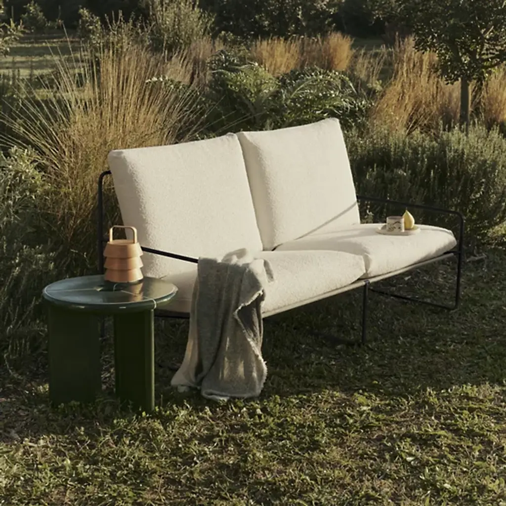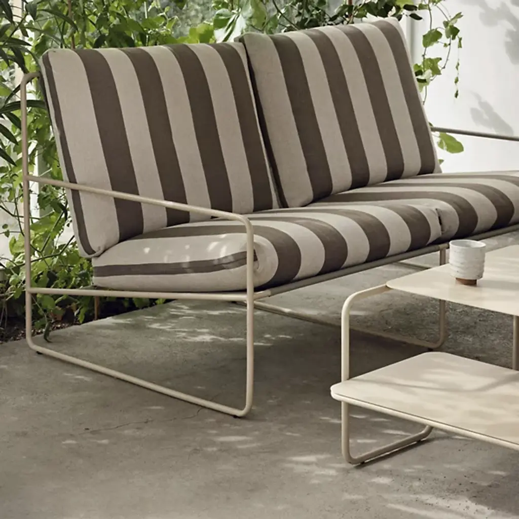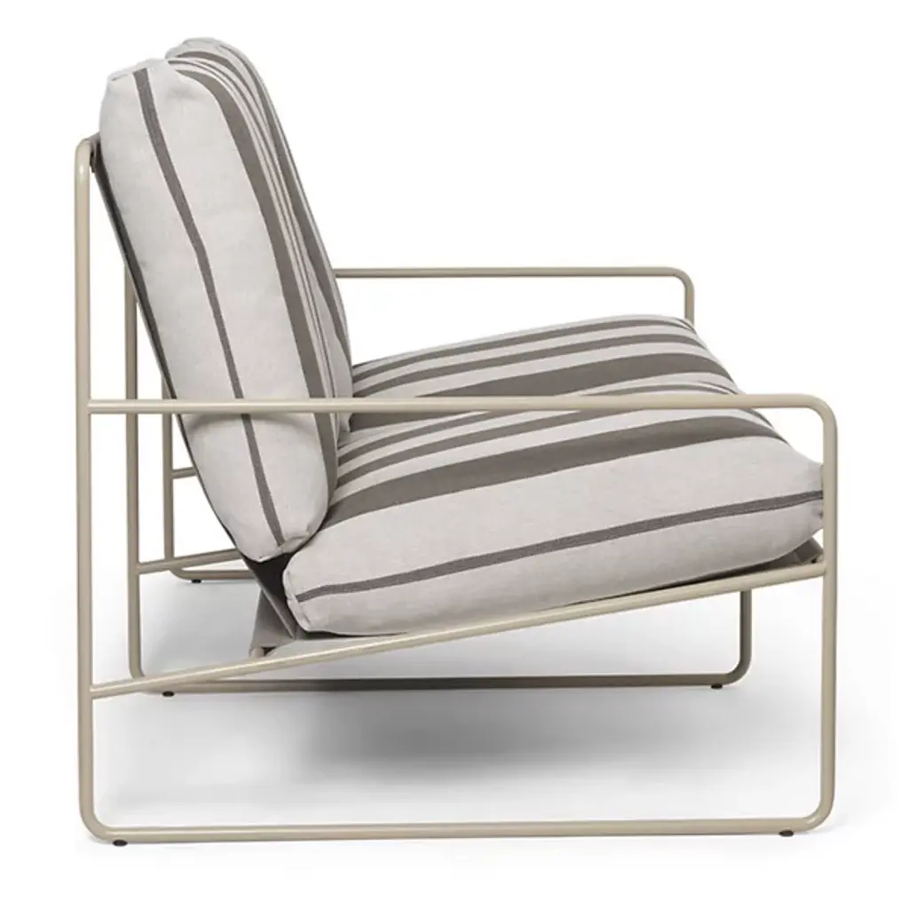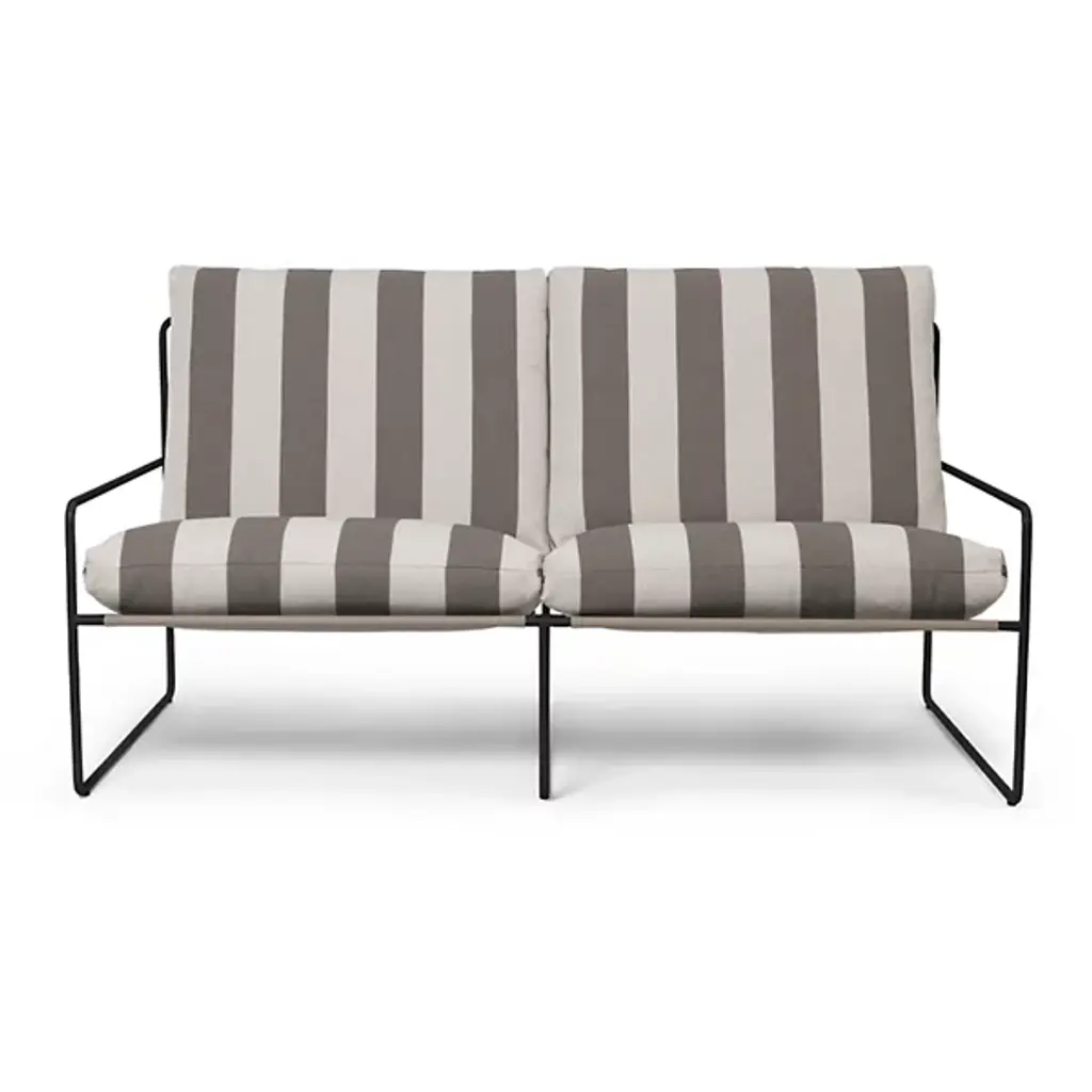 The Desert 2 Seater Outdoor Sofa by Ferm LIVING imbues its environment with inviting warmth, prompting you to unwind in style. Perfect for outdoor leisure, it offers generous seating for basking in the sun, reading, or socializing. With a minimalist contemporary design imbued with a hint of retro charm, this sofa features a robust electro-plated steel frame that resists rust, promising enduring durability outdoors. Its fabric blend upholstery, coupled with water- and UV-resistant cushions, ensures both comfort and functionality, making outdoor relaxation a breeze.