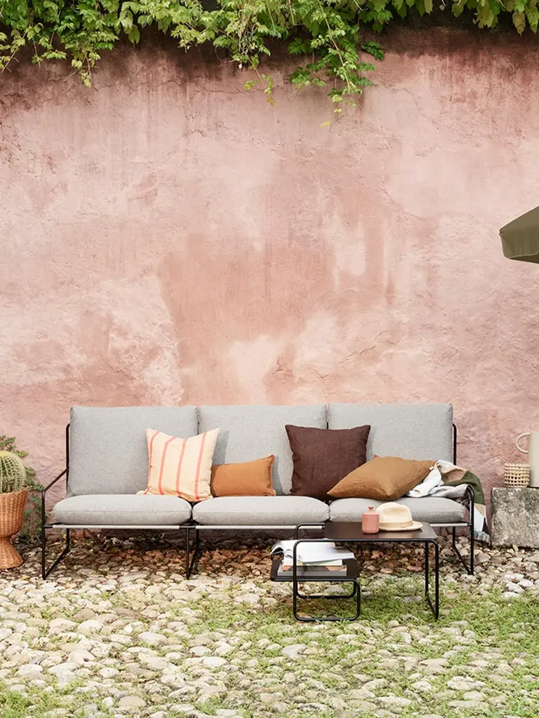 Summer equals relaxation and quality time spent in serene outdoor settings. Create an inviting lounge area with the Desert Sofa, where there is plenty of room for sunbathing, reading books and entertaining friends and family. With the unpredictable weather in mind, the Desert Sofa is designed for outdoor use and is completed with cosy sofa cushions that are both water- and UV resistant. This Desert series is made from a powder-coated metal that has been given an anti-rust treatment, and is suitable for outdoor use. Do be aware, however, that just as with any metal, prolonged outdoor use and exposure to the elements will cause the Desert series to develop rust over time. We therefore advise you to bring your Desert series furniture inside during cold weather – particularly if the temperature drops below freezing.
