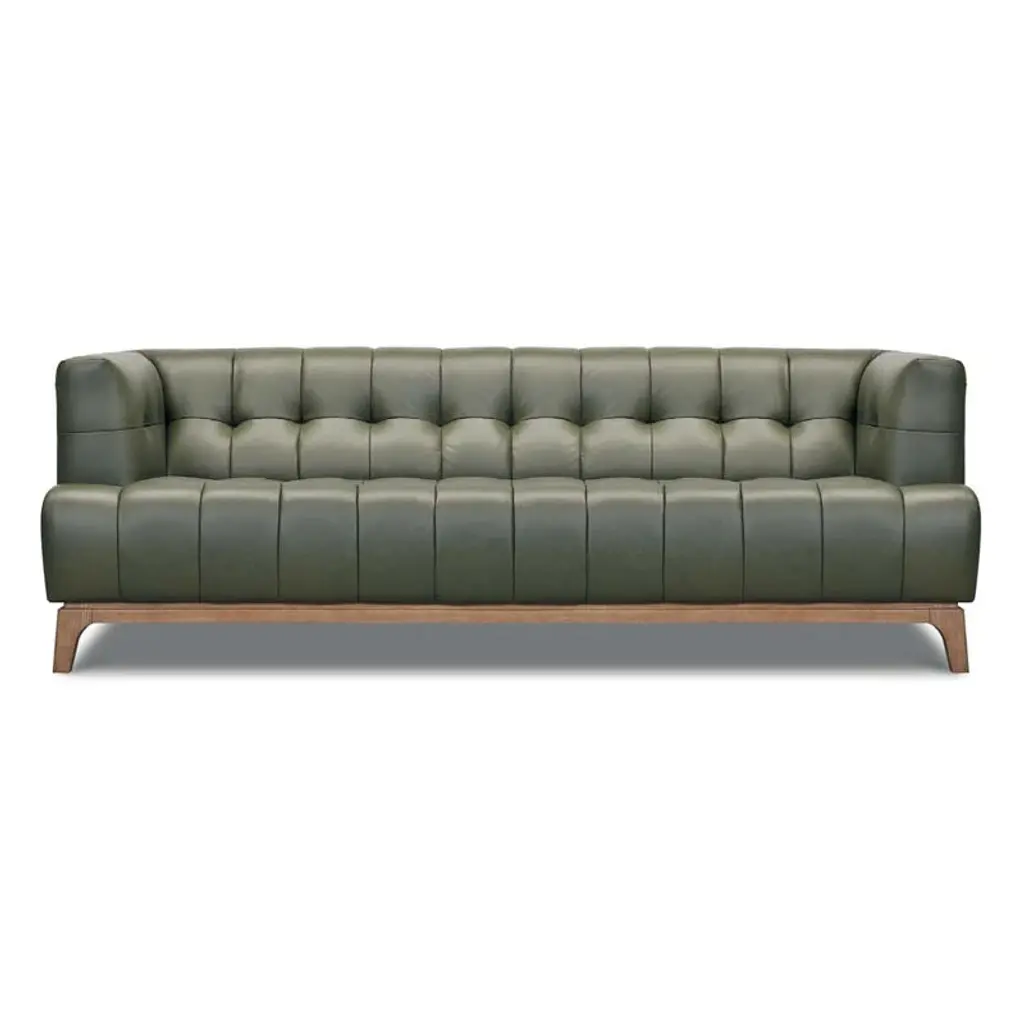 The Dexter Sofa presents a contemporary twist on classic design, featuring an elegant mossy green leather upholstery and a complementary timber wood base.