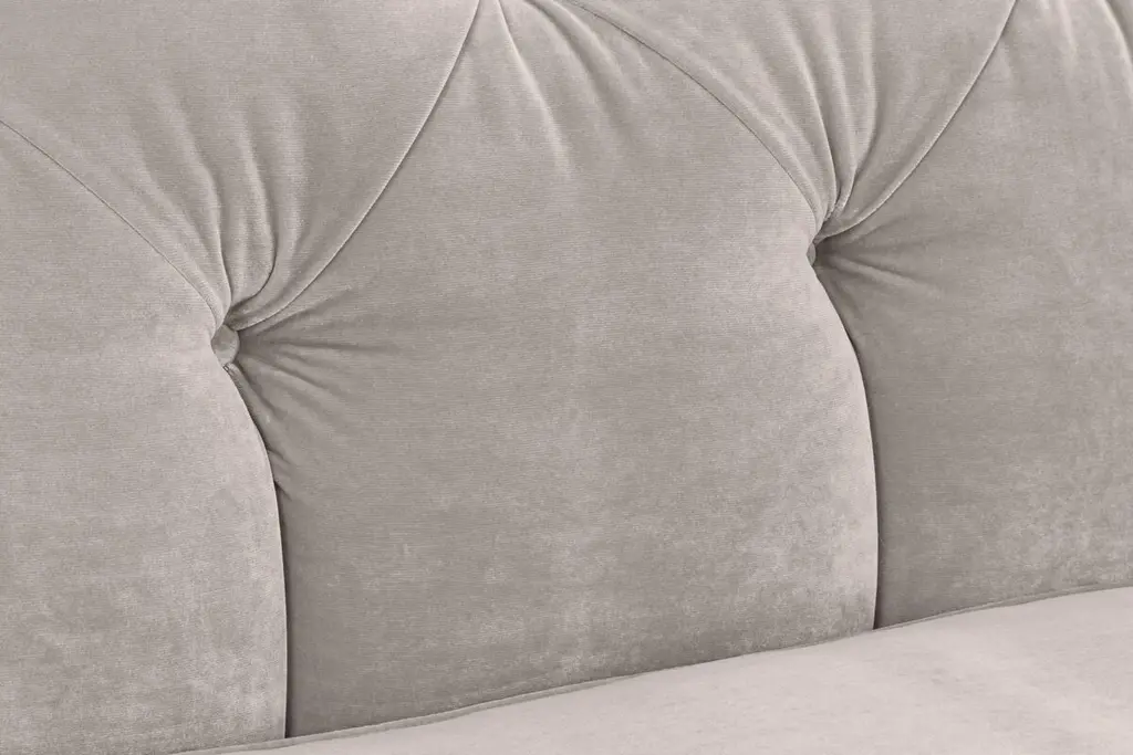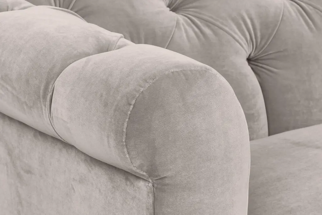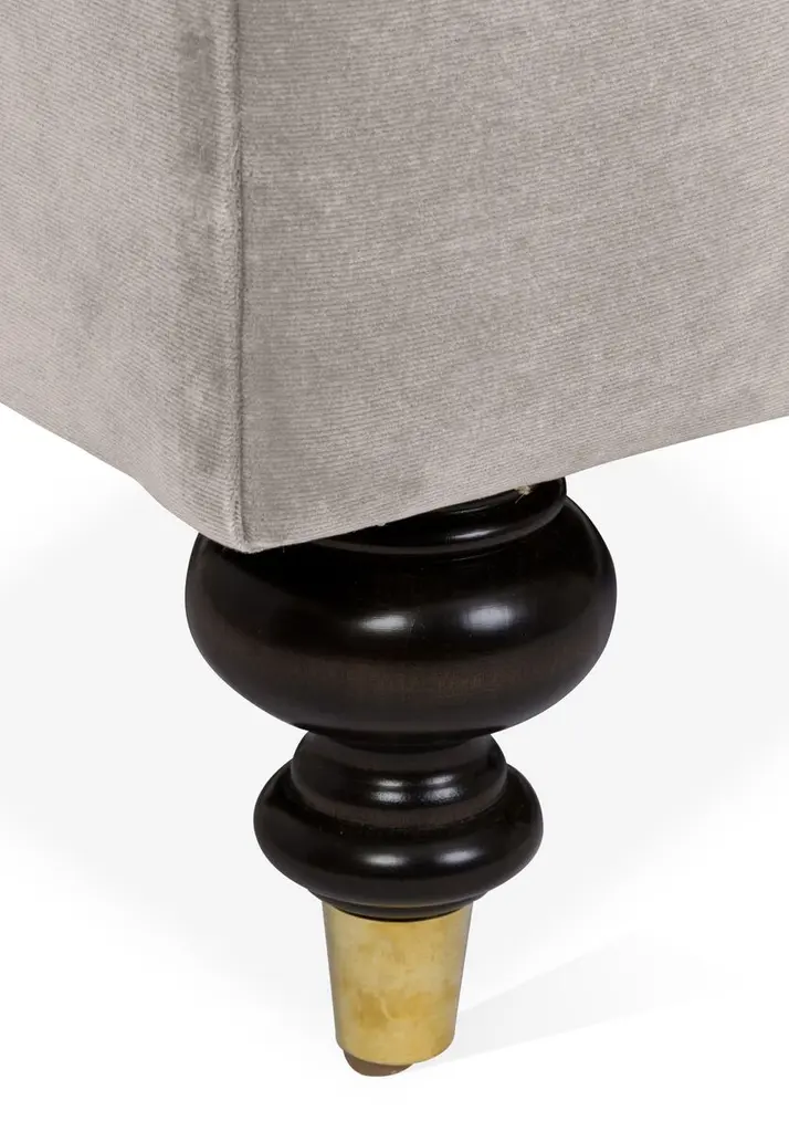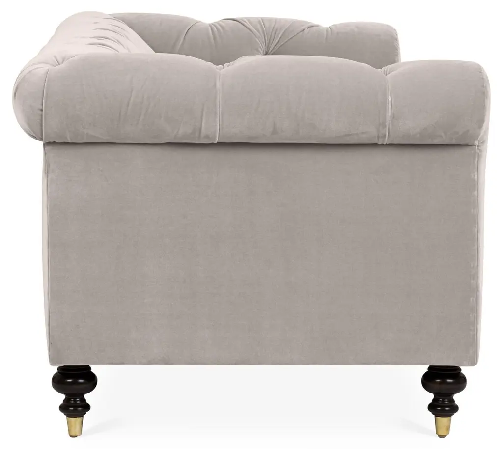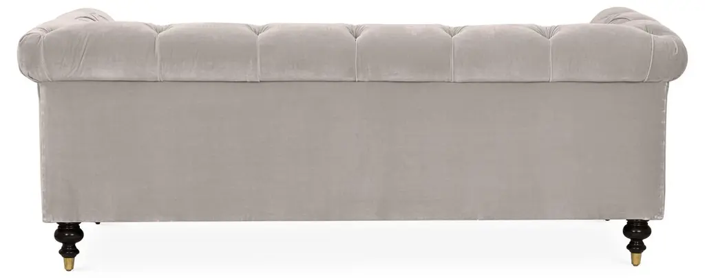 Available online exclusively at One Kings Lane: Resting on turned, brass-capped feet, this sofa updates a classic chesterfield design with velvet upholstery. An ample fill of high-resiliency foam wrapped in feathers and down ensures long-lasting comfort and support. Handcrafted in Southern California.