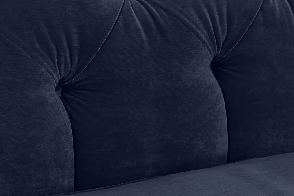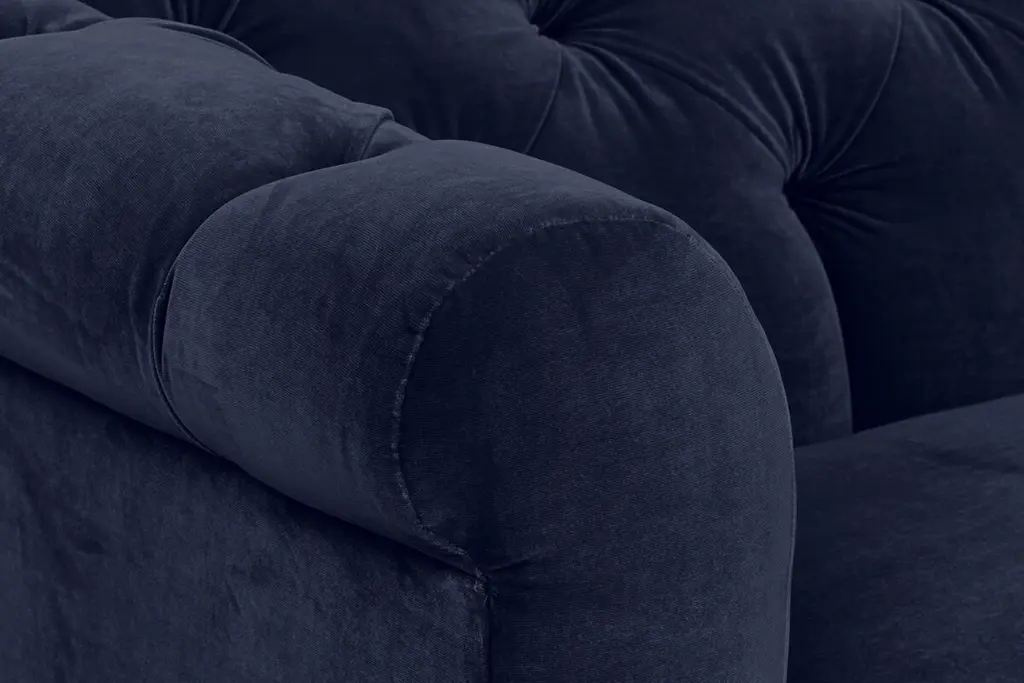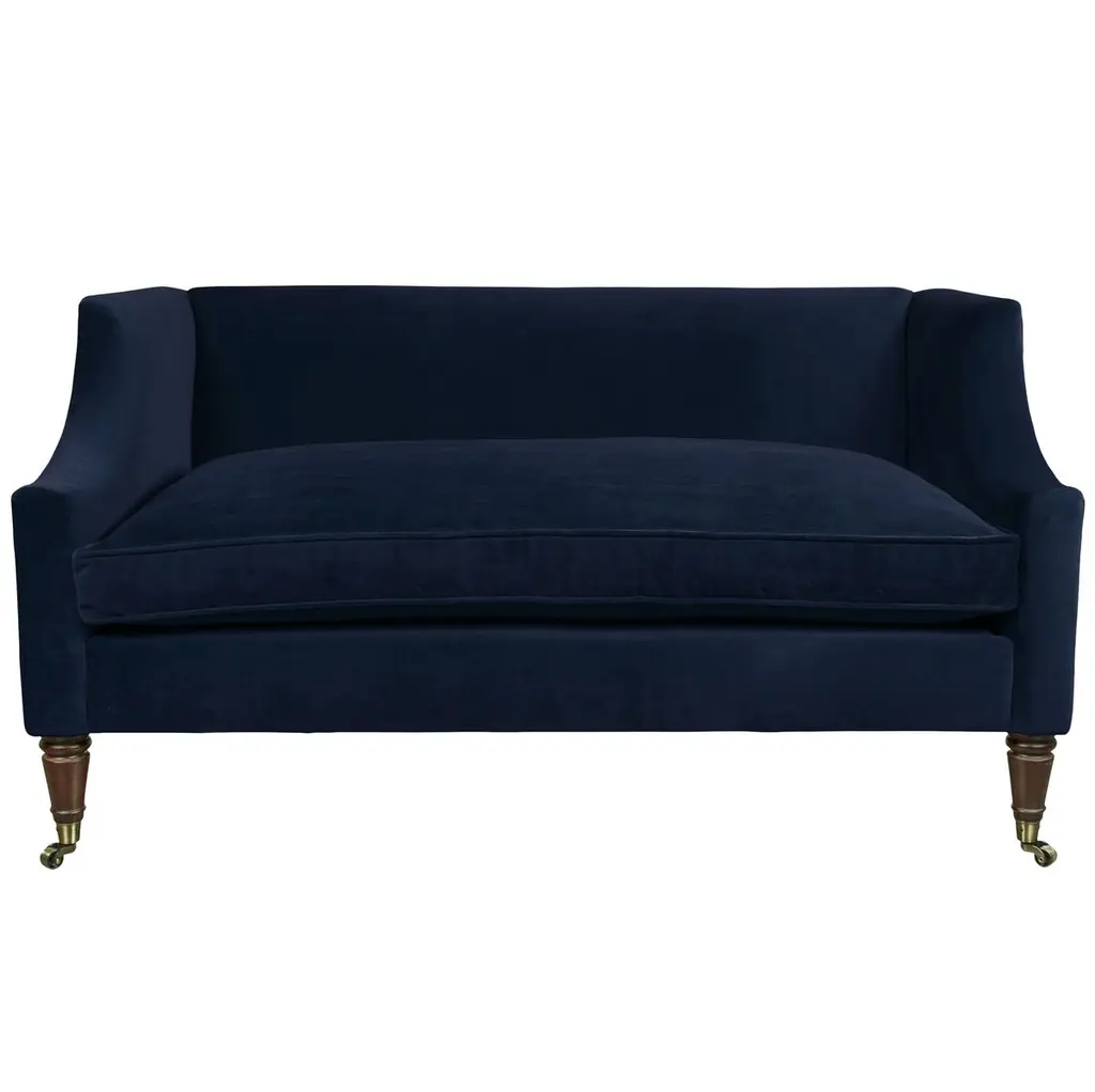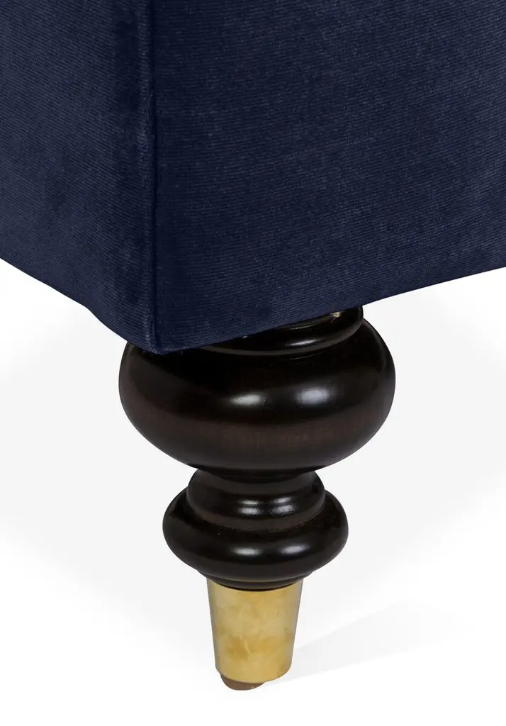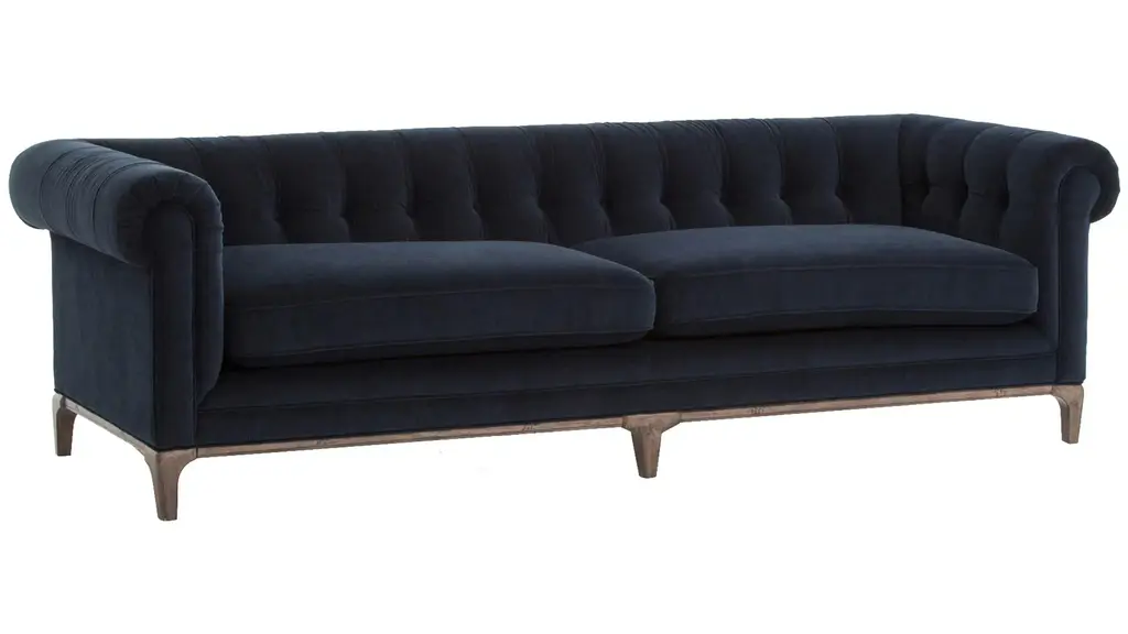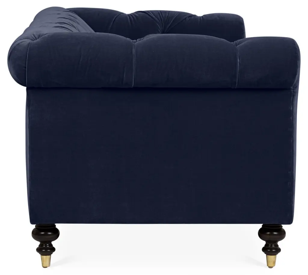 Available online exclusively at One Kings Lane: Resting on turned, brass-capped feet, this sofa updates a classic chesterfield design with velvet upholstery. An ample fill of high-resiliency foam wrapped in feathers and down ensures long-lasting comfort and support. Handcrafted in Southern California.