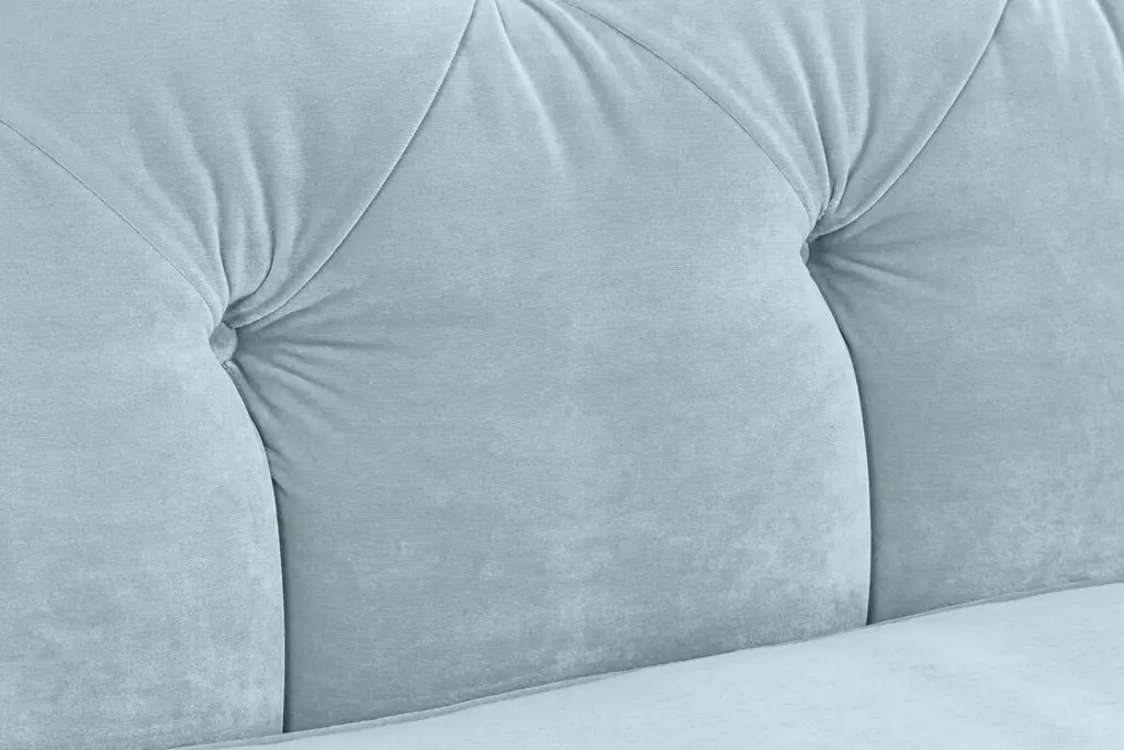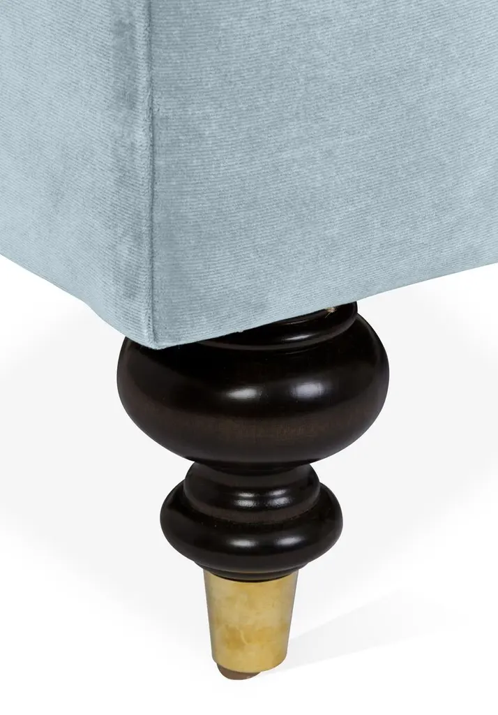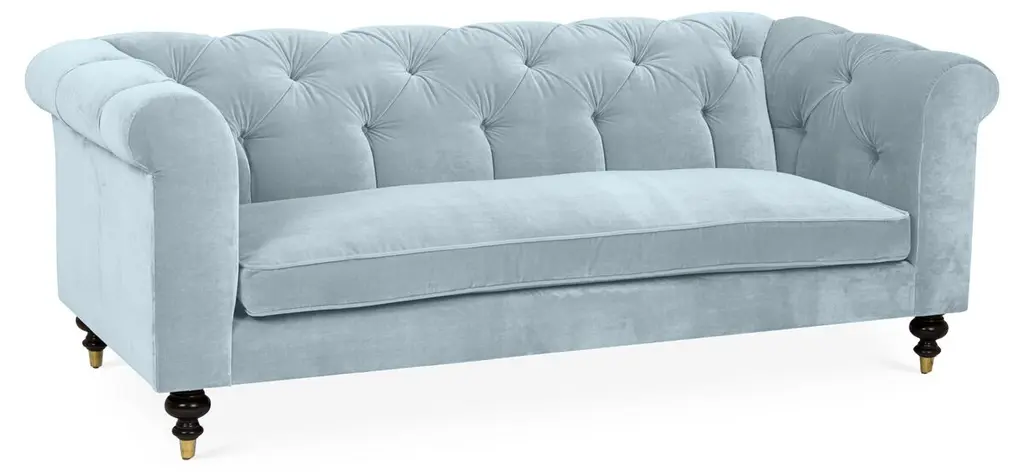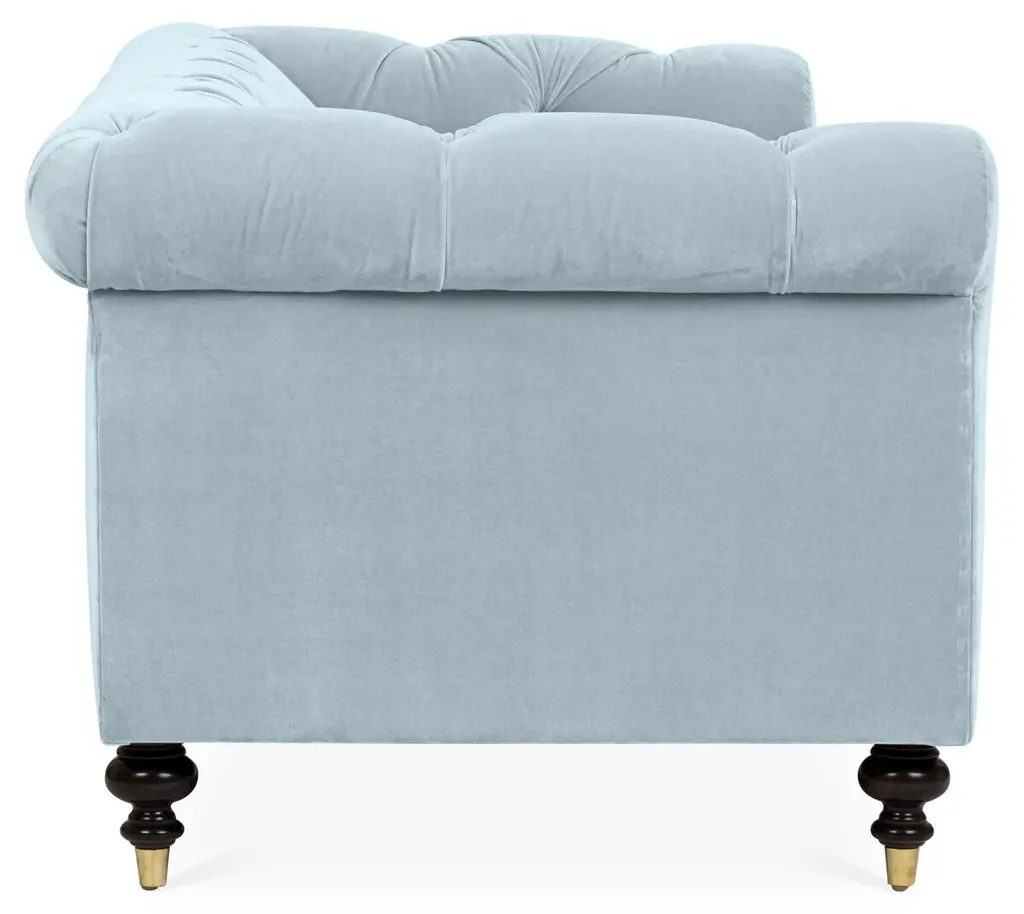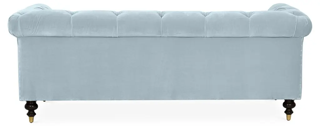 Available online exclusively at One Kings Lane: Resting on turned, brass-capped feet, this sofa updates a classic chesterfield design with velvet upholstery. An ample fill of high-resiliency foam wrapped in feathers and down ensures long-lasting comfort and support. Handcrafted in Southern California.