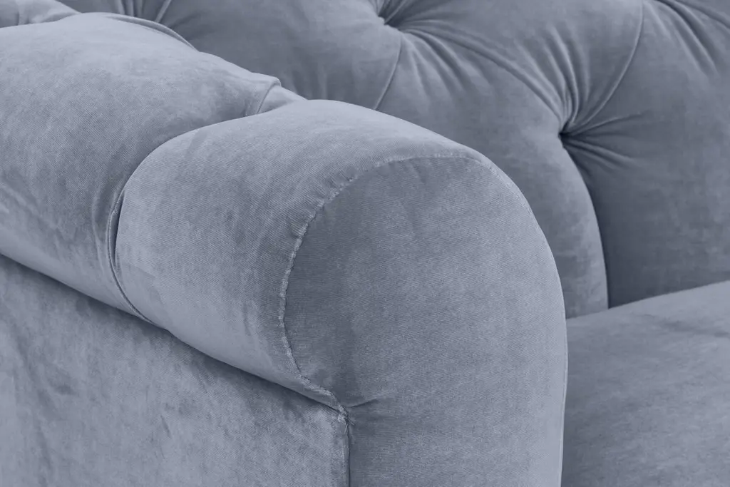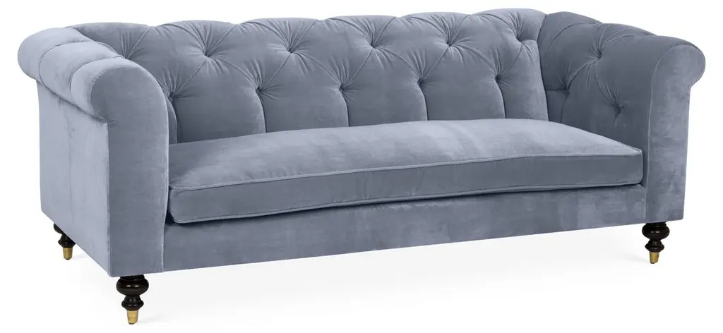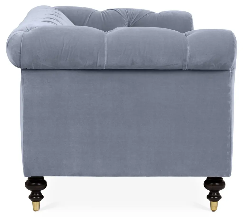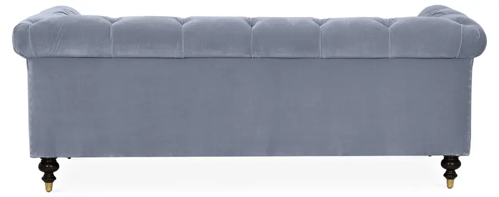 Available online exclusively at One Kings Lane: Resting on turned, brass-capped feet, this sofa updates a classic chesterfield design with velvet upholstery. An ample fill of high-resiliency foam wrapped in feathers and down ensures long-lasting comfort and support. Handcrafted in Southern California.