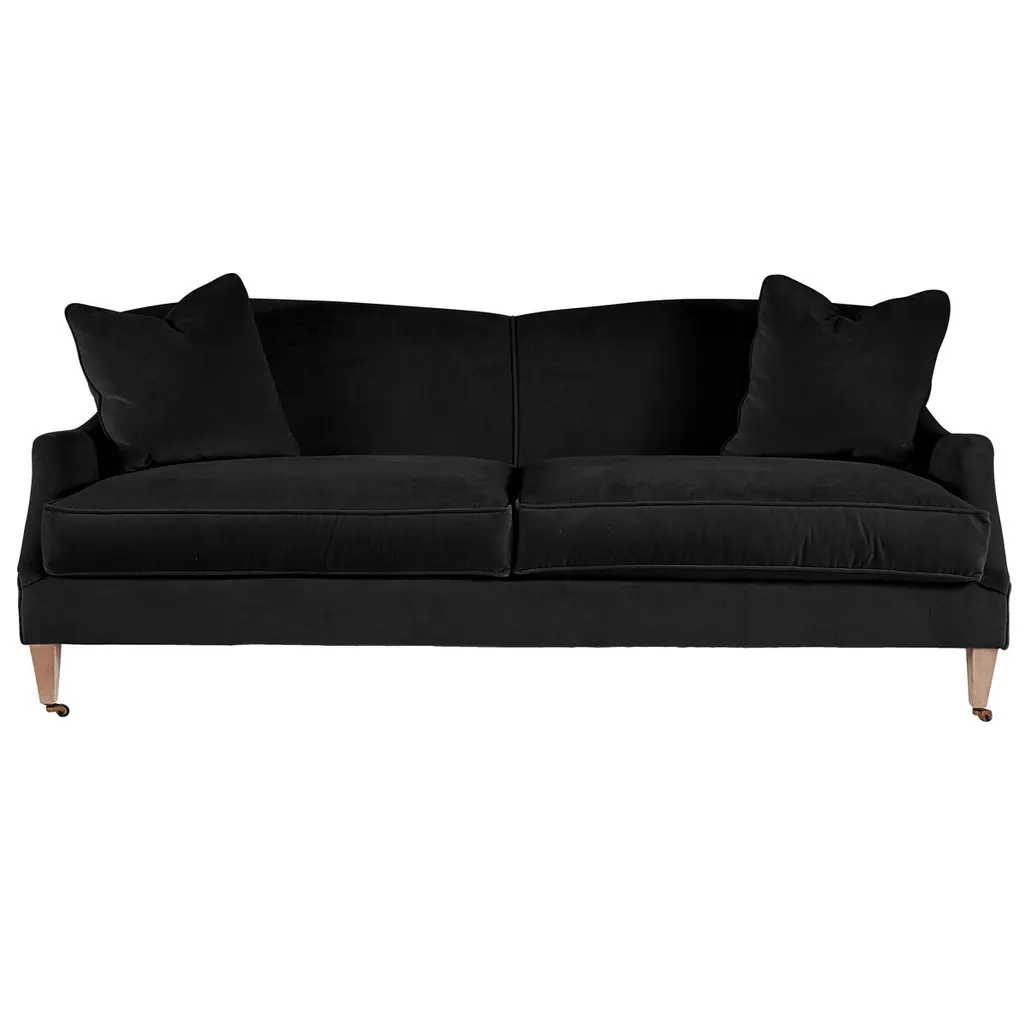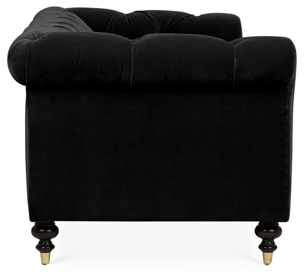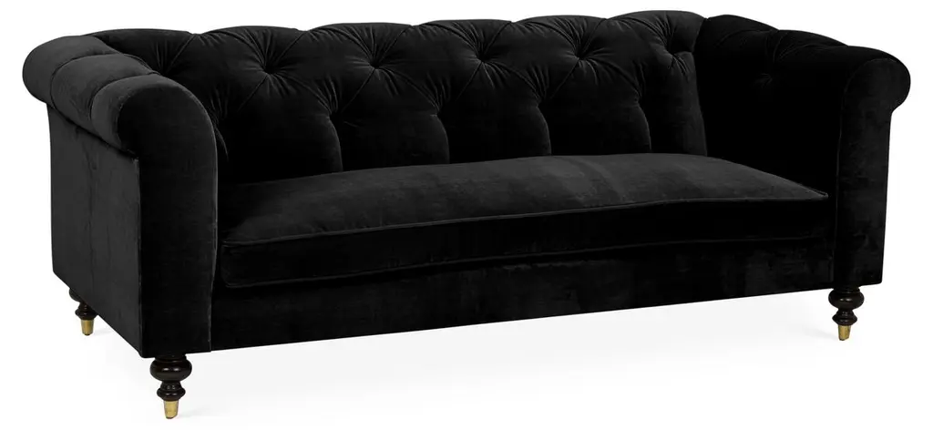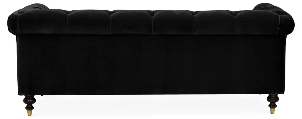 Available online exclusively at One Kings Lane: Resting on turned, brass-capped feet, this sofa updates a classic chesterfield design with velvet upholstery. An ample fill of high-resiliency foam wrapped in feathers and down ensures long-lasting comfort and support. Handcrafted in Southern California.