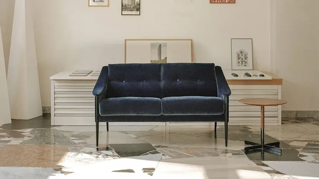The historical Dezza two-seater sofa, designed by Gio Ponti, has a seasoned beech frame. The Dezza sofa is available with upholstery in Pelle Frau® leather, a leather/pony skin combination or fabric. Among fabrics, it comes the Redevance printed wool satin fabric, whose graphic pattern was designed by Ponti himself. Finishes for the feet are black or white open-pore lacquered ash and Canaletto walnut. The suspension of the seat is provided by an elastic canvas, while padding is made of polyurethane foam.Designed in 1965, the Dezza embodies some of Gio Ponti’s most important design principles from both a formal perspective - like the leg with its characteristic tapered triangular cross-section - and a methodological standpoint, thanks to the revolutionary modular system comprising of a limited number of pieces to assemble. The Dezza sofa and armchairs, comfortable, light and very versatile, are reissued in a refined new edition that exalts their formal beauty and unique style.The supporting structure is made from seasoned beech. The number 12 armchair has slender armrests that make it possible to combine two or more elements. The number 48 armchair has a goose down headrest incorporated in the backrest. The upholstery is entirely in Pelle Frau® leather or in Pelle Frau® leather for the shell and pony skin for the seat and backrest cushion. Lots of different finishes available for the feet: as well as white or black lacquered wood, you can also opt for Ponti blue or Ponti green, or for Canaletto walnut.