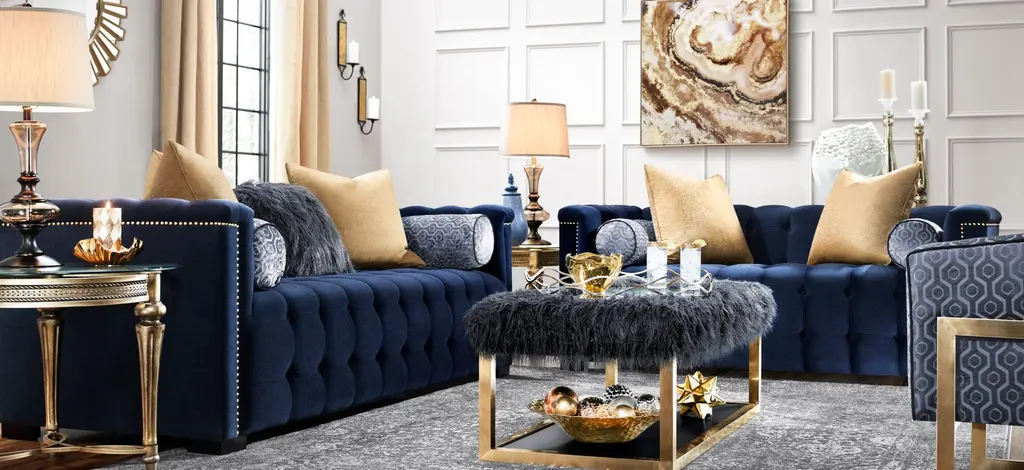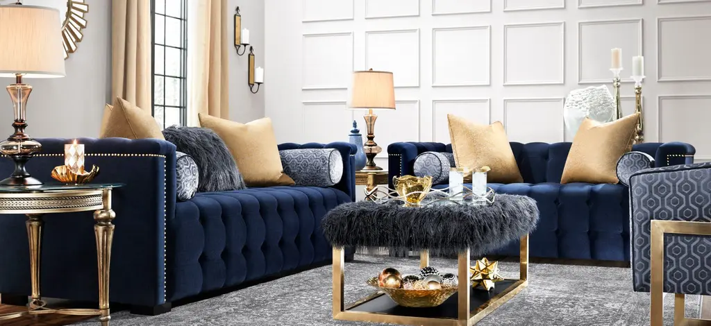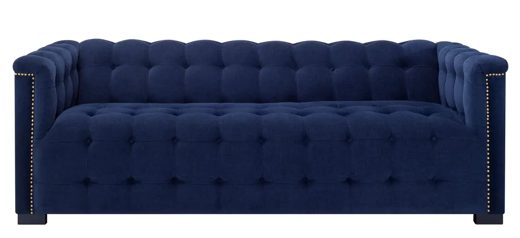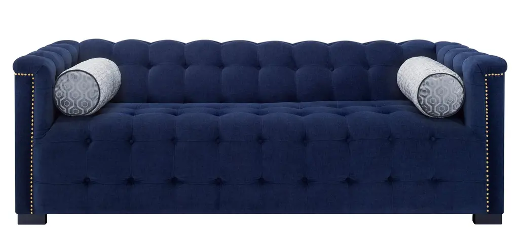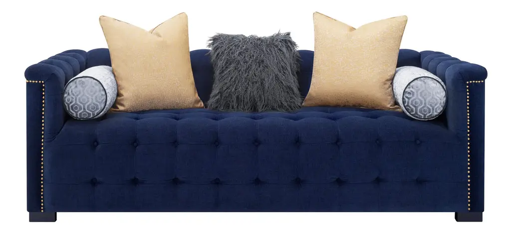The Diana sofa is exotic, adventurous and glamorous. Rich hues in indigo and beautiful nailhead trim create a distinctive, unique and daringly sensuous look. Button-tufted velvet-look polyester adorns this piece, while Tibetan gray faux fur on the accent pillows adds fabulous flair.