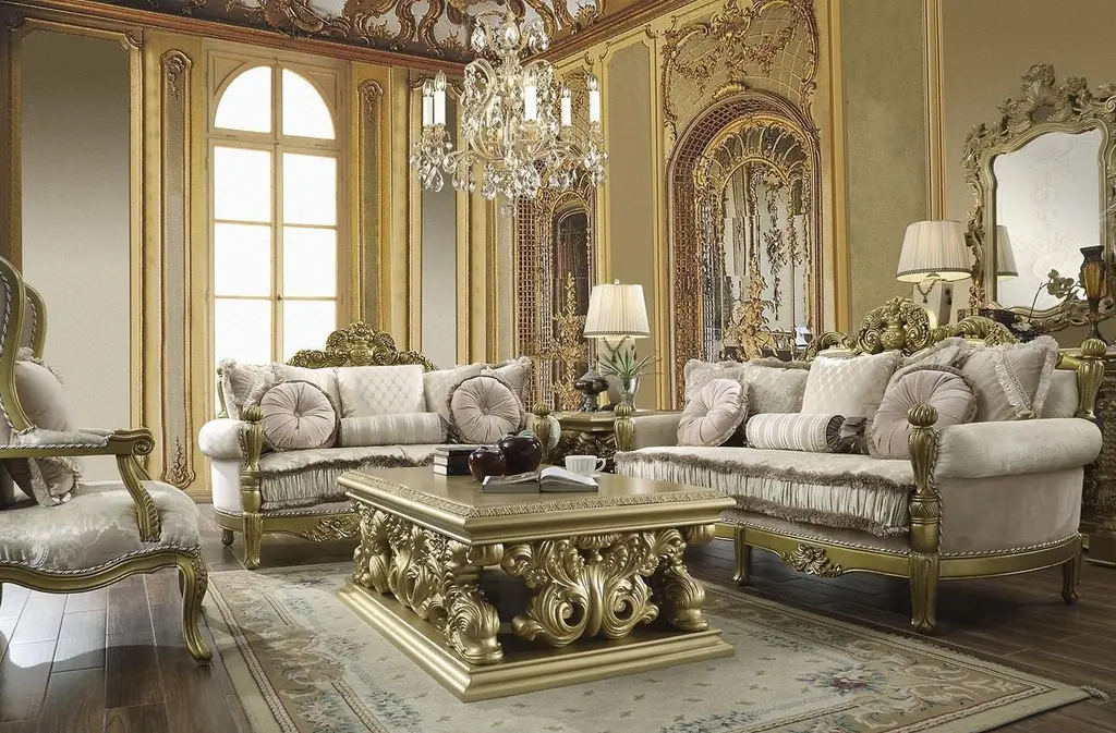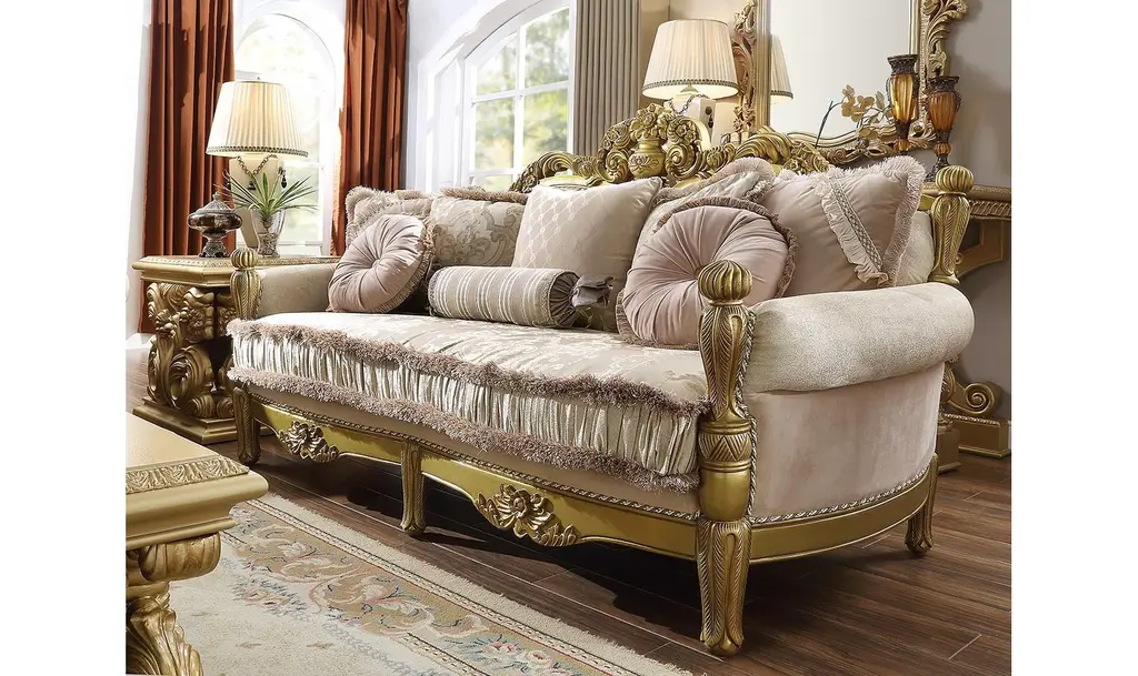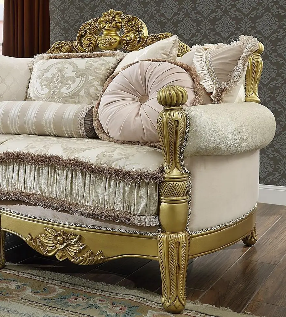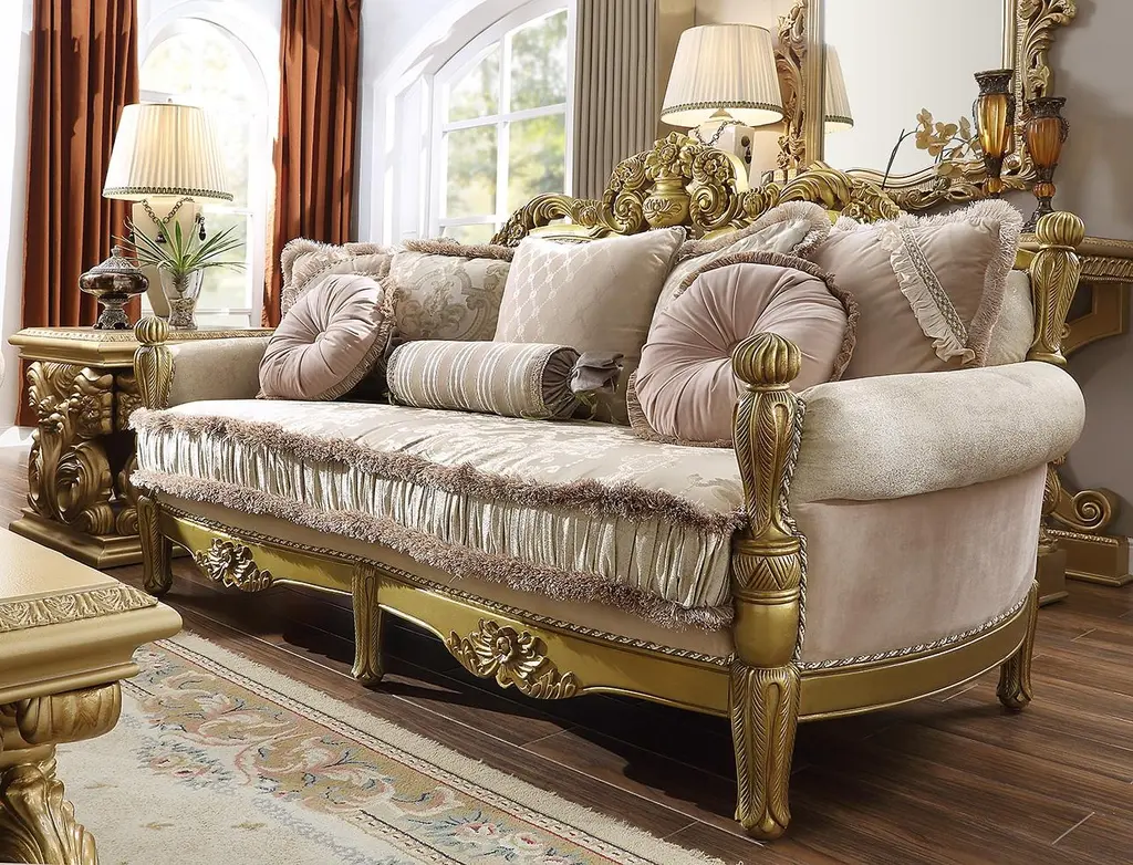 Traditional Tan Fabric & Metallic Gold Finish Sofa. Introduces the brilliance of time-honored style merged with Classic European, right into the center of your home. This collection is upholstered with Rich European Luxury Fabric and wood trim all around in golden finish, Sofa is complimented by stylish accent pillow included as shown. Lavish and Breath taking is what most describes this Sofa. Seductively Cedar crafted to enjoy the artistic layout, with a combination of chenille fabrics and silky textiles. Matching to its rich and satin feel are the included dazzling Pillows. Features: Traditional Style Finish: Metallic Gold Upholstered Material: Fabric Frame Material: Solid Wood Construction Decorative Accent Pillows Dimensions: Sofa: 90_*40_*48_