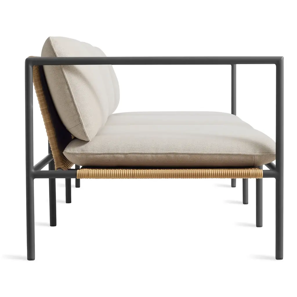 All-weather rattan adds handwoven texture to an architectural tubular aluminum frame. Designed to have great vistas from all angles, Dog Days is what happens when a minimalist goes on vacation and gets in touch their inner hippy. Seat and back feature ravioli style cushions upholstered in high-performance, mildew and fade resistant Sunbrella ® fabric.