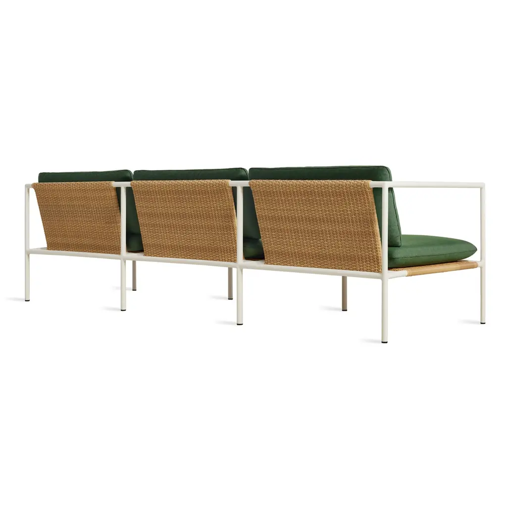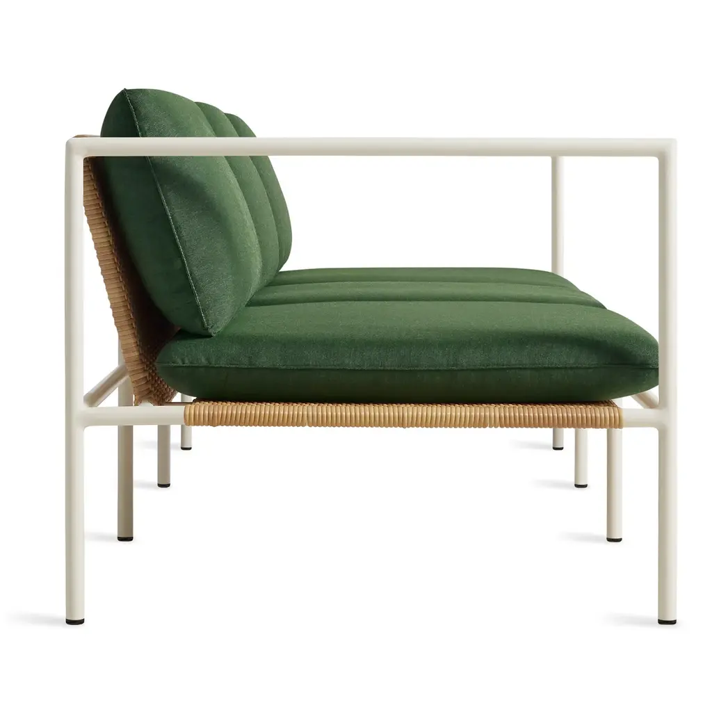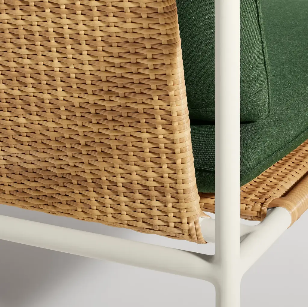 All-weather rattan adds handwoven texture to an architectural tubular aluminum frame. Designed to have great vistas from all angles, Dog Days is what happens when a minimalist goes on vacation and gets in touch their inner hippy. Seat and back feature ravioli style cushions upholstered in high-performance, mildew and fade resistant Sunbrella ® fabric.