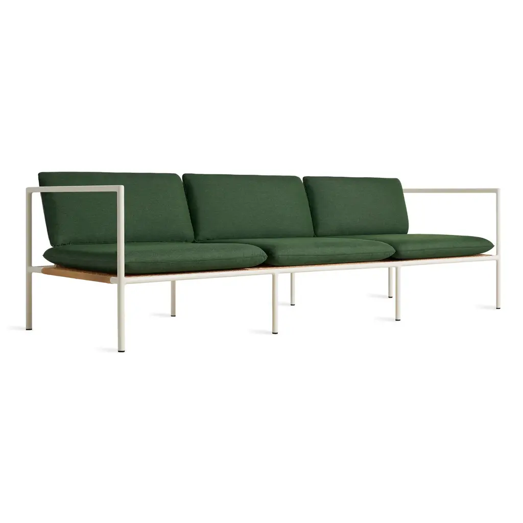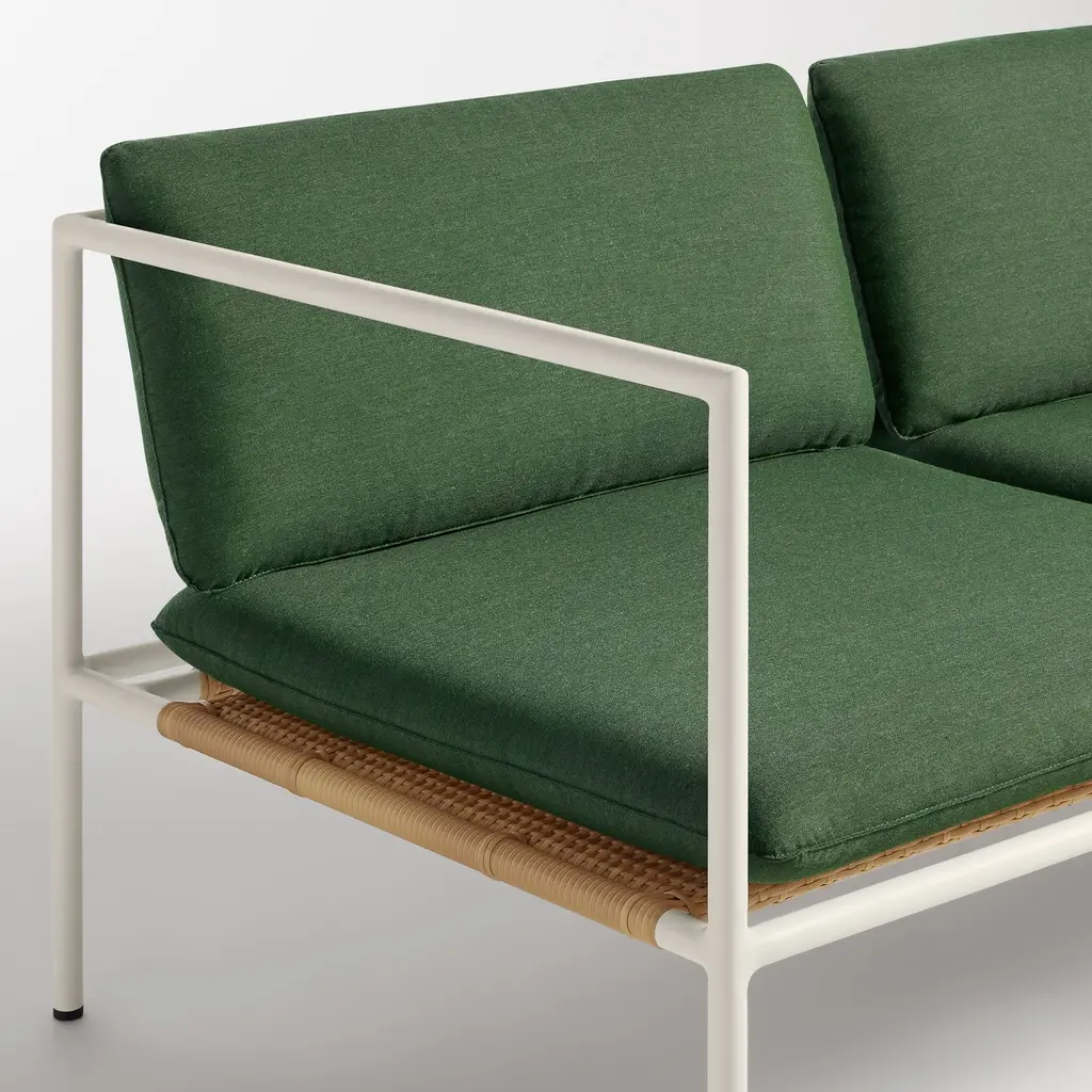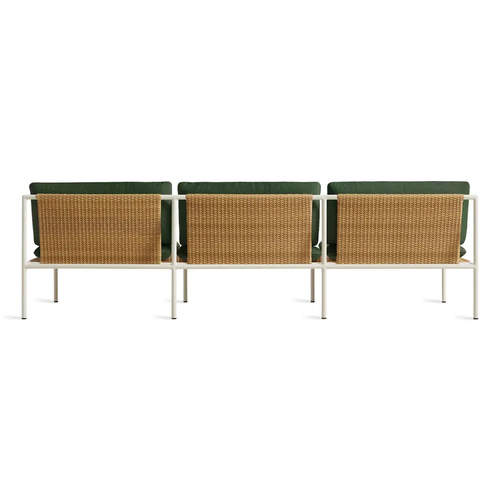 All-weather rattan adds handwoven texture to an architectural tubular aluminum frame. Designed to have great vistas from all angles, Dog Days is what happens when a minimalist goes on vacation and gets in touch their inner hippy. Seat and back feature ravioli style cushions upholstered in high-performance, mildew and fade resistant Sunbrella ® fabric.