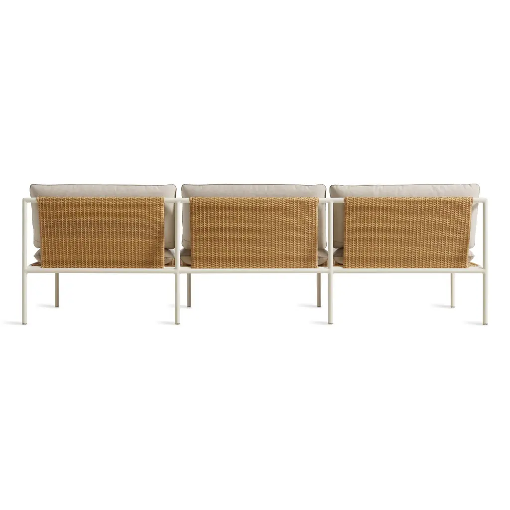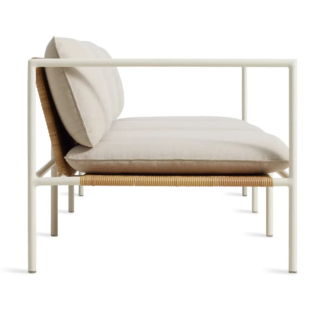 All-weather rattan adds handwoven texture to an architectural tubular aluminum frame. Designed to have great vistas from all angles, Dog Days is what happens when a minimalist goes on vacation and gets in touch their inner hippy. Seat and back feature ravioli style cushions upholstered in high-performance, mildew and fade resistant Sunbrella ® fabric.