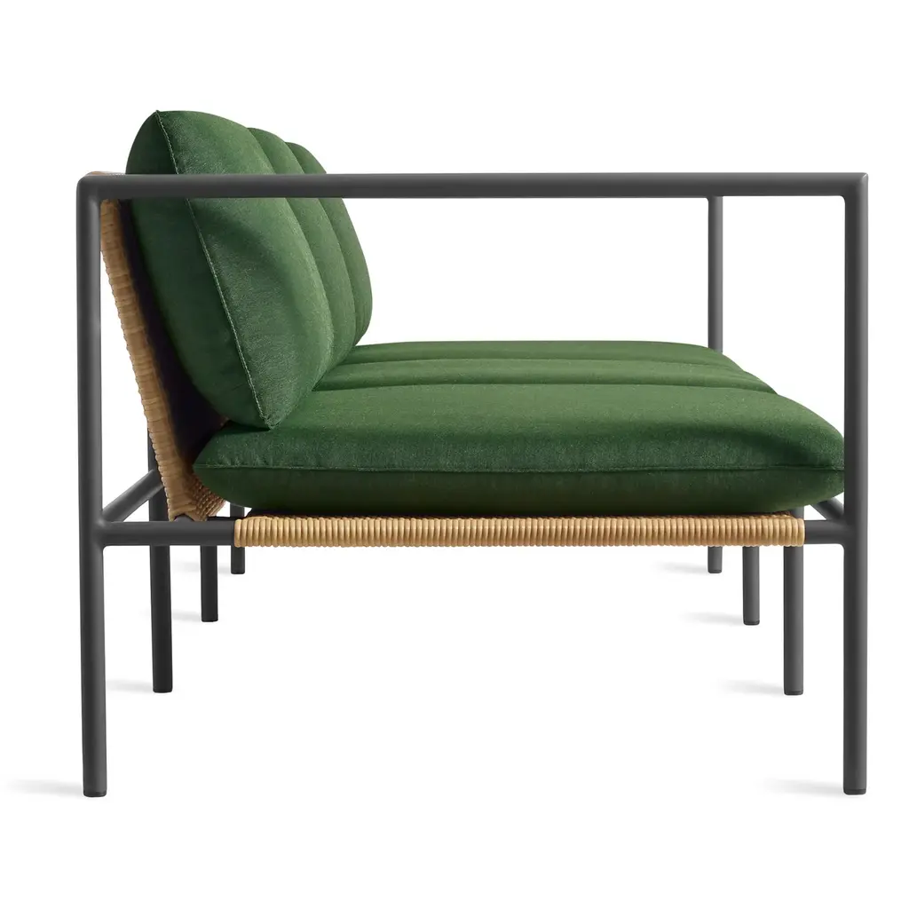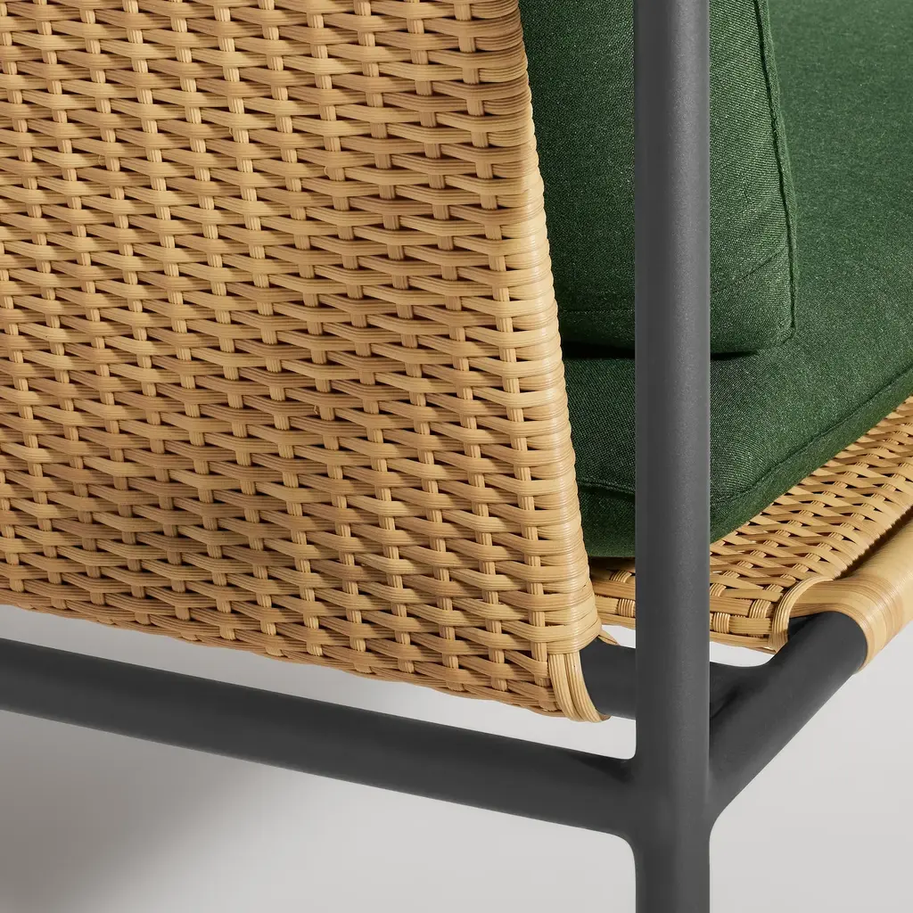 All-weather rattan adds handwoven texture to an architectural tubular aluminum frame. Designed to have great vistas from all angles, Dog Days is what happens when a minimalist goes on vacation and gets in touch their inner hippy. Seat and back feature ravioli style cushions upholstered in high-performance, mildew and fade resistant Sunbrella ® fabric.