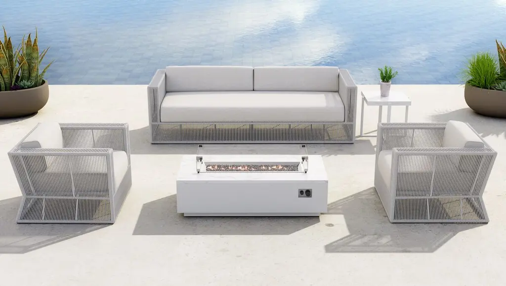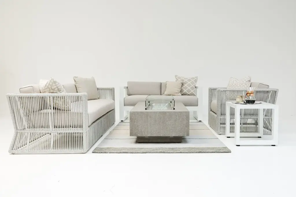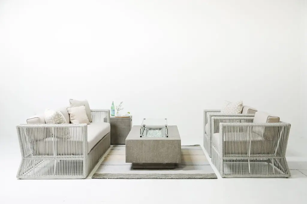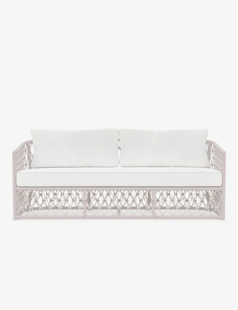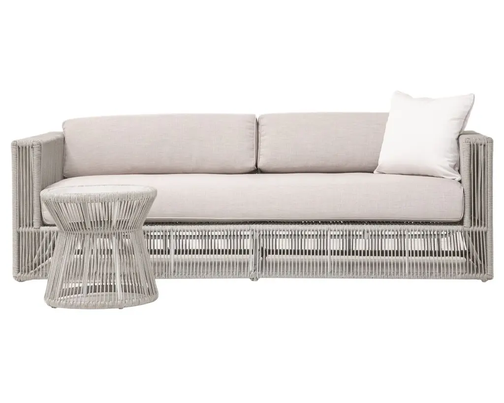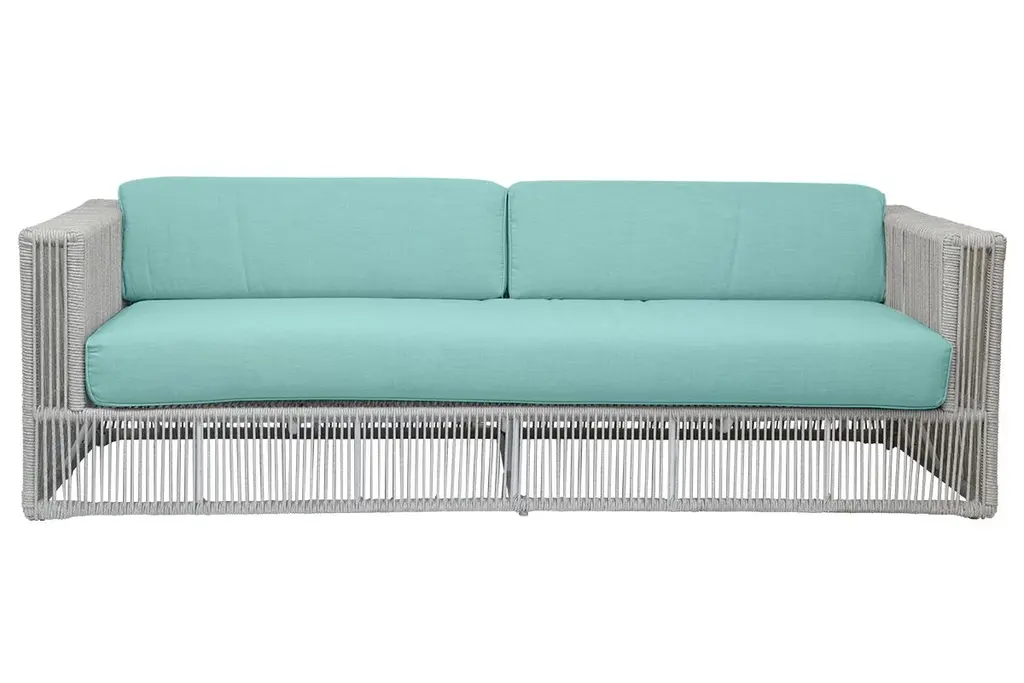 The Dola Sofa embodies clean lines and thoughtful angles with its box frame and striated rope design. Its rust-free aluminum frame is expertly hand-wrapped with premium all-weather olefin rope, featuring a box frame with pinched back leg detail. Fully welded, powder-coated aluminum frame wrapped in weather-resistant, colorfast outdoor rope. Weather-resistant, high-resiliency foam cushions stocked in Premium Sunbrella fabric. Non-marking plastic glides and commercial quality construction.