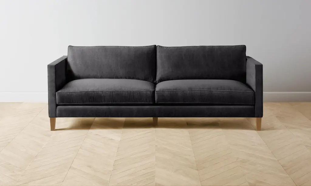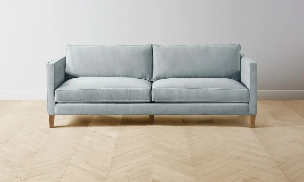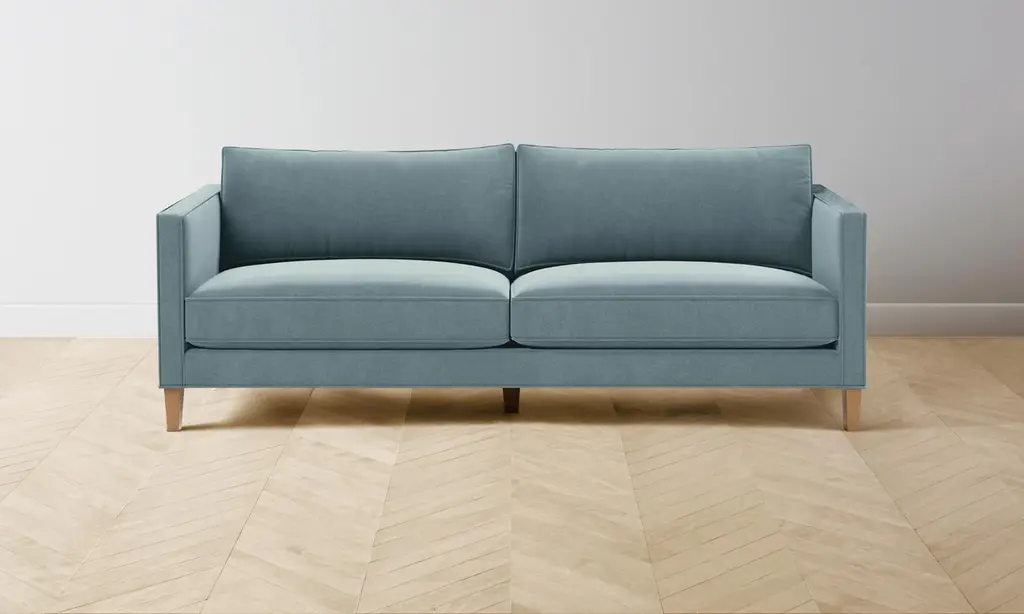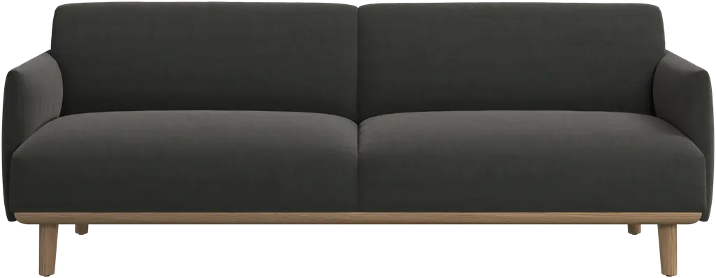 With hidden metal supports in its legs, the Domino 3-seater Sofa is surprisingly sturdy. Featuring flared midcentury modern-style legs, the sofa can be upholstered in the fabric of your choosing. Shown here with linen upholstery in Jeans and Celestino with walnut legs in Modo10's Havana finish. The sofa easily pairs with the rest of the Domino Collection of contemporary walnut furnishings.