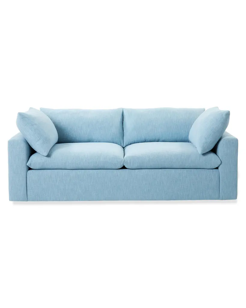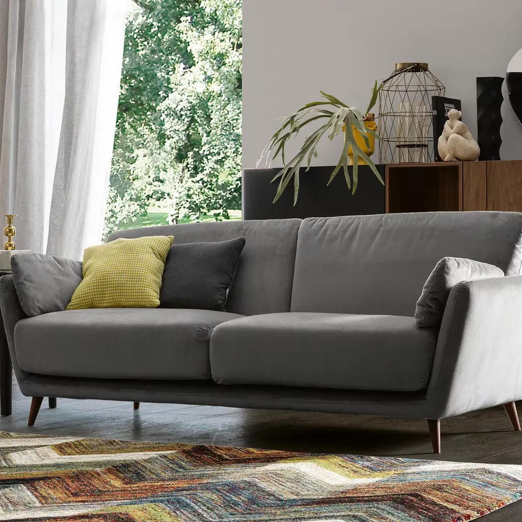 With hidden metal supports in its legs, the Domino 3-seater Sofa is surprisingly sturdy. Featuring flared midcentury modern-style legs, the sofa can be upholstered in the fabric of your choosing. Shown here with linen upholstery in Jeans and Celestino with walnut legs in Modo10's Havana finish. The sofa easily pairs with the rest of the Domino Collection of contemporary walnut furnishings.