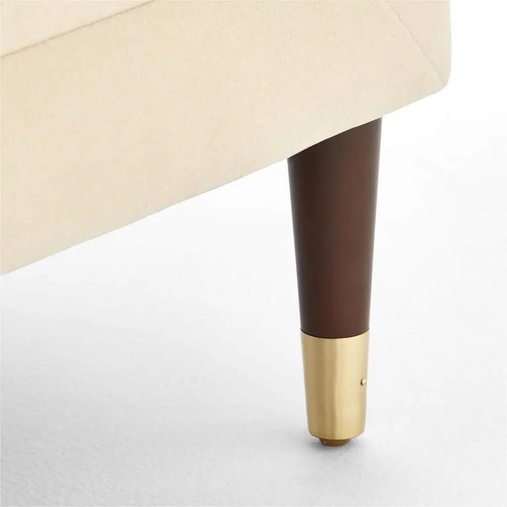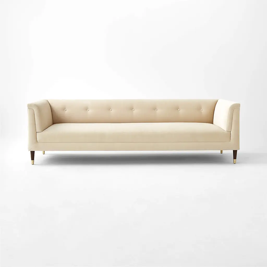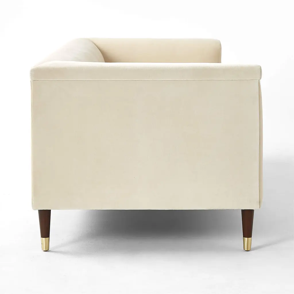A modern take on a classic silhouette, velvet sofa by London-based designer James Patterson is influenced by vintage English designs. Capped with brass ferrules, its tapered walnut legs are crafted by hand to support a long, sleek frame with a tight tufted back cushion and sloped arms. Ideal for more formal lounging. CB2 exclusive.