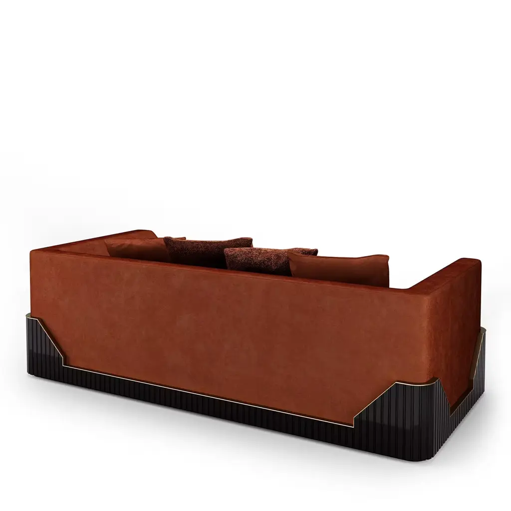 On-trend style meets clean lines to give this velvet-upholstered sofa in a beautiful rust color a look that instantly elevates your home aesthetic. A lacquered wood structure and metal detailing on the bottom corners gives a bit of edge to this contemporary sofa with a low back and angular armrests and that comes with four supporting cushions.