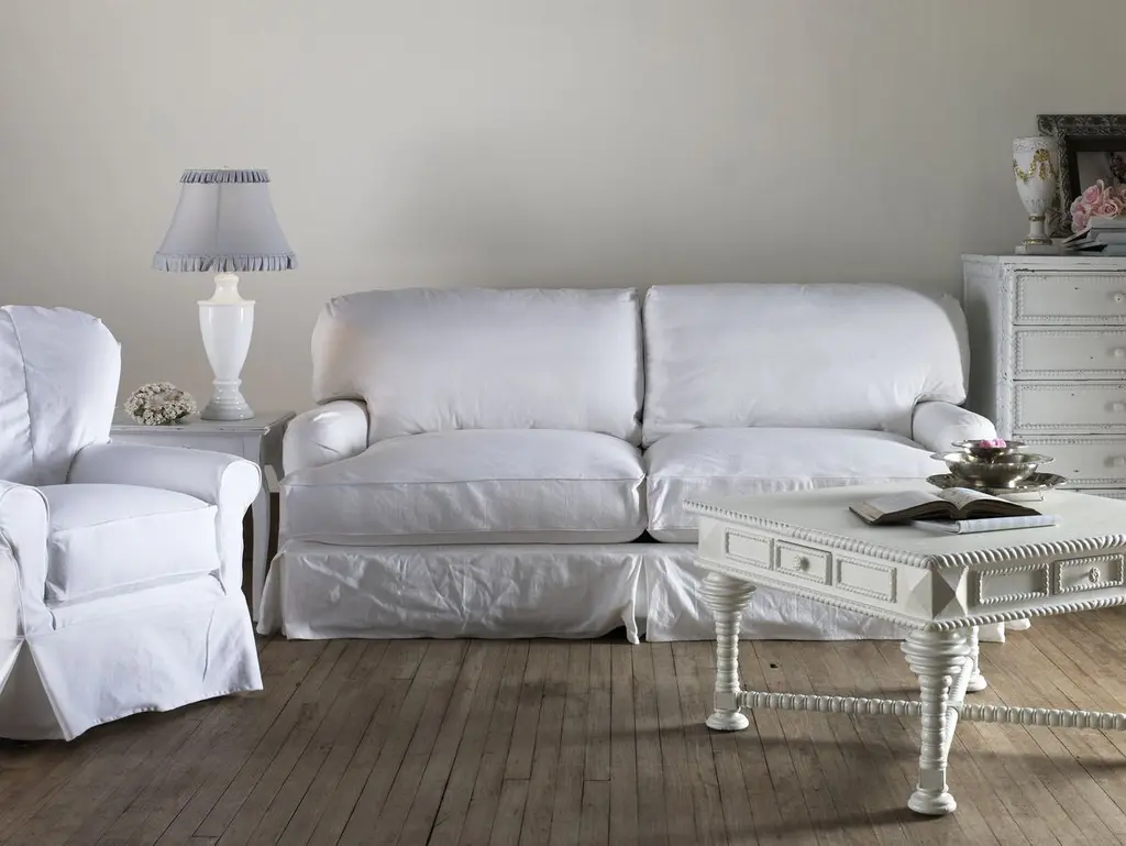With its wavy welt lines, comfort wrinkles, and an unlined skirt, this slipcovered sofa epitomizes laid-back elegance. Its deep, plush seating has a soft yet supportive construction that will cradle your body's contours. The prewashed slipcover, in Charleston Snow, is machine washable for easy maintenance. The plush piece features cushions made of 1.8 density foam and wrapped in a combination of ticking and fiber, as well as back pillows made of microdenier fiber. Includes two matching 18" x 18" throw pillows. Handcrafted in the USA.The Rachel Ashwell collection blends English elegance with California casual. The result is the eclectic aesthetic made famous by Shabby Chic designer Rachel Ashwell, which was founded on the philosophy of comfort, the beauty of imperfections, the allure of timeworn objects, and the appeal of simple, practical living. Perfect for creating classic and inviting settings, every piece in this line offers uncomplicated elegance and timeless appeal. “This collection is all about beautiful furniture that is both practical and scrumptiously comfortable,” Ashwell says.