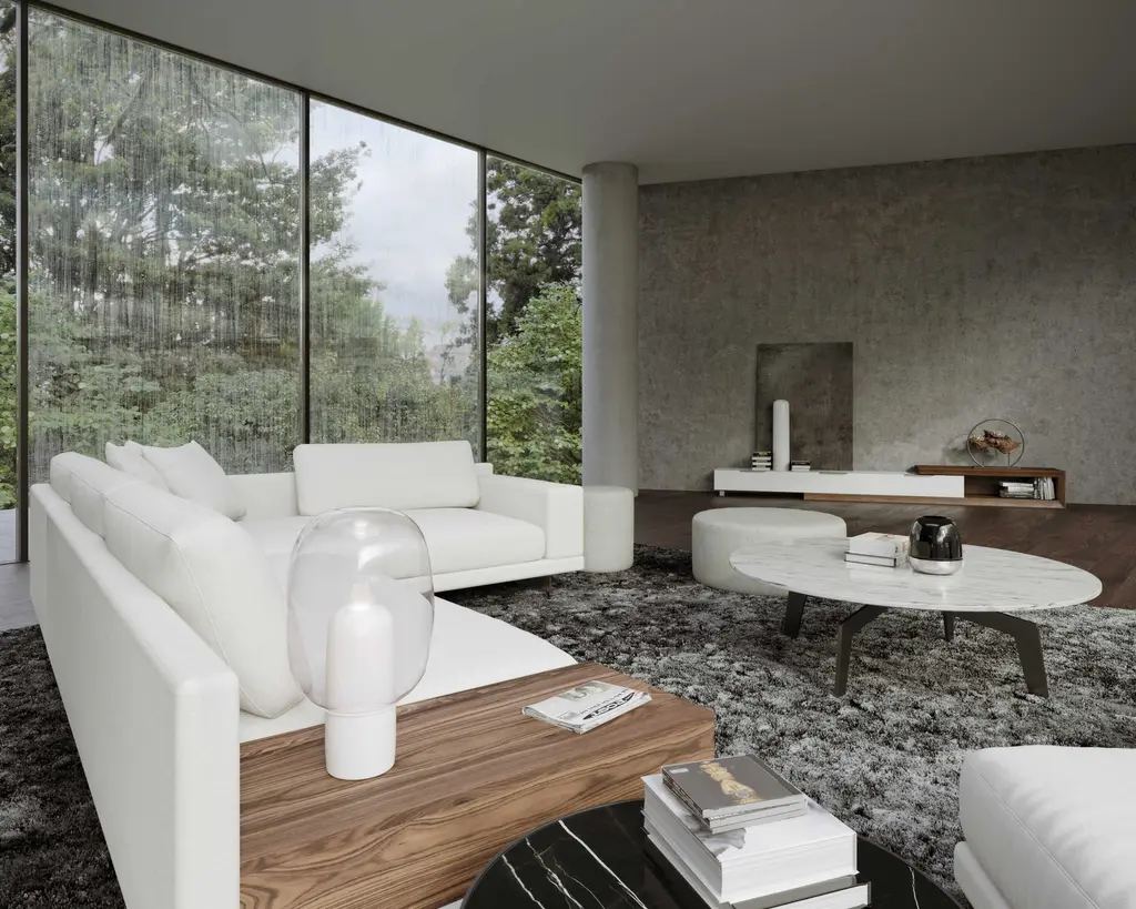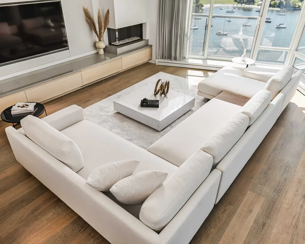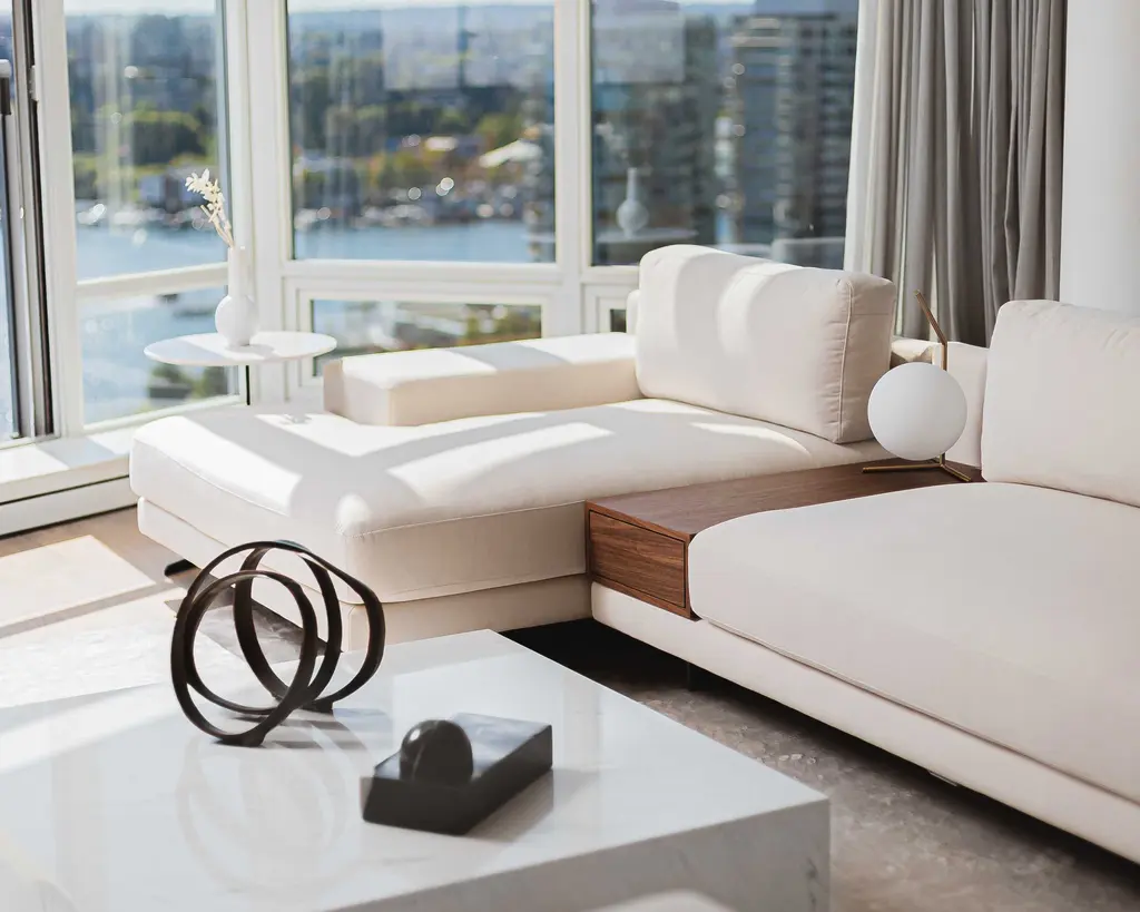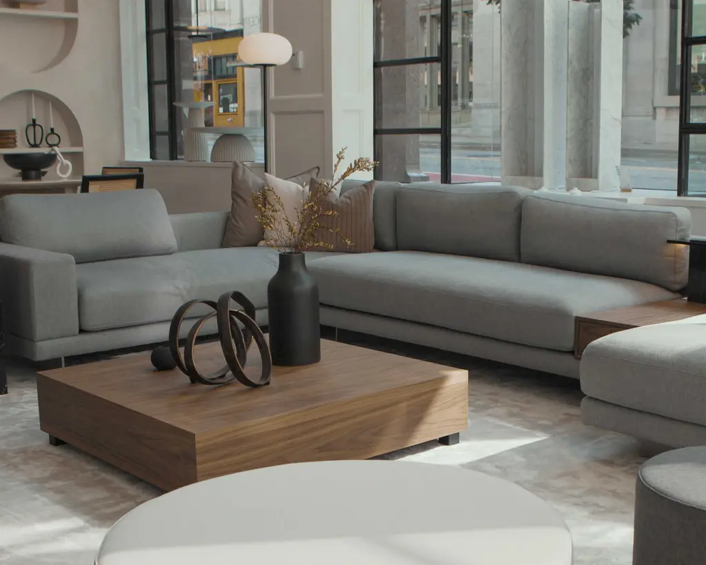 Compelling in its simple yet cutting edge style, the Dresden modular collection is a bold take on contemporary design. The sleek, low profile frame is met with grand cloud-like seat cushions to create the statement making structure. The Dresden also balances the expansive seating with an interchangeable side table insert that is offered in walnut, natural, and white lacquer finishes. Grounded on cast stainless steel legs with an elegant brushed finish, this piece's thoughtful composition demonstrates an exceptional opportunity for modern luxury in your home. See the entire Dresden Collection here.Learn more about the Dresden design here.