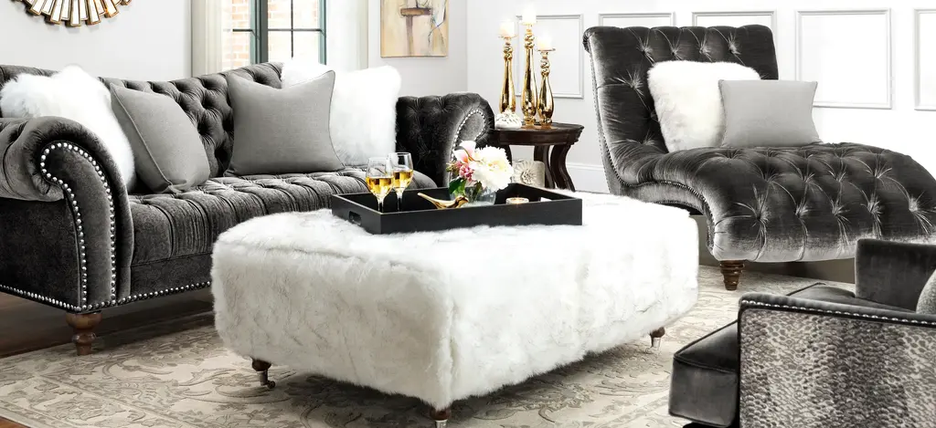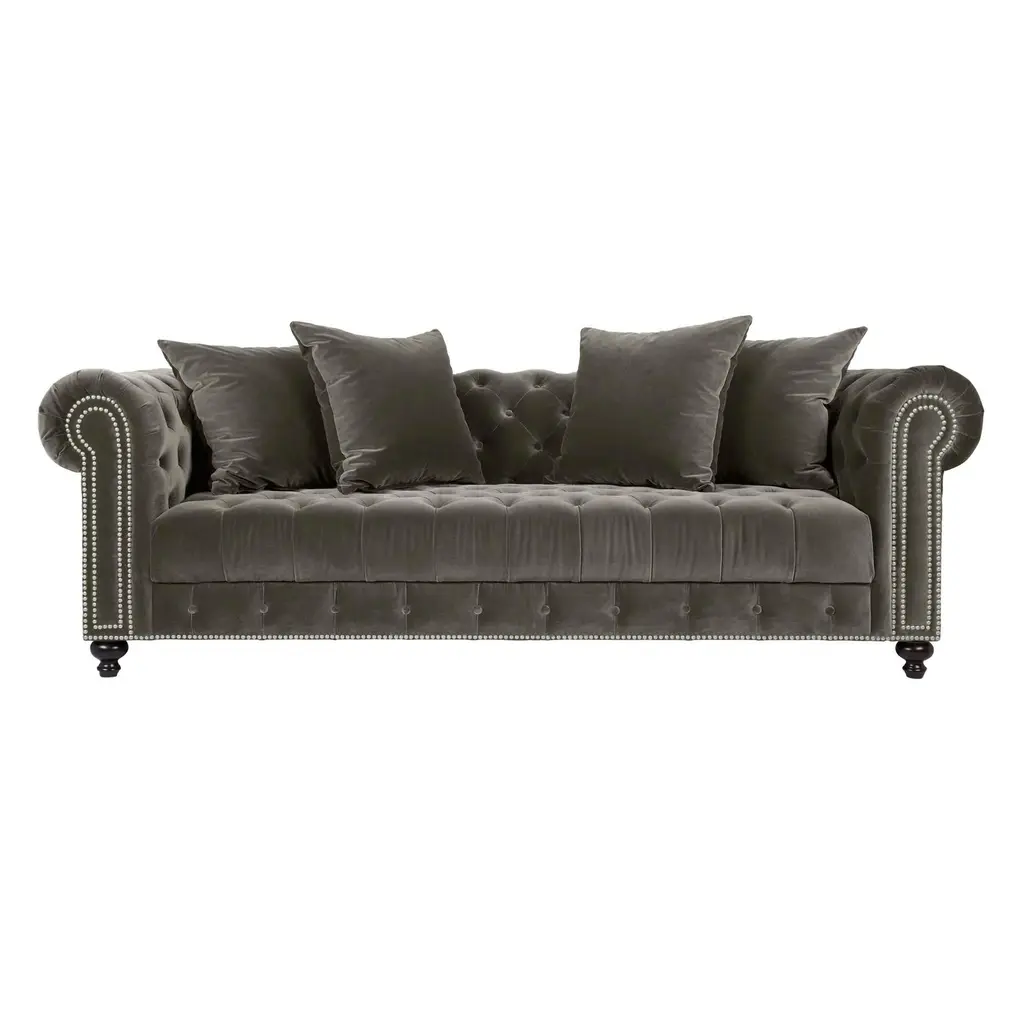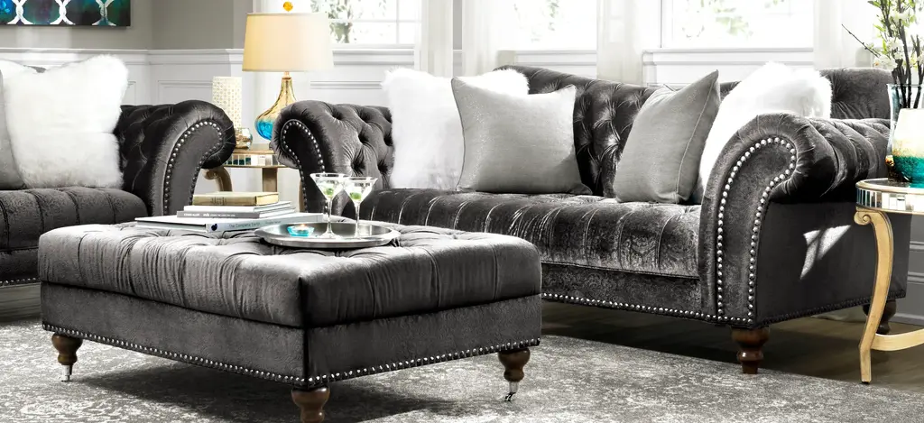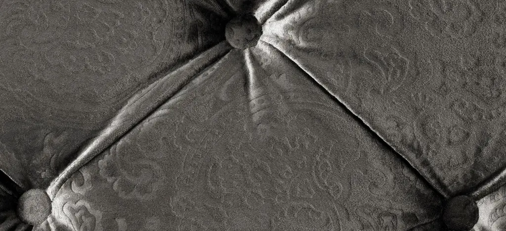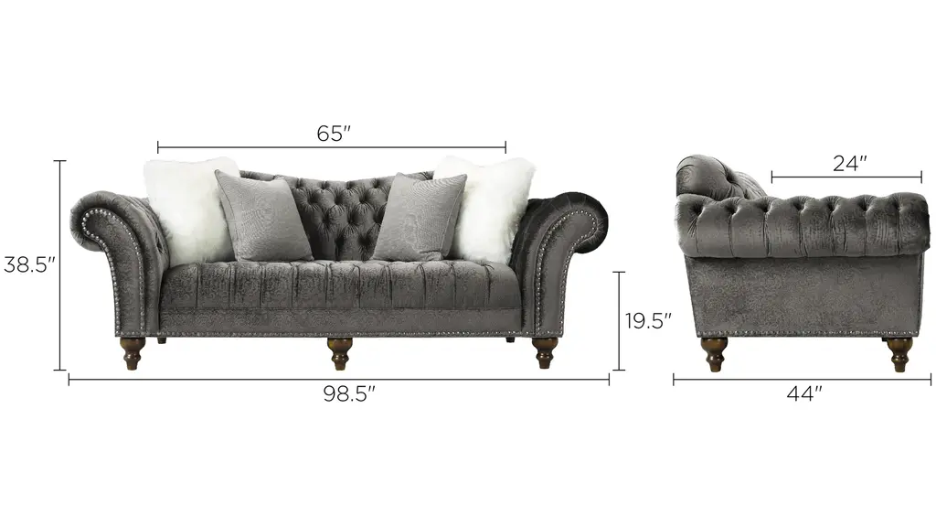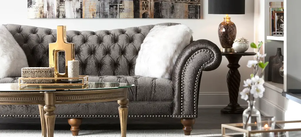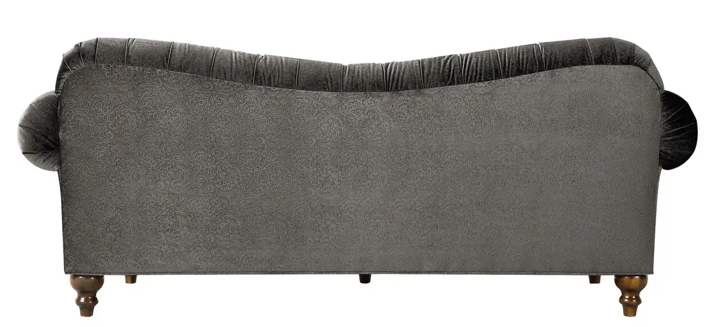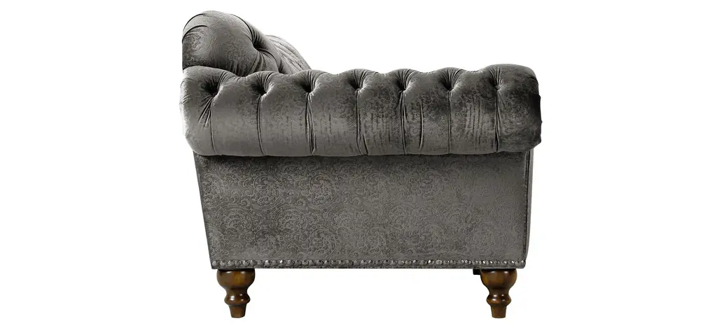 The Duchess sofa's name is quite befitting, since this lavish piece radiates opulence. Velvet-look upholstery provides indulgent comfort, and the subtle gray-on-gray pattern offers plenty of allure. Plus, impress your guests whenever you entertain with exquisite features like dramatically curved roll arms, button tufting and thick nailhead trim.