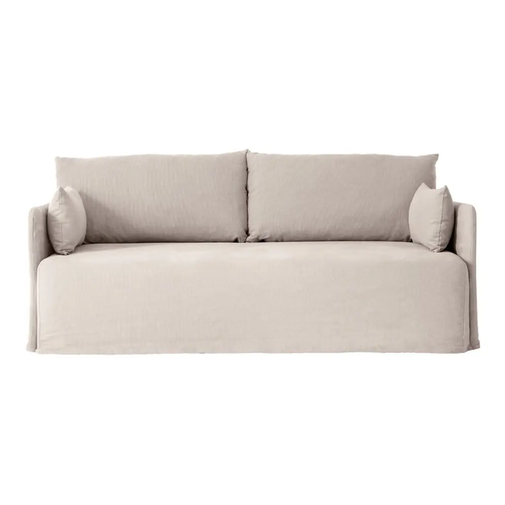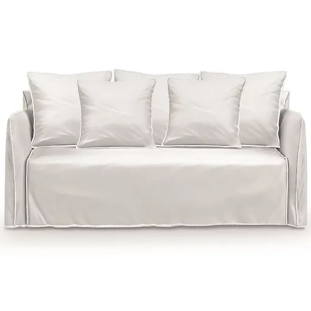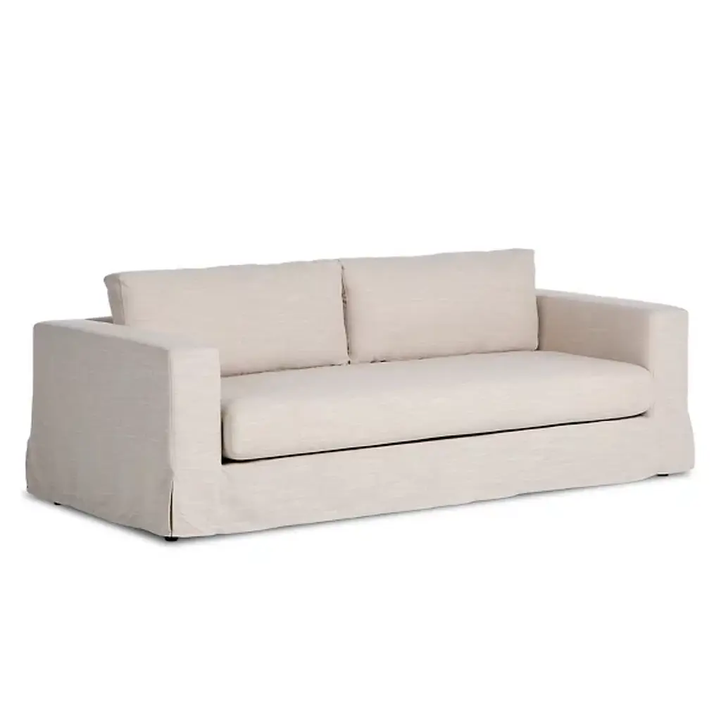 This spacious slipcover sofa lends ample seating with its elongated size, plush bench seat, and back cushions. Two matching bolster pillows adorn each side for a cohesive look. Style in a living room paired with throw pillows for a touch of casual sophistication.