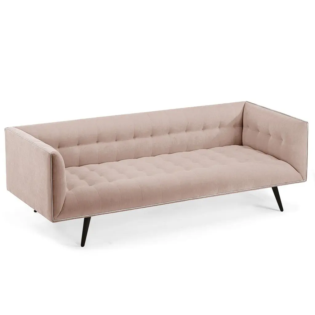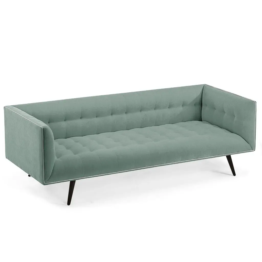 The Dust Sofa is constructed in solid wood, with an elevated tufted elegant look and a comfortable seating. Handmade with a solid wood base and wood legs with a stylish polished brass metal feet detail. Available as an option.The Dust Sofa is available in a number of different materials, finishes and combinations.Wood finish and upholstery can be fully customizedCOM Available: Small sofa: 12.5 yards, medium sofa: 13.5 yards, large sofa: 14.5 yardsMaterialUpholstery: Velvet Fabric, Boucle Fabric, COMWood legs: Solid wood Base, Metal Foot Detail (on demand)DimensionsAvailable in 3 sizesSmall: W 63” x D 35” x H 28” - Seat height 16”Medium: W 78” x D 35” x H 28” - Seat height 16”Large: W 86” x D 35” x H 28” - Seat height 16”Customers can choose from fabric options: Aluminium, Paris Mouse, Paris Safira, Paris Dark Blue, Teal, Smooth 60, Paris Green, Paris Lavanda, Vigo Blossom, Paris Brick, Boucle Snow, Barcelona Lotus, Paris Black, Smooth 72, Vigo Plantain, Corn.