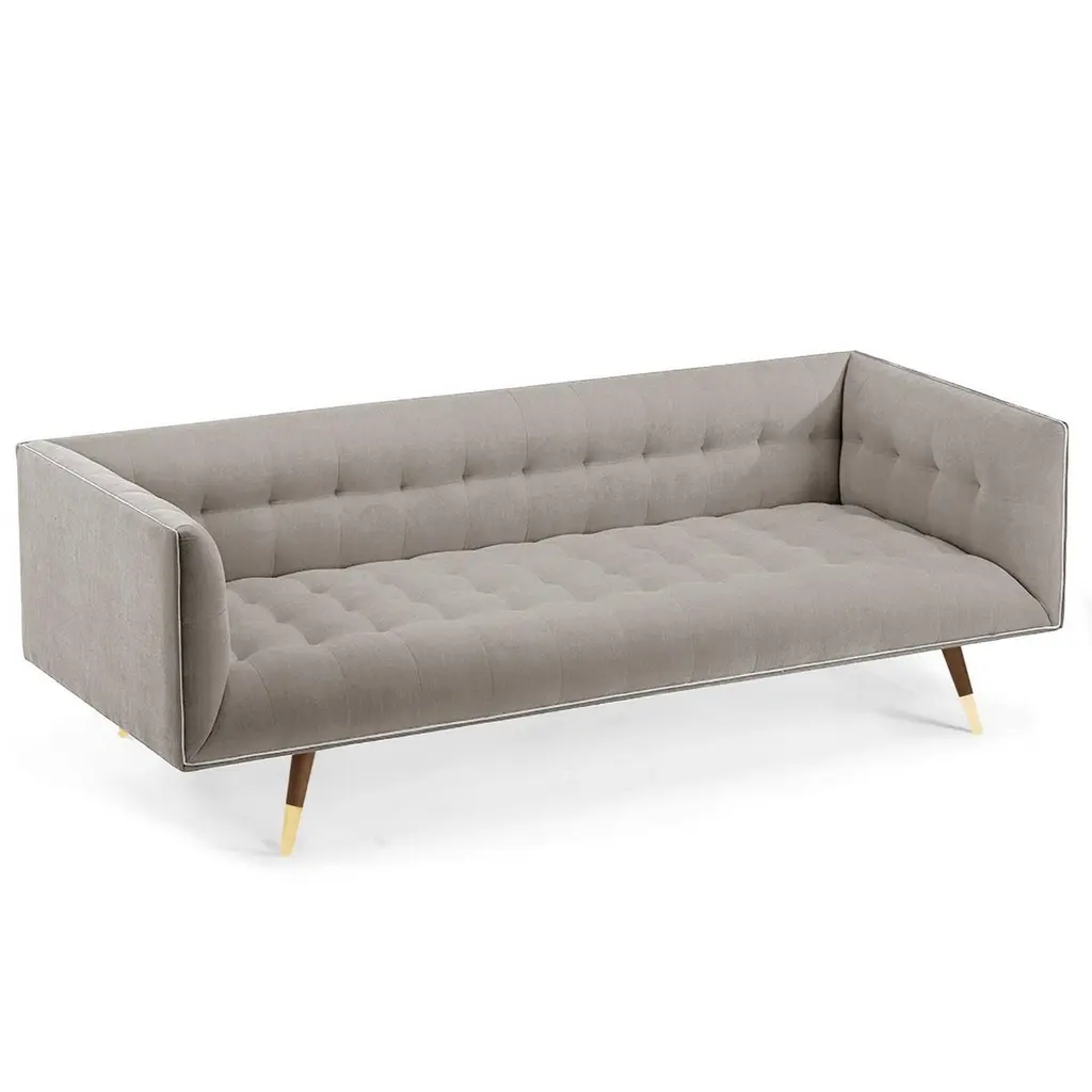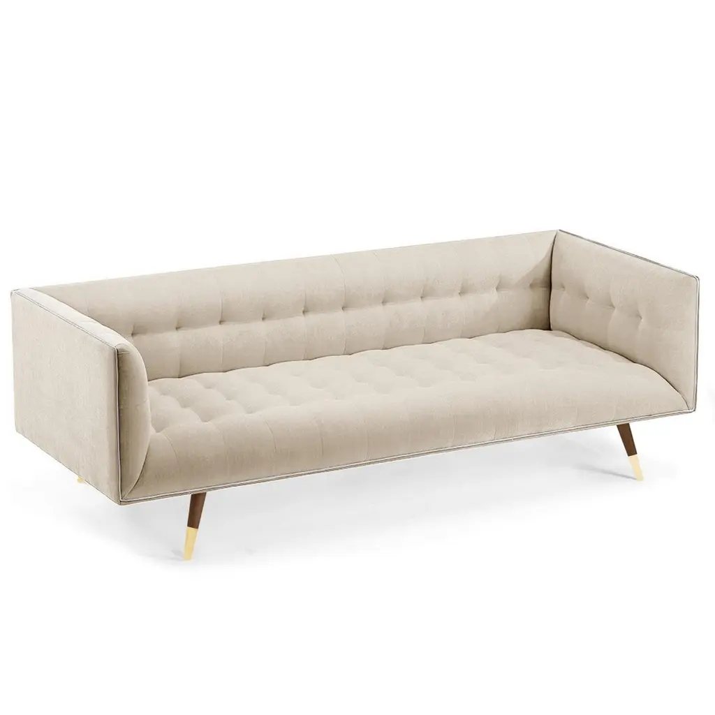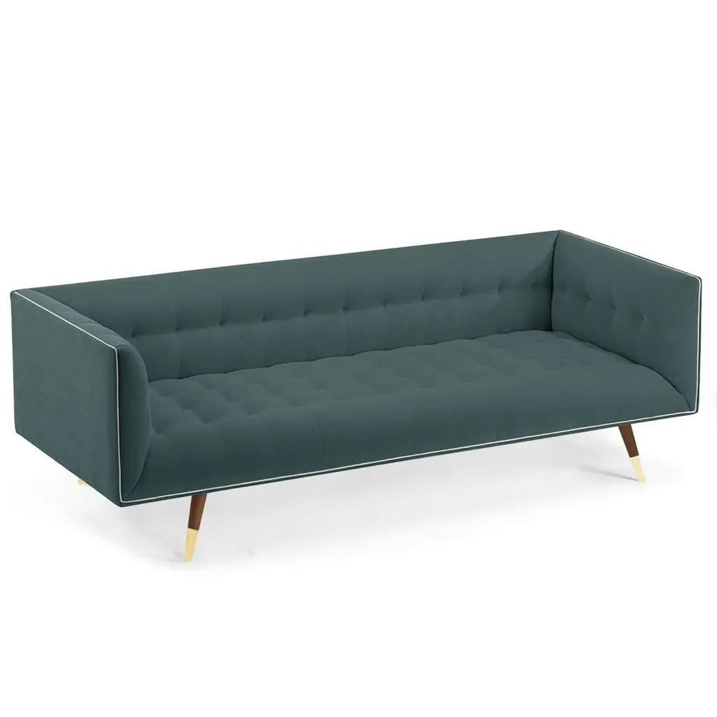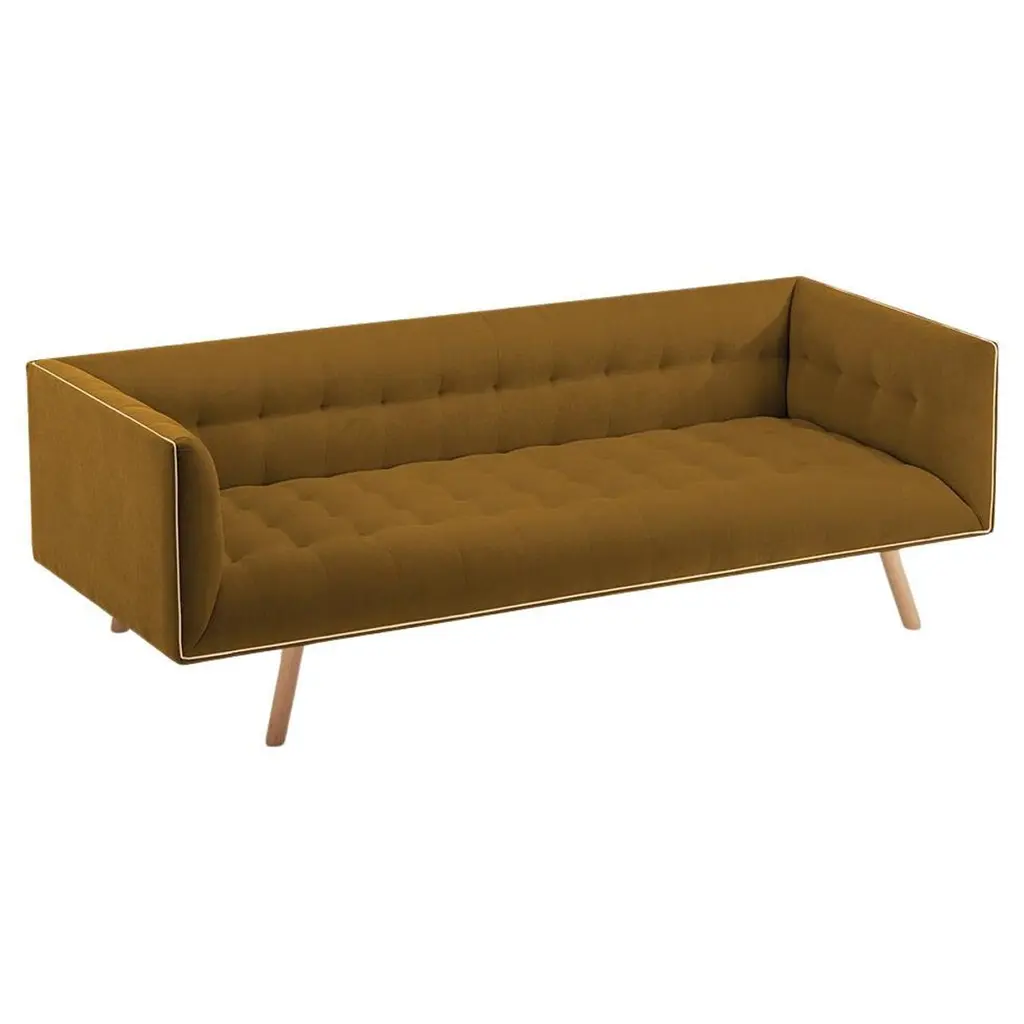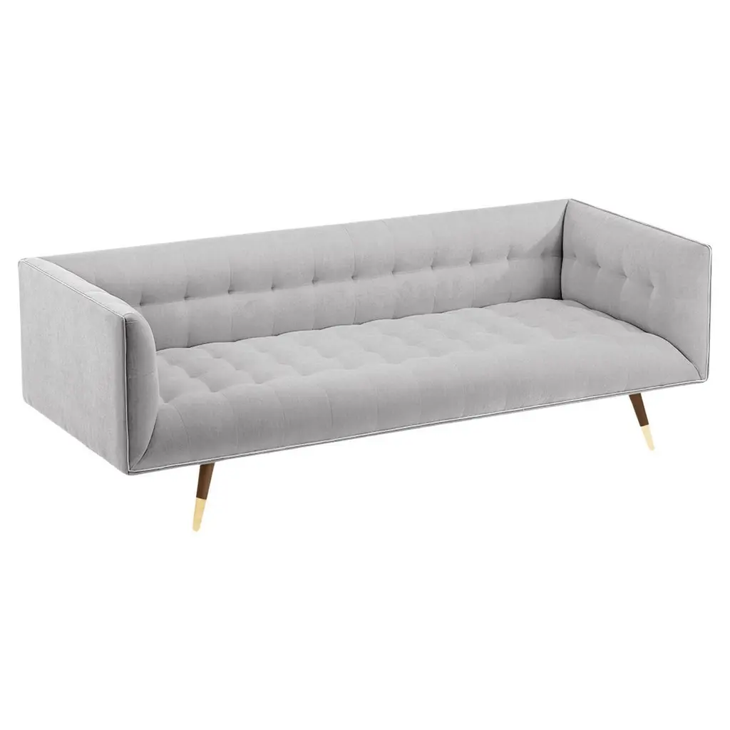 The Dust Sofa is constructed in solid wood, with an elevated tufted elegant look and a comfortable seating. Handmade with a solid wood base and wood legs with a stylish polished brass metal feet detail. Available as an option.The Dust Sofa is available in a number of different materials, finishes and combinations.Wood finish and upholstery can be fully customizedCOM Available: Small sofa: 12.5 yards, medium sofa: 13.5 yards, large sofa: 14.5 yardsMaterialUpholstery: Velvet Fabric, Boucle Fabric, COMWood legs: Solid wood Base, Metal Foot Detail (on demand)DimensionsAvailable in 3 sizesSmall: W 63” x D 35” x H 28” - Seat height 16”Medium: W 78” x D 35” x H 28” - Seat height 16”Large: W 86” x D 35” x H 28” - Seat height 16”Customers can choose from fabric options: Aluminium, Paris Mouse, Paris Safira, Paris Dark Blue, Teal, Smooth 60, Paris Green, Paris Lavanda, Vigo Blossom, Paris Brick, Boucle Snow, Barcelona Lotus, Paris Black, Smooth 72, Vigo Plantain, Corn.