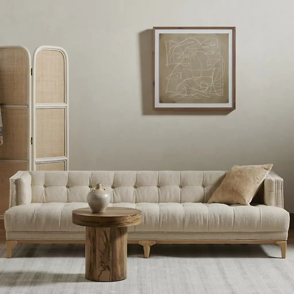 Four Hands presents the Dylan Sofa. With its low, tight back, this sofa offers both comfort and a streamlined aesthetic. The solid parawood framing ensures durability and stability, while the squat, exposed legs add flair. The clean-lined arms complement the overall mid-century silhouette, creating a time-tested look that suits various decor styles. The blind tufting detail adds a subtle texture and visual interest, enhancing the sofa’s elegance. The Dylan Sofa effortlessly combines form and function, making it the perfect centerpiece for your living space.