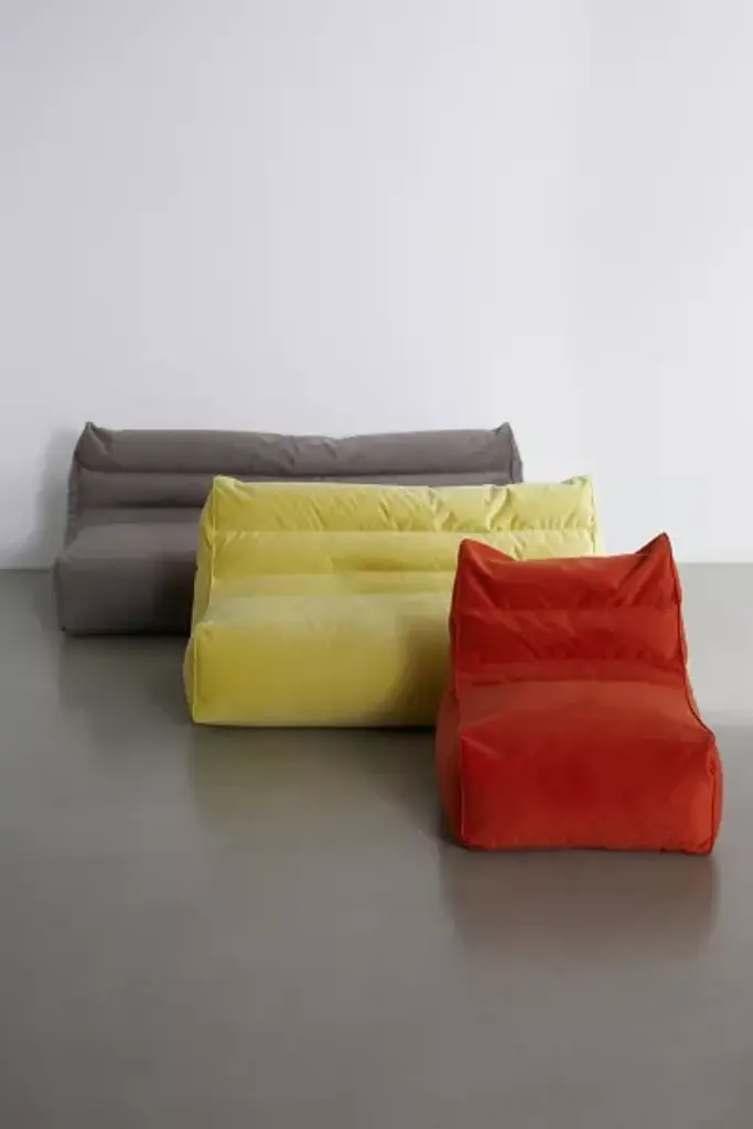 Curate the coziest space with this oversized bean bag in a legless silhouette that’s perfect for lounging. Features an integrated backrest with a luxuriously plush velvet cover. Complete with a bead fill that offers support while you relax. This custom furniture piece will be made to order just for you. **Features** \- Retro-cool bean bag sofa \- Legless silhouette \- Luxe velvet cover \- Bead filling offers a supportive seat \- Cozy dorm room furniture \- Available in a range of sizes - mix and match to create a cozy seating area perfectly fit for your space \- Made to order just for you **Content + Care** \- Arrives fully assembled \- 100% Velvet polyester; expanded polystyrene beads \- Spot clean \- Made in the USA **Size** Single Seater \- Dimensions: 32"l x 30"w x 28"h \- Seat height: 13" \- Interior seat dimensions: 30"l x 22" w x 13"h \- Weight: 15 lbs \- Shipping package dimensions: 32.5"l x 27.25" w x 25.63"h \- Shipping package weight: 17 lbs Love Seat \- Dimensions: 53"l x 35"w x 28"h \- Seat height: 13" \- Interior seat dimensions: 53"l x 22" w x 13"h \- Weight: 24 lbs \- Shipping package dimensions: 65"l x 36.9"w x 30.5"h \- Shipping package weight: 27 lbs Full-Size Sofa \- Dimensions: 71"l x 35"w x 28"h \- Seat height: 13" \- Interior seat dimensions: 71"l x 22" w x 13"h \- Weight: 33 lbs \- Shipping package dimensions: 83.75"l x 36.25"w x 28.75"h \- Shipping package weight: 36 lbs