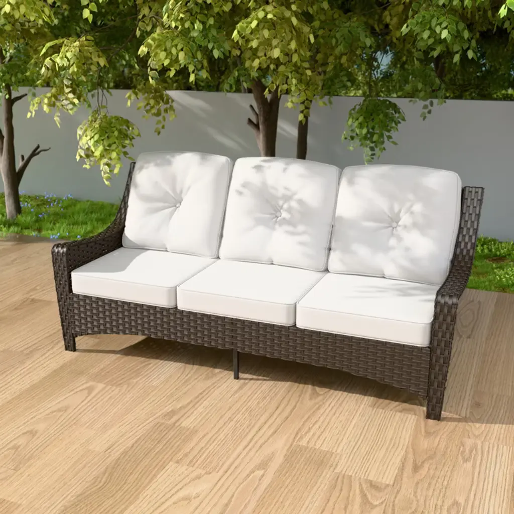 The EAGLE PEAK outdoor patio 3-seat sofa is made with high-quality hand-woven PE wicker and a sturdy frame. Its cozy cushions and wide armrests provide ultimate relaxation, and its all-weather design ensures it’s perfect for any season. With its classic brown wicker, this patio sofa adds warmth and style to your patio, garden, or poolside area.