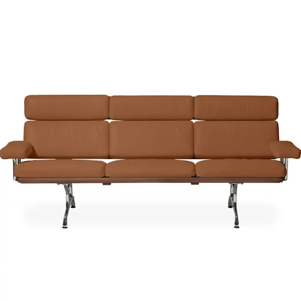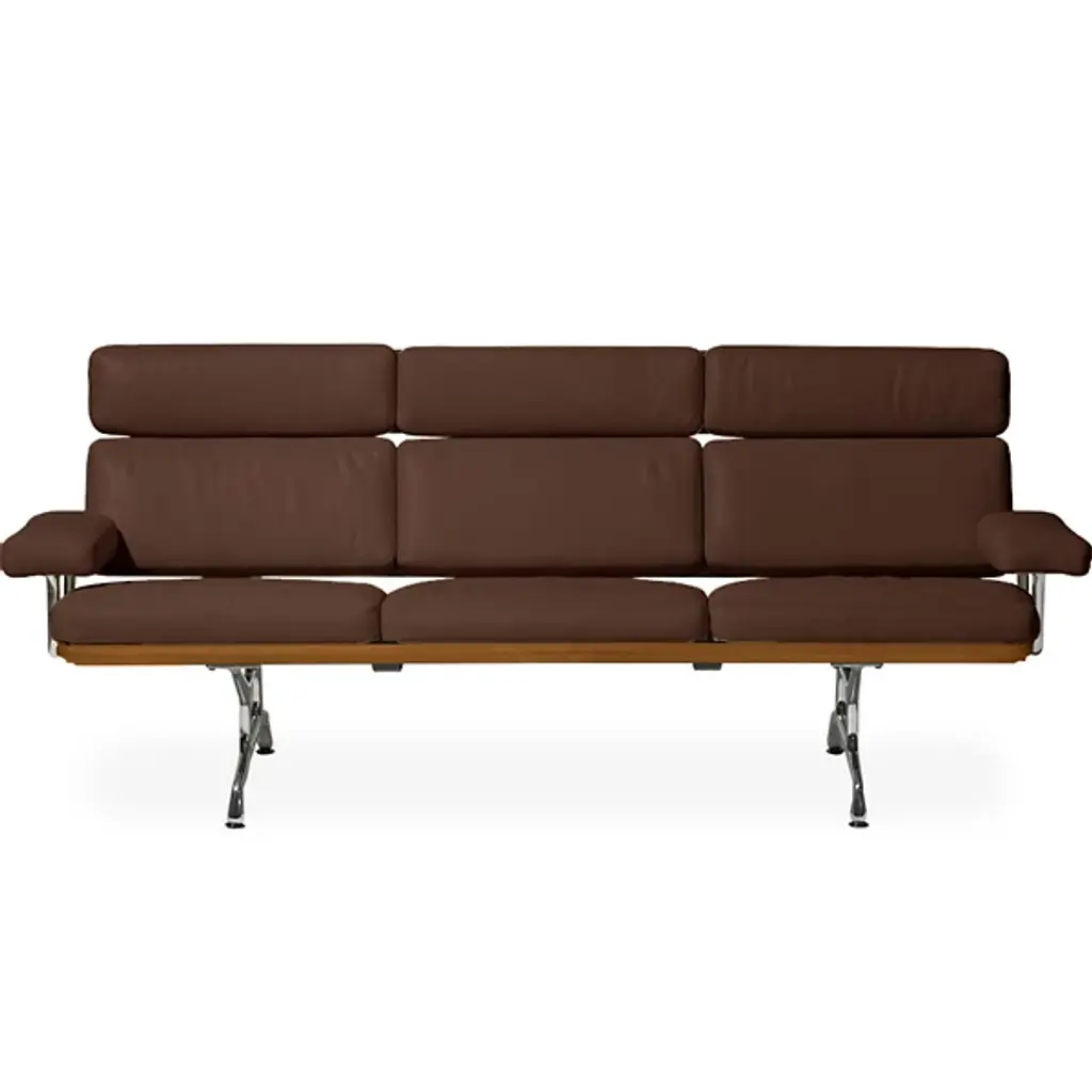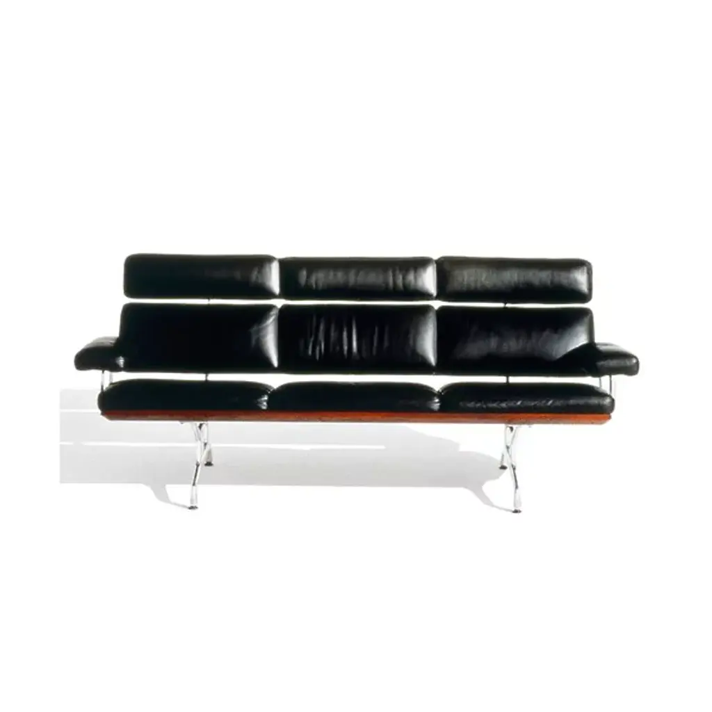 Manufacturing of the Eames 3-Seat Sofa by Herman Miller began in 1984 and stands as one of the last designs from the Eames Office. This beautifully balanced design exemplifies the best in modern furniture design. Its angled profile and clean planes are highlighted by a beautiful Walnut or Teak back, soft leather seating, and a Polished Aluminum base. Suited to both home and office applications, the 3-Seat Sofa features three-over-three cushioned seating with low armrests.