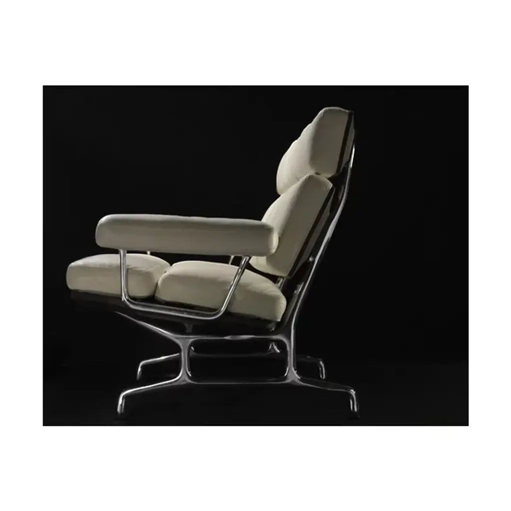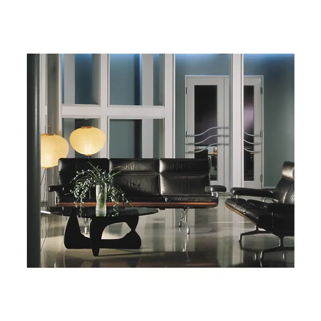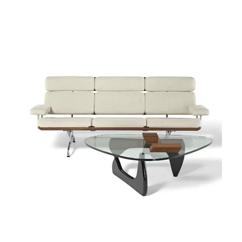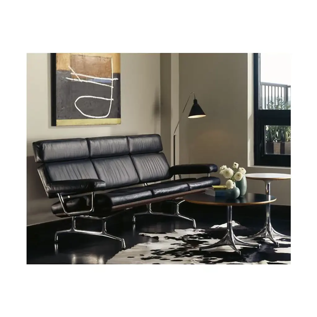 Manufacturing of the Eames 3-Seat Sofa by Herman Miller began in 1984 and stands as one of the last designs from the Eames Office. This beautifully balanced design exemplifies the best in modern furniture design. Its angled profile and clean planes are highlighted by a beautiful Walnut or Teak back, soft leather seating, and a Polished Aluminum base. Suited to both home and office applications, the 3-Seat Sofa features three-over-three cushioned seating with low armrests.