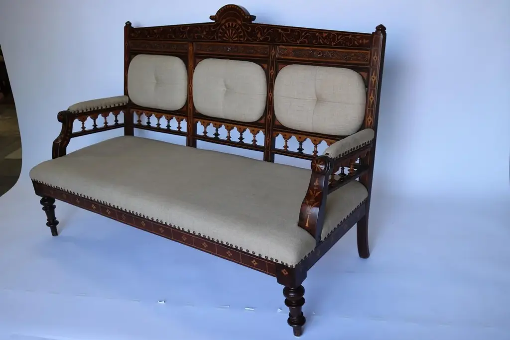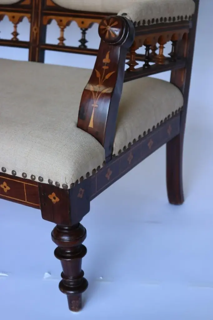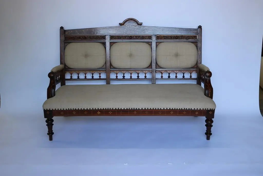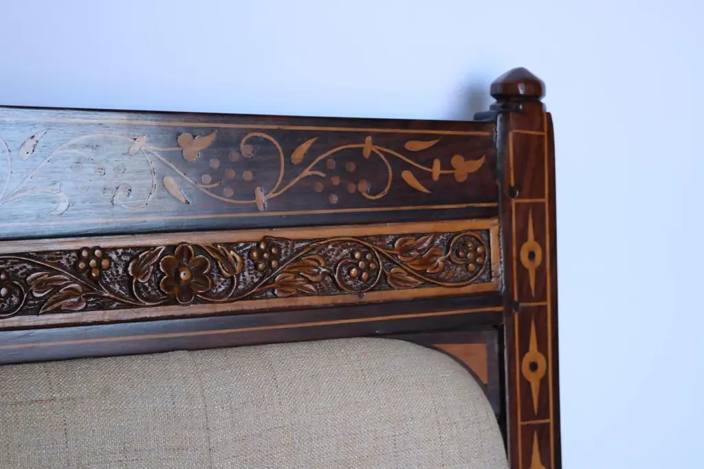 Pair of satin Wood beautiful inlaid love seat from India. With hand carved panels. early 20th century. We found the pair in New Delhi India. Needs to be re upholstered
